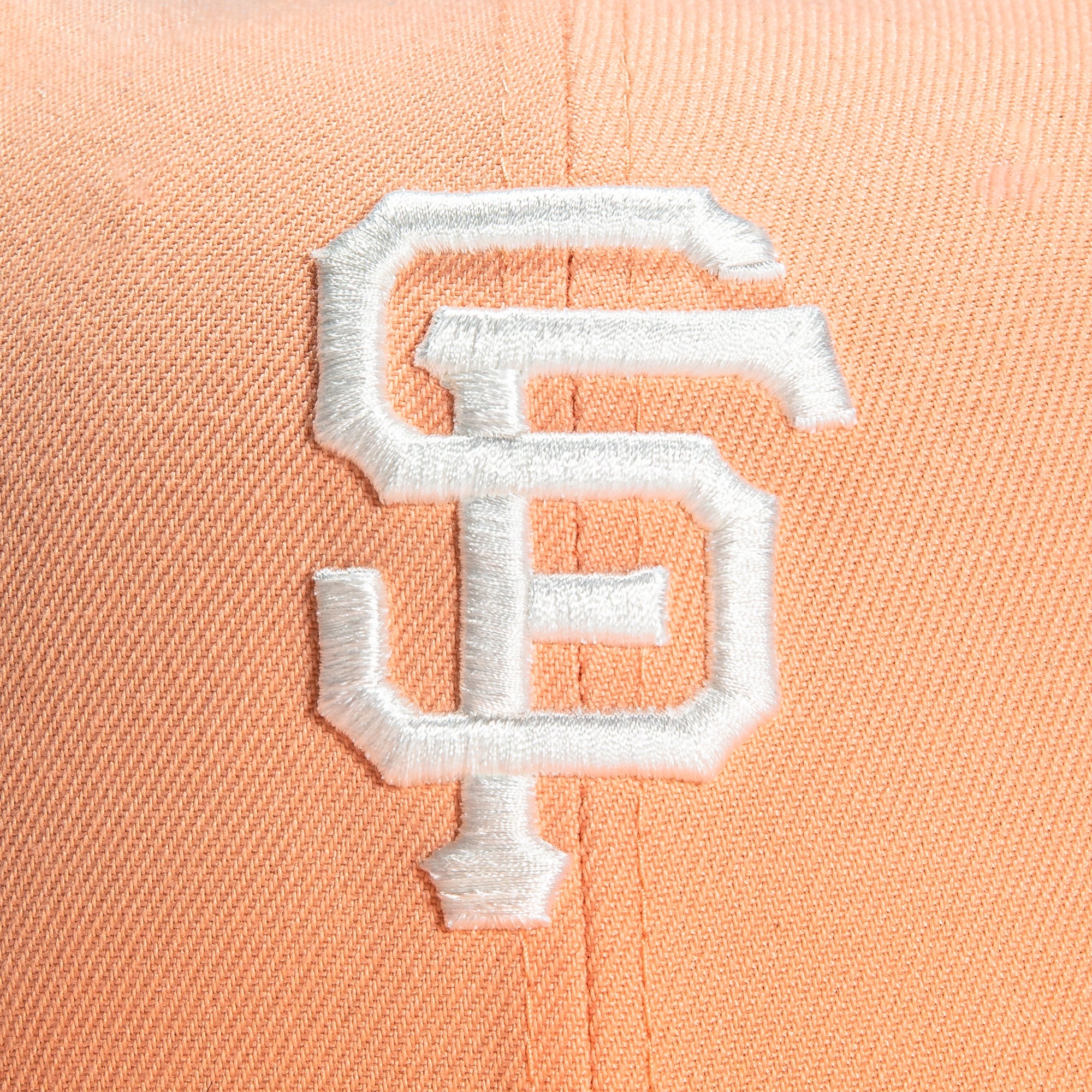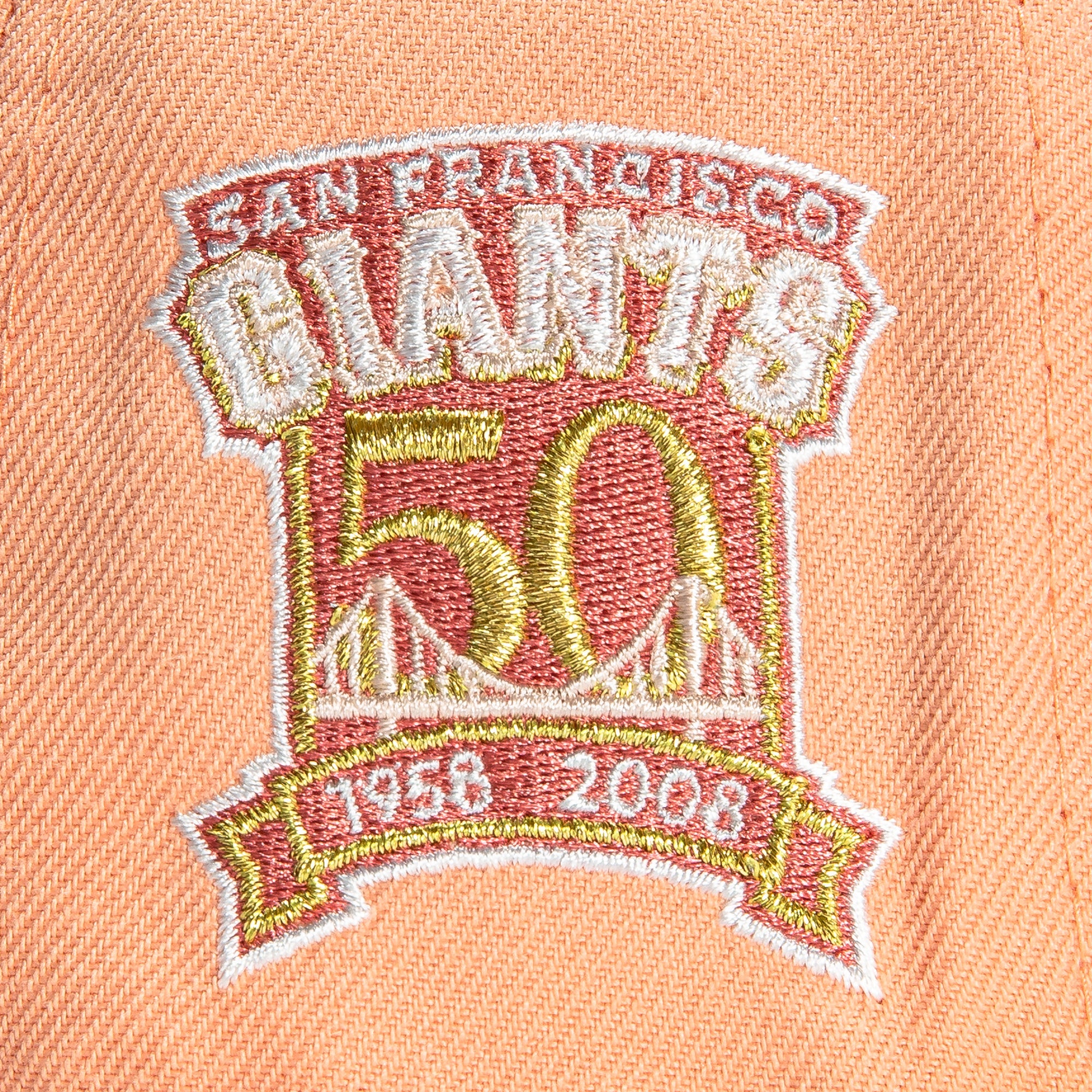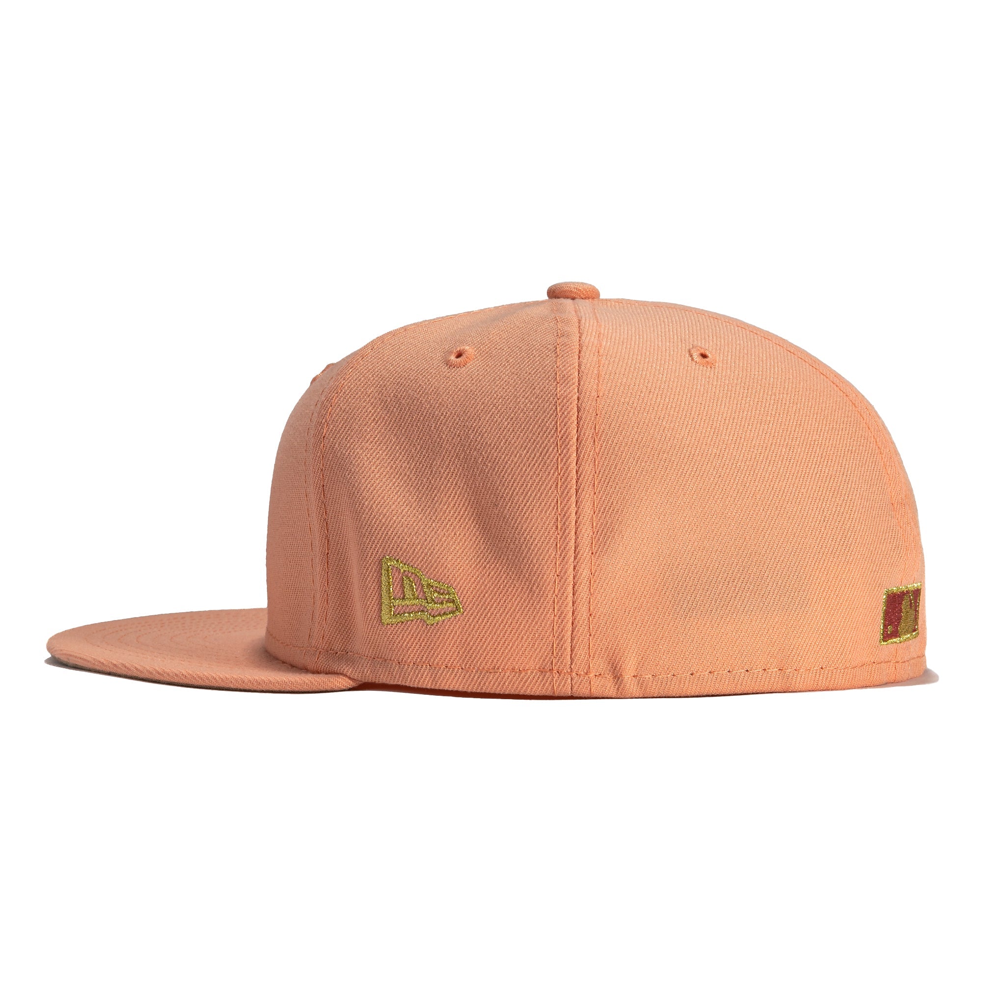 This New Era Rose Gold San Francisco Giants 50th Anniversary 59FIFTY Fitted Hat were originally released by Hat Club. The fitteds have a red rose, stone and apricot colorway with a six panel structured high crown embroidered eyelets and a fabric squatchee button. The fitted cap also has a flat bill with a color undervisor. The front panel features the San Francisco Giants logo embroidery and a side patch embroidery on the right panel. These Rose Gold fitteds were released in 2022.