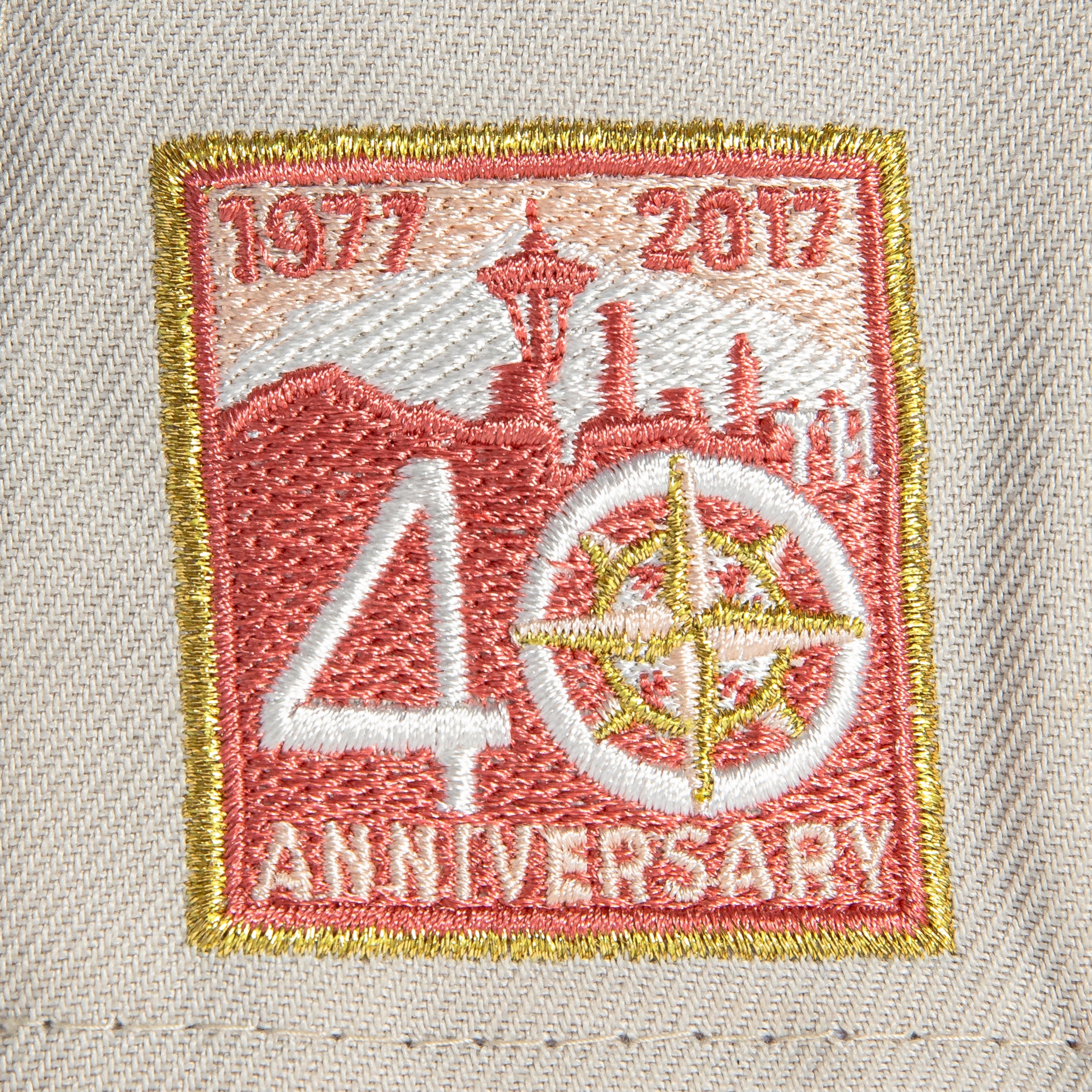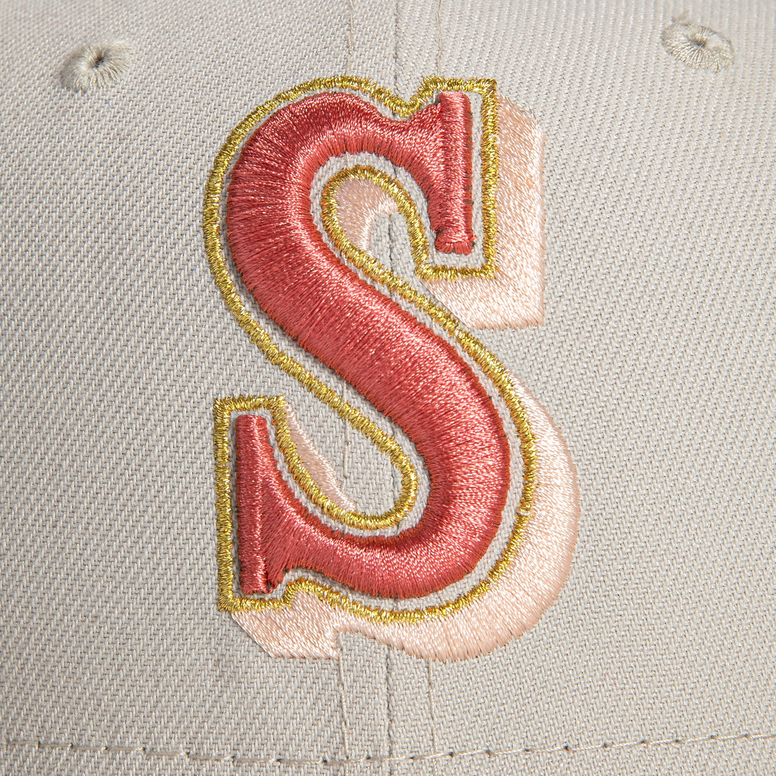 This New Era Rose Gold Seattle Mariners 40th Anniversary 59FIFTY Fitted Hat were originally released by Hat Club. The fitteds have a red rose, stone and apricot colorway with a six panel structured high crown embroidered eyelets and a fabric squatchee button. The fitted cap also has a flat bill with a color undervisor. The front panel features the Seattle Mariners logo embroidery and a side patch embroidery on the right panel. These Rose Gold fitteds were released in 2022.