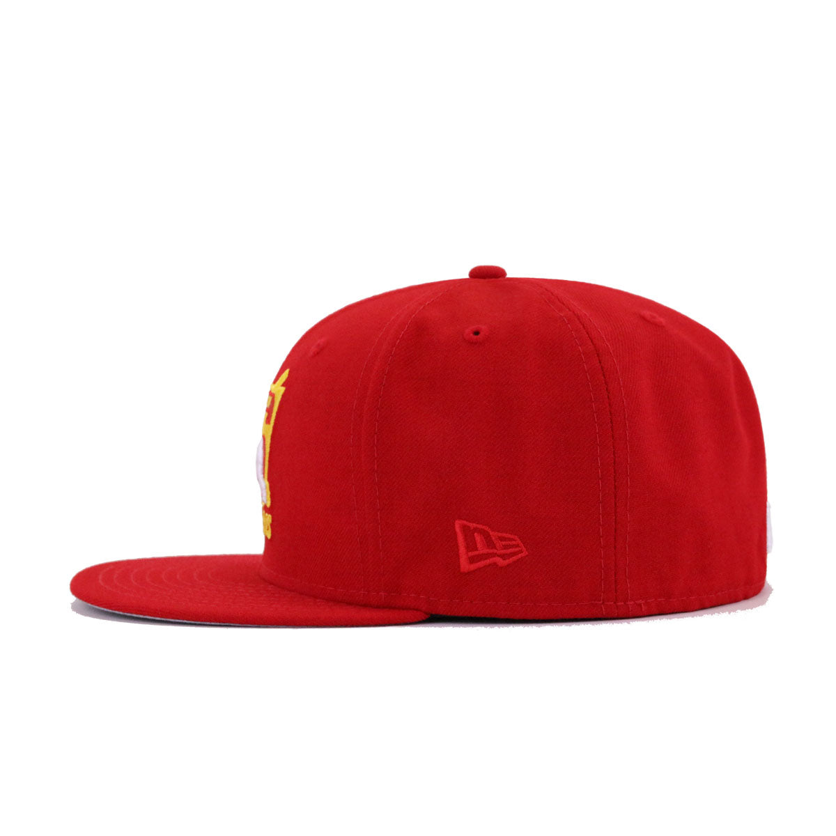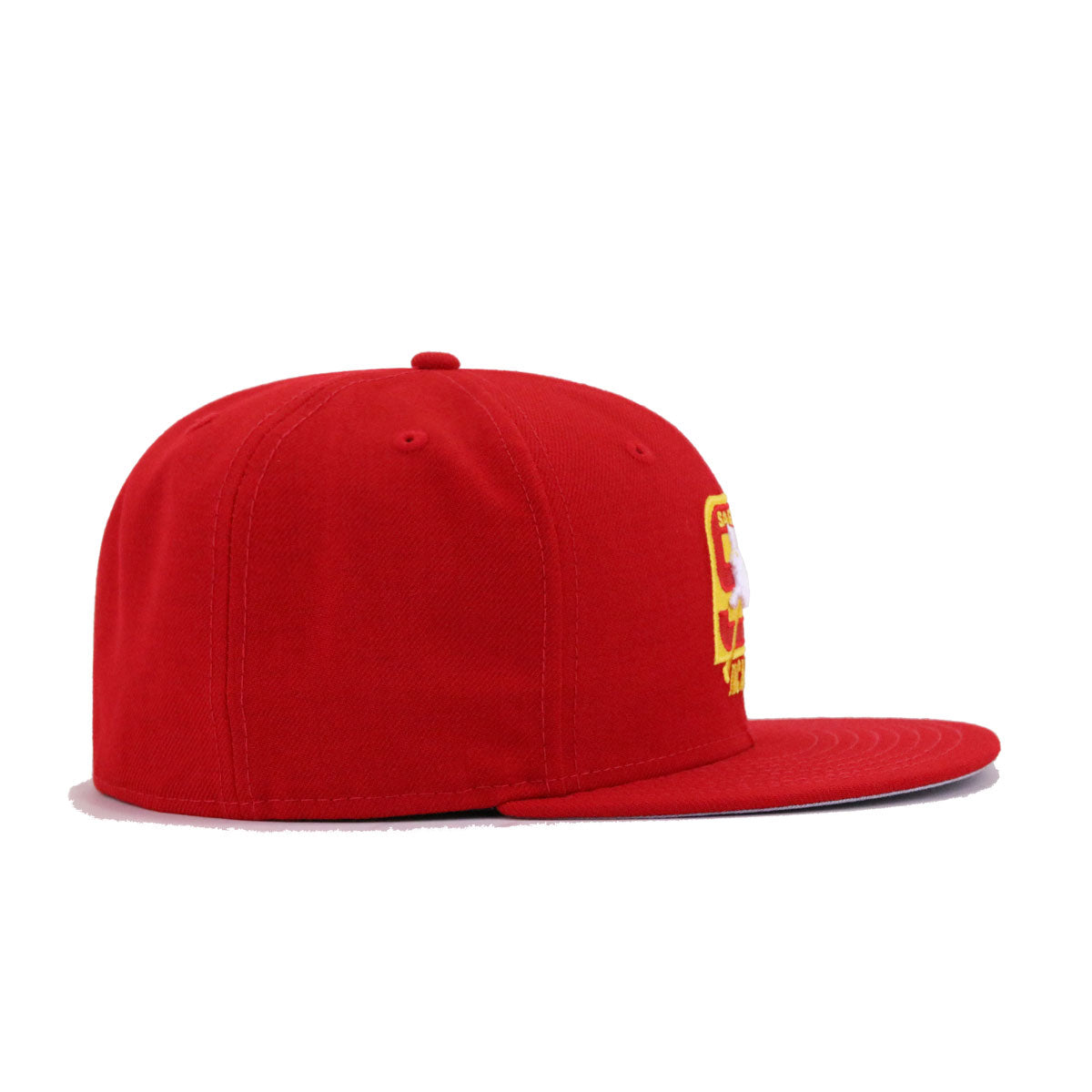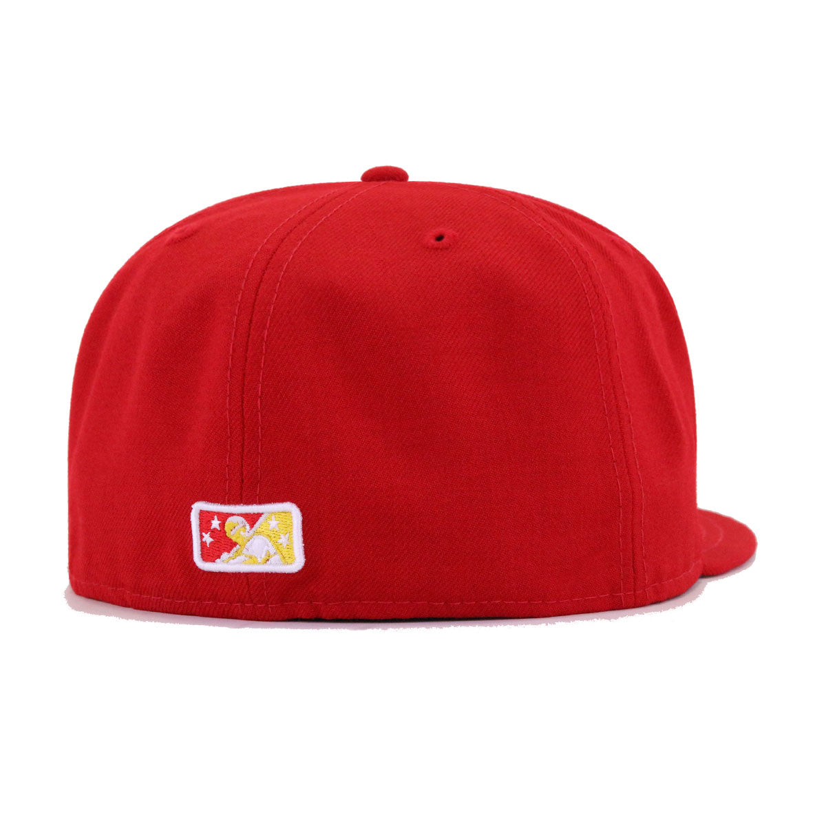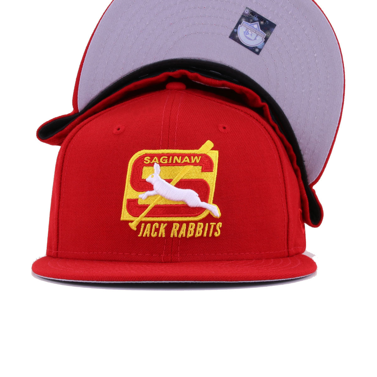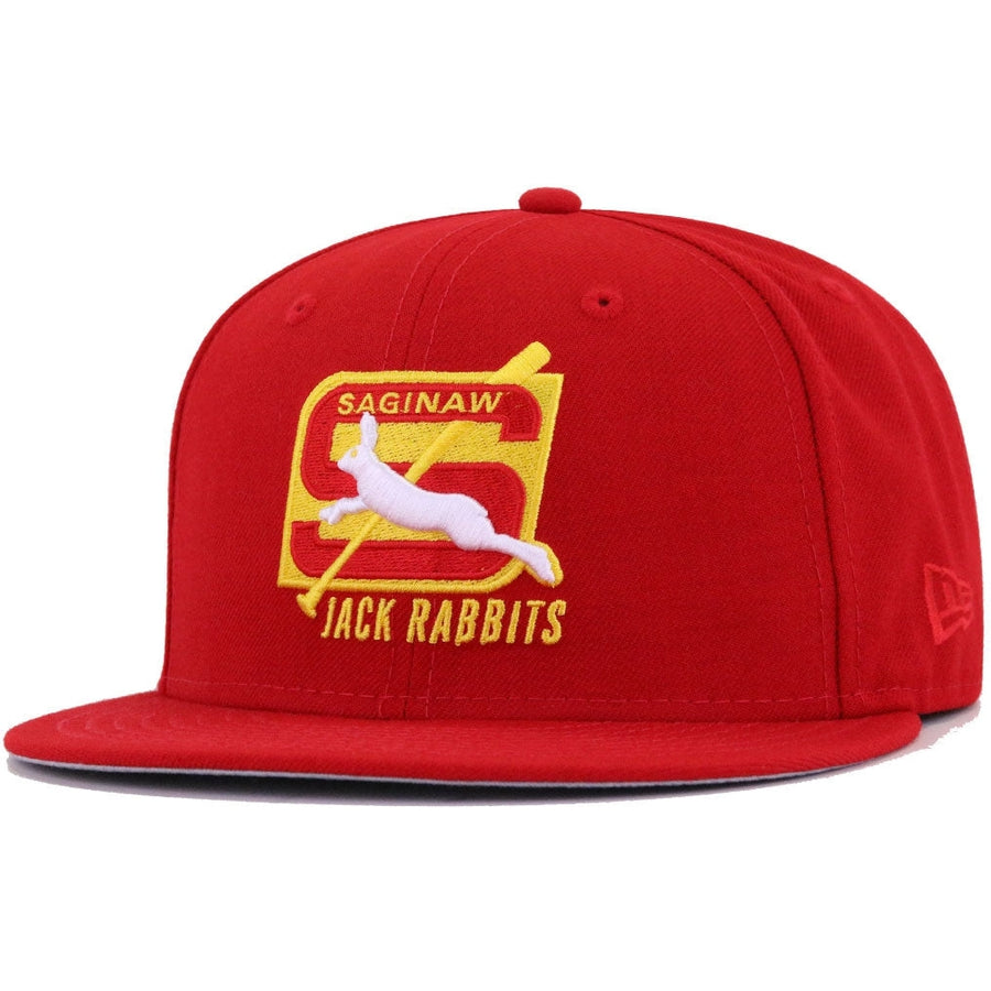 This New Era Saginaw Jack Rabbits Scarlet 59FIFTY Fitted Hat has a scarlet red six panel structured high crown and embroidered eyelets with a scarlet red fabric squatchee button. The fitted cap also has a scarlet red flat bill. The front panel features the Saginaw Jack Rabbits logo embroidery. The left panel of the fitted displays the New Era logo and the official MiLB logo embroidery on the rear crown.