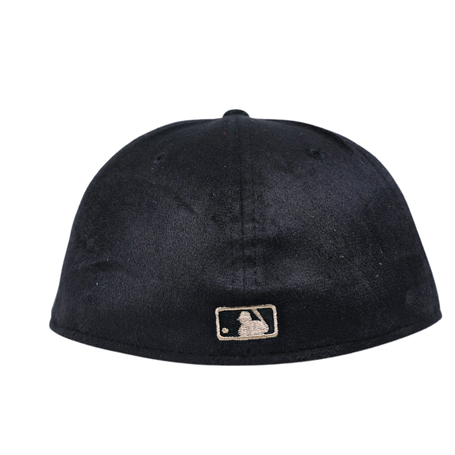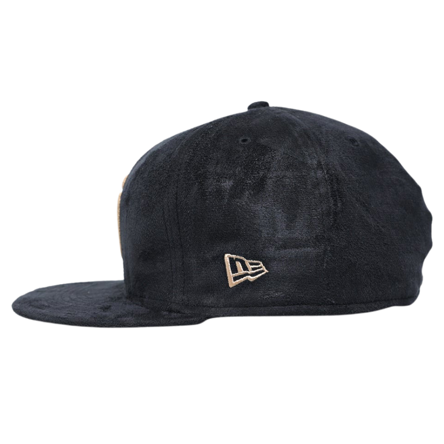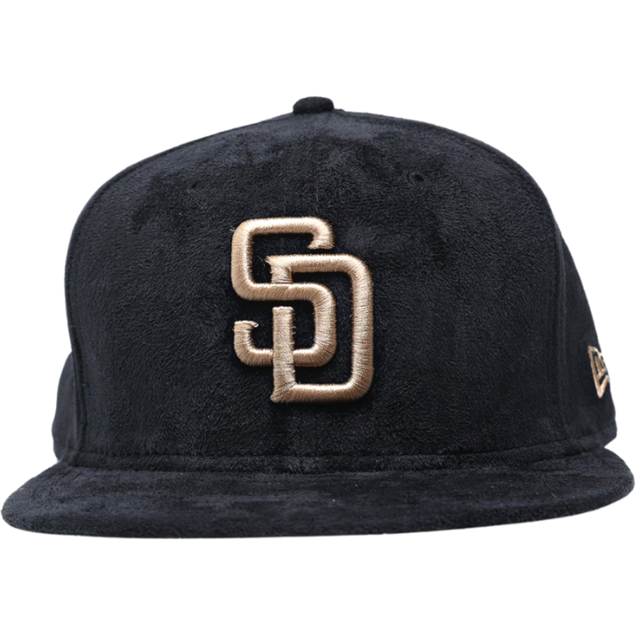 This New Era San Diego Padres 59FIFTY fitted hat has a black suede six panel structured high crown, embroidered eyelets and squatchee button. The flat bill of the fitted is also black suede with a black undervisor and sweatband. The front panel MLB team logo, left panel New Era logo and the official MLB Batterman logo on the back of the crown are embroidered in tan threads.
