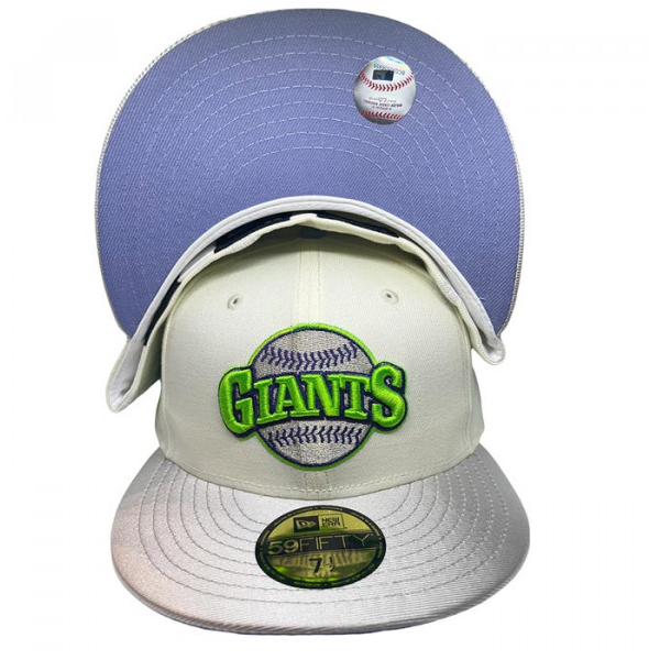This New Era San Francisco Giants Hyphy 1984 All-Star Game Lavender Undervisor 59FIFTY Fitted Hat has a white six panel structured high crown and embroidered eyelets with a purple fabric squatchee button. The fitted cap has a metallic silver flat bill with a lavender undervisor. The front panel features the San Francisco Giants logo embroidery and a 1984 ASG side patch embroidery on the right panel. The left panel of the fitted displays the New Era logo and the official MLB logo embroidery on the rear crown.