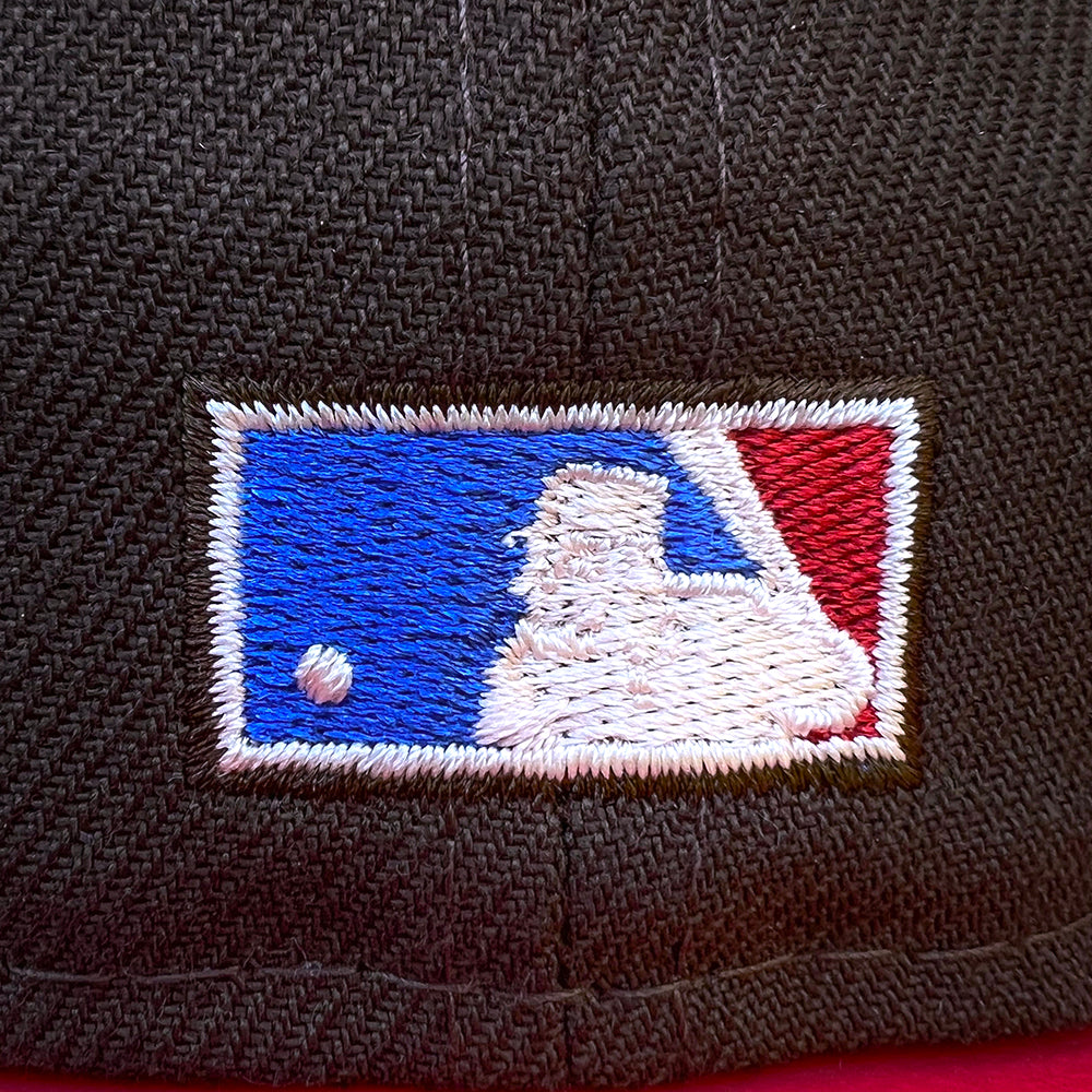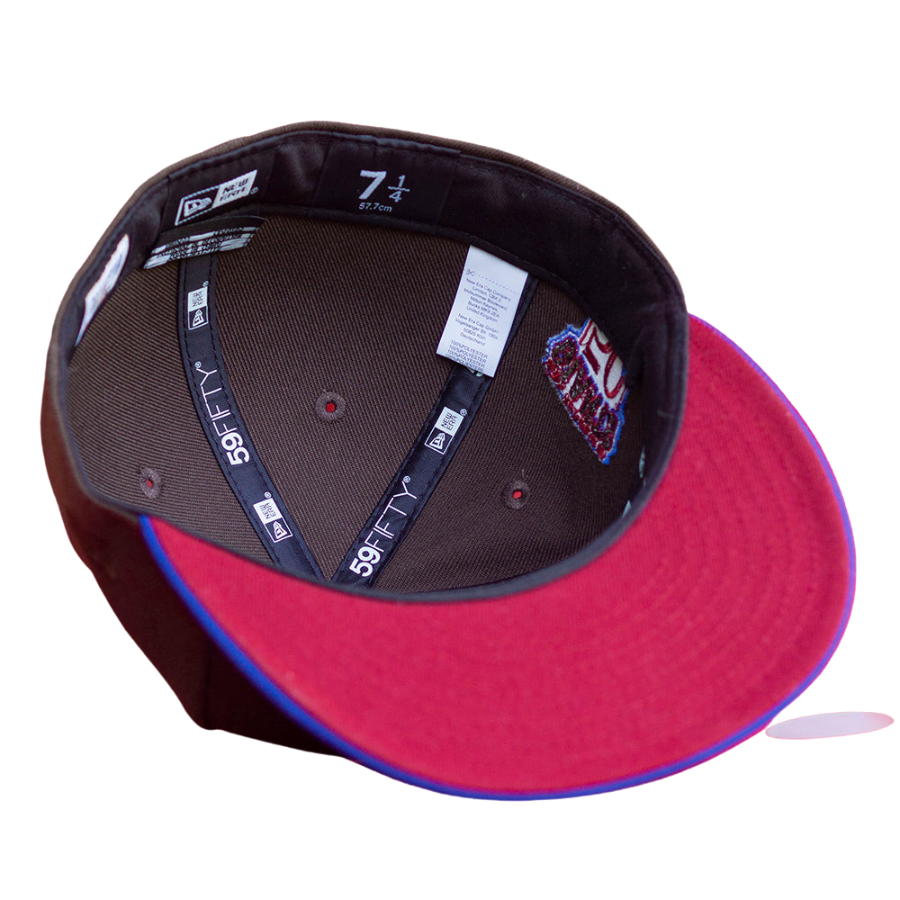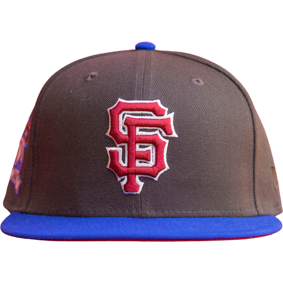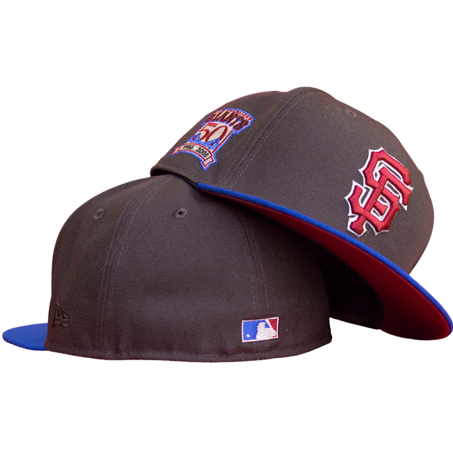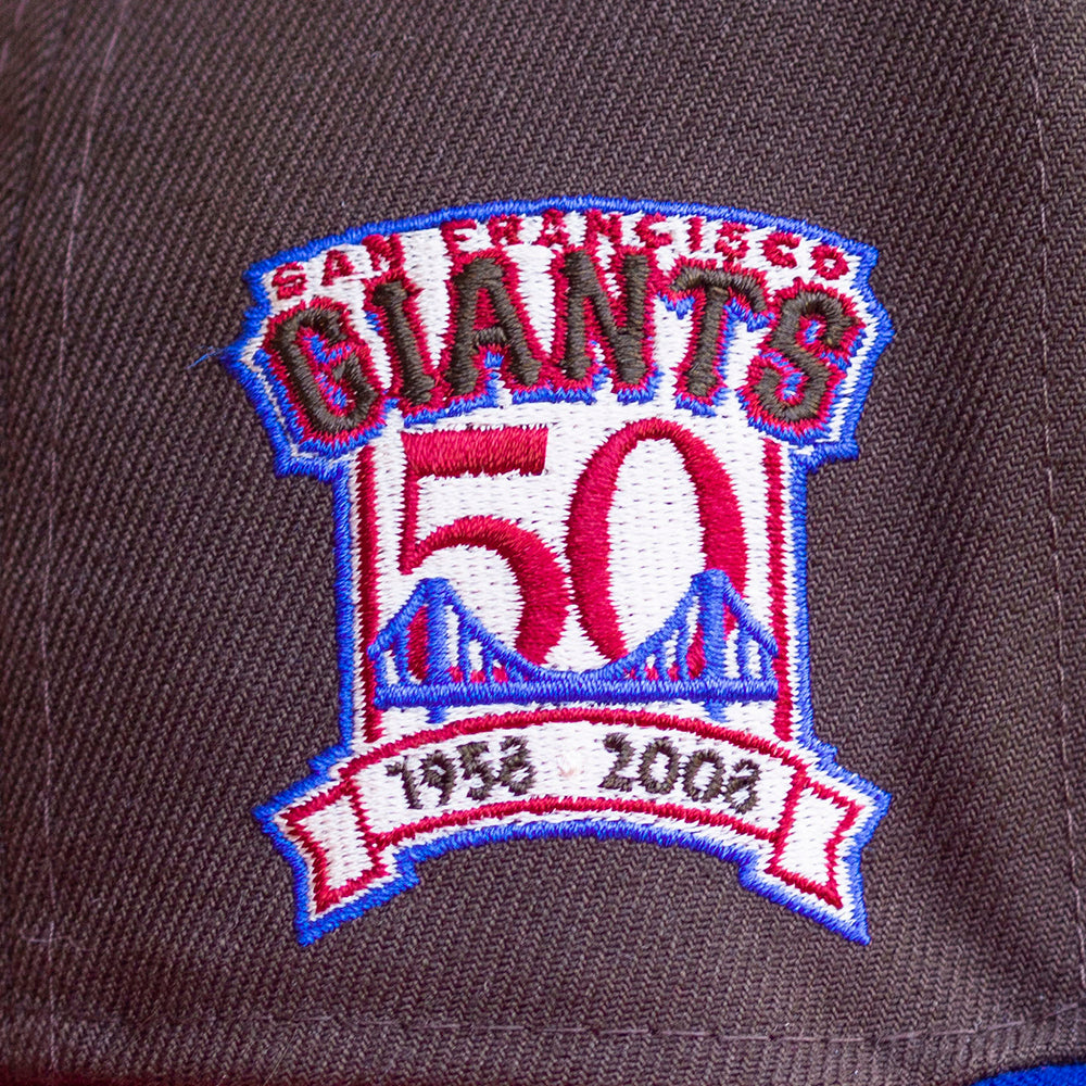 This New Era San Francisco Giants Mocha 50th Anniversary Two Tone 59FIFTY Fitted Hat has a dark brown six panel structured high crown and embroidered eyelets with a royal blue fabric squatchee button. The fitted cap has a royal blue flat bill with a burgundy undervisor and black sweatband. The front panel features the San Francisco Giants logo embroidery and a 50th Anniversary side patch on the right panel. The left panel of the fitted displays the New Era logo and the official MLB logo embroidery on the rear crown.