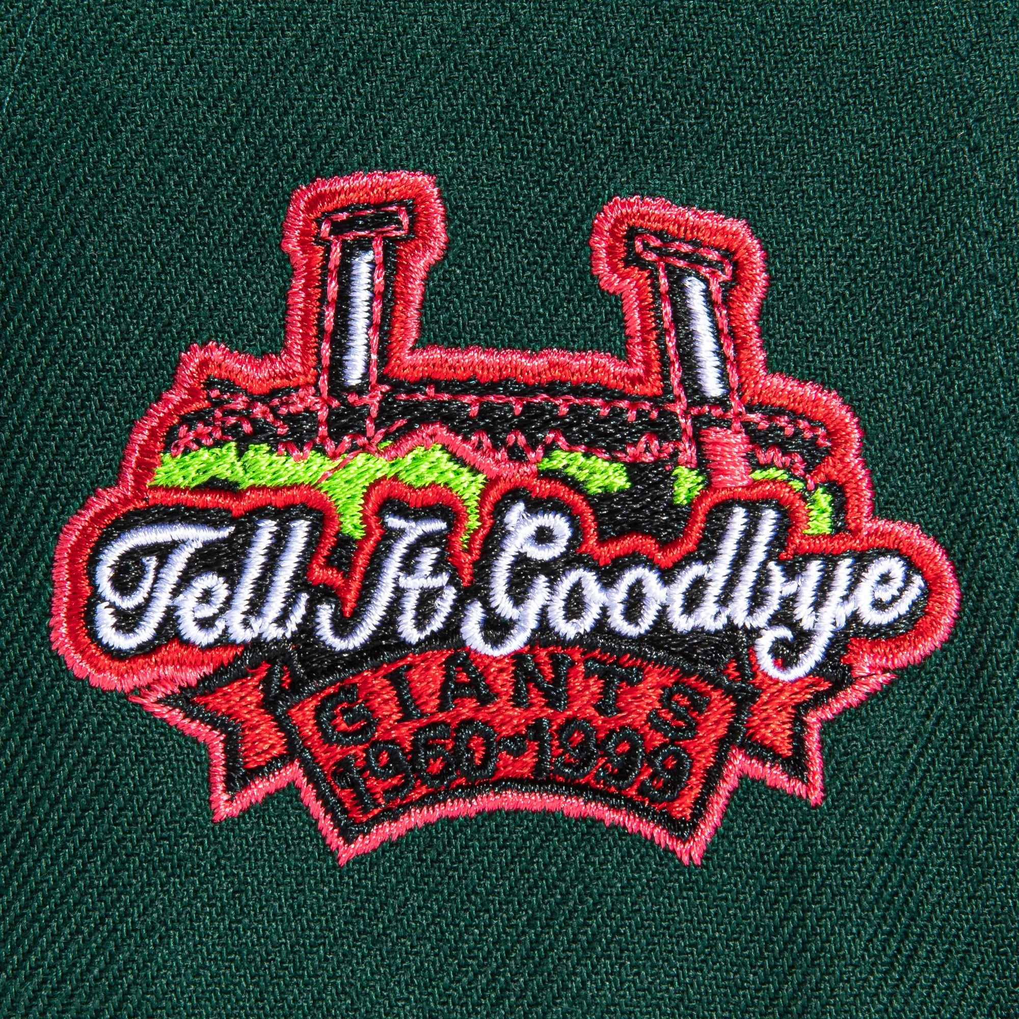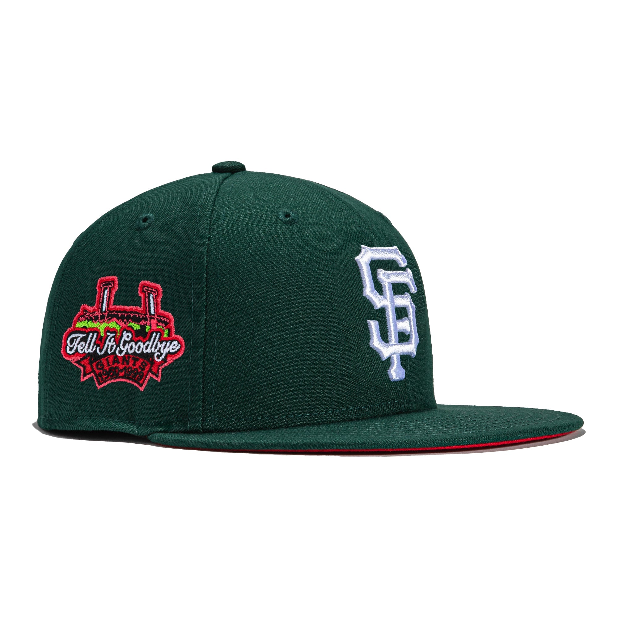 This New Era San Francisco Giants Tell it Goodbye 'Watermelon' 59FIFTY Fitted Hat was originally released by Hat Club. The fitted has a dark green six panel structured high crown, embroidered eyelets and fabric squatchee button. The flat bill of the fitted cap is also dark green with a red bottom undervisor. The front panel features the San Francisco Giants logo embroidery and a side patch embroidered on the right panel. The left panel of the fitted displays the New Era logo and the official MLB insignia embroidered on the rear crown. The fitted hat colorway is inspired by the colors of a watermelon.