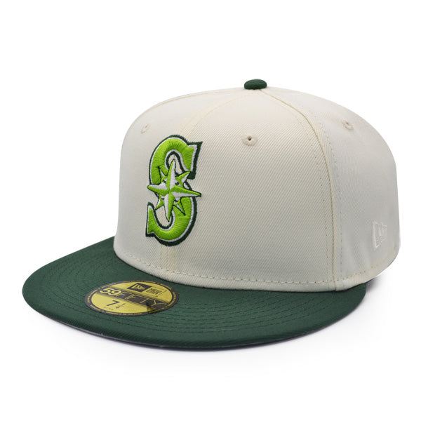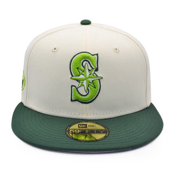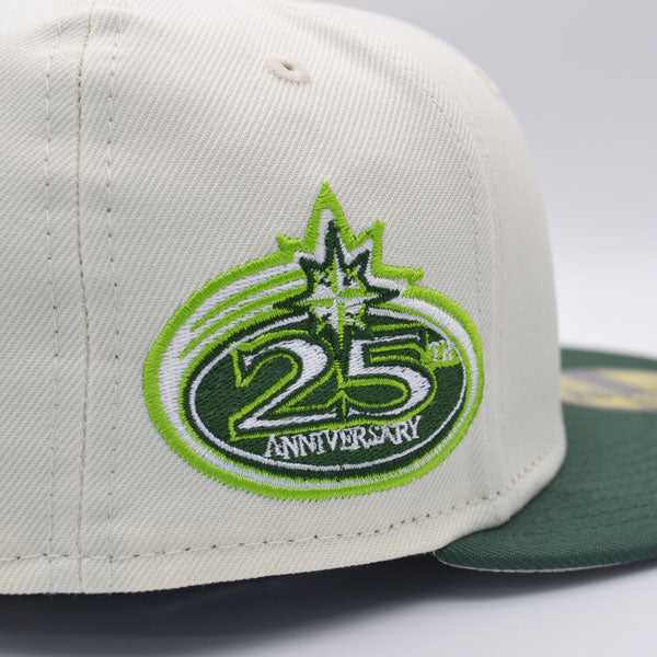 This New Era Seattle Mariners 25th Anniversary Chrome/Green/Lime 59FIFTY Fitted Hat has a chrome six panel structured high crown and embroidered eyelets with a dark green fabric squatchee button. The fitted cap also has a dark green flat bill with a light grey undervisor. The front panel features the Seattle Mariners logo embroidered in lime green stitching and a 25th Anniversary side patch embroidery on the right panel. The left panel of the fitted displays the New Era logo and the official MLB logo embroidery on the rear crown.