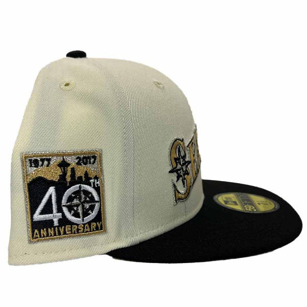 This New Era Seattle Mariners 'Champagne' 40th Anniversary Gold UV 59FIFTY Fitted Hat was released by Pro Image Sports. The fitted has a cream six panel structured high crown and embroidered eyelets with a black fabric squatchee button. The fitted cap also has a black flat bill with a metallic gold undervisor and white sweatband. The front panel features the Seattle Mariners logo embroidery and a 40th Anniversary side patch embroidery on the right panel. The left panel of the fitted displays the New Era logo and the official MLB logo embroidery on the rear crown.