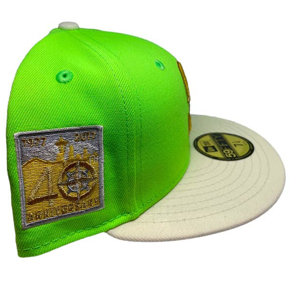 This New Era Seattle Mariners Lime "Vince Recess" 40th Anniversary 59FIFTY Fitted Hat is a Pro Image Sports exclusive. The fitted has a lime green six panel structured high crown and embroidered eyelets with a chrome fabric squatchee button. The fitted cap also has a chrome flat bill with a grey undervisor. The front panel features the Seattle Mariners logo embroidery and a 40th Anniversary side patch embroidery on the right panel. The left panel of the fitted displays the New Era logo and the official MLB Batterman embroidery on the rear crown.