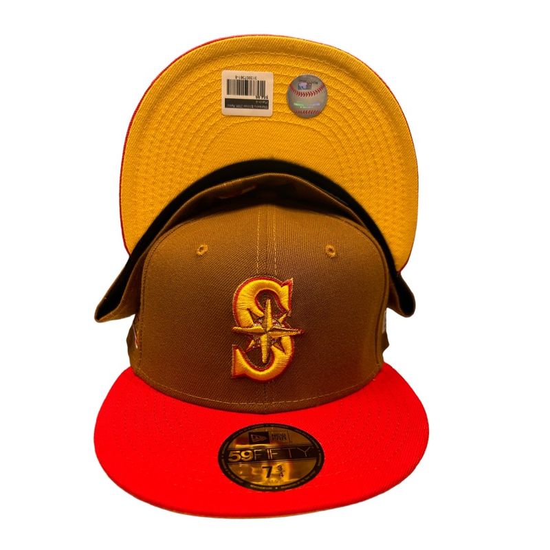 This New Era Seattle Mariners 59FIFTY fitted hat was released by Pro Image Sports. The fitted cap has a toasted peanut six panel structured high crown, embroidered eyelets and fabric squatchee button. The front panel features the Seattle Mariners logo embroidery, a red flat bill and yellow undervisor with a 20th Anniversary side patch on the right panel.