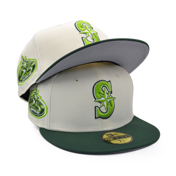 This New Era Seattle Mariners White/Pine/Gold 25th Anniversary 59FIFTY Fitted Hat was released by Hat Dreams. The fitted has a white six panel structured high crown and embroidered eyelets with a pine green fabric squatchee button. The flat bill of the fitted cap is also pine green with a grey bottom undervisor. The front panel features the Seattle Mariners logo embroidery and a side patch embroidered on the right panel. The left panel of the fitted displays the New Era logo and the official MLB Batterman logo embroidered on the rear crown.