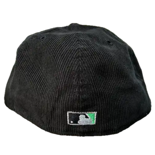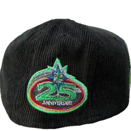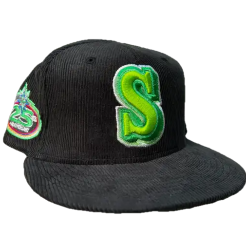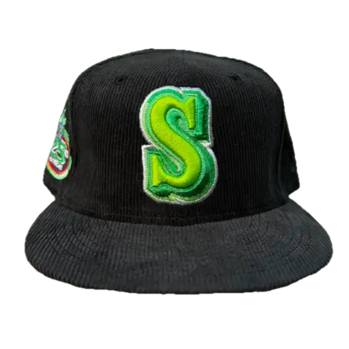 This Seattle Mariners X Box inspired fitted hat was released by My Fitteds. The fitted has a black corduroy six panel structured high crown and embroidered eyelets with a black corduroy fabric squatchee button. The fitted cap also has a black corduroy flat bill with a kelly green undervisor and white sweatband. The front panel features the Seattle Mariners logo embroidery and a 25th Anniversary side patch embroidery on the right panel. The left panel of the fitted displays the New Era logo and the official MLB Batterman logo embroidery on the rear crown.