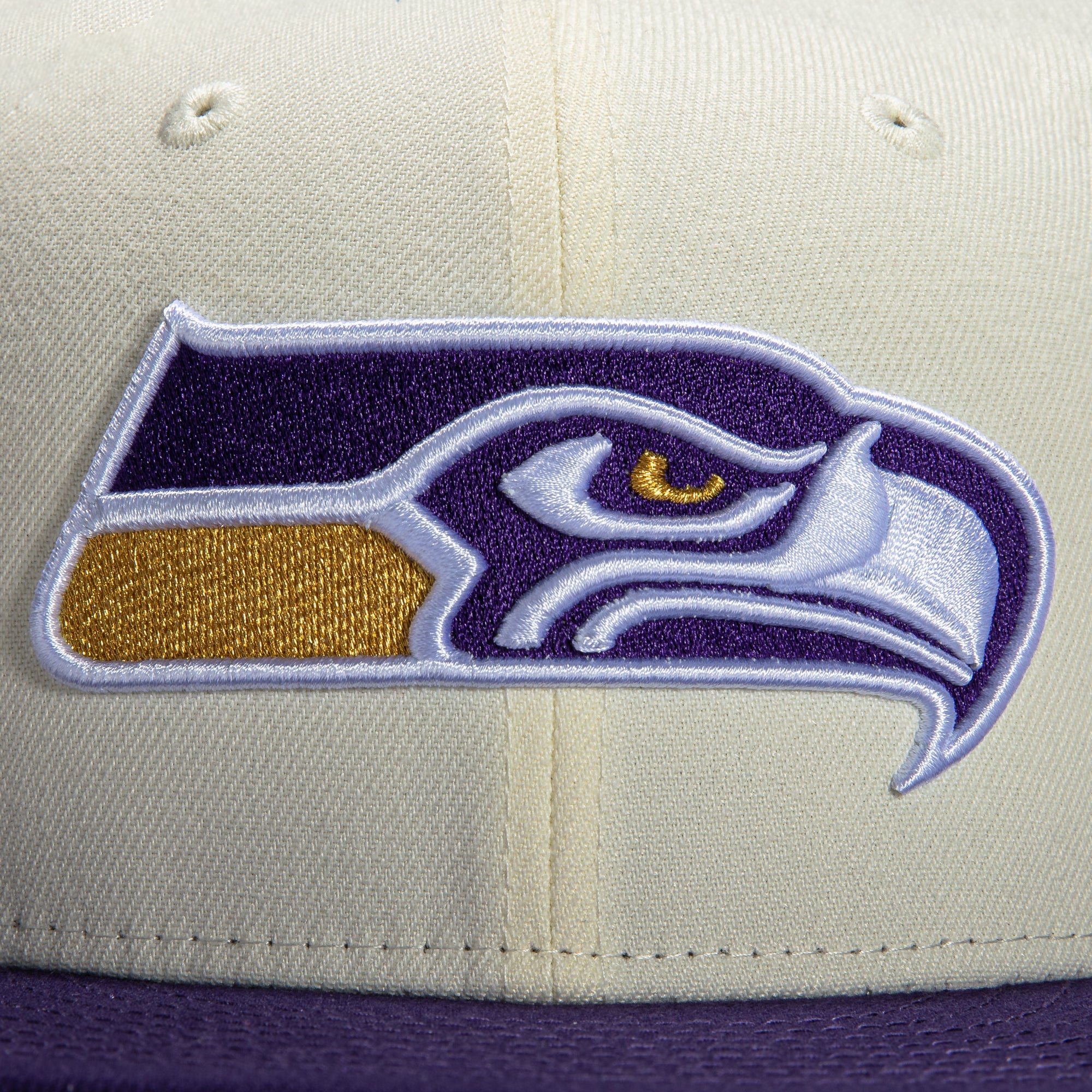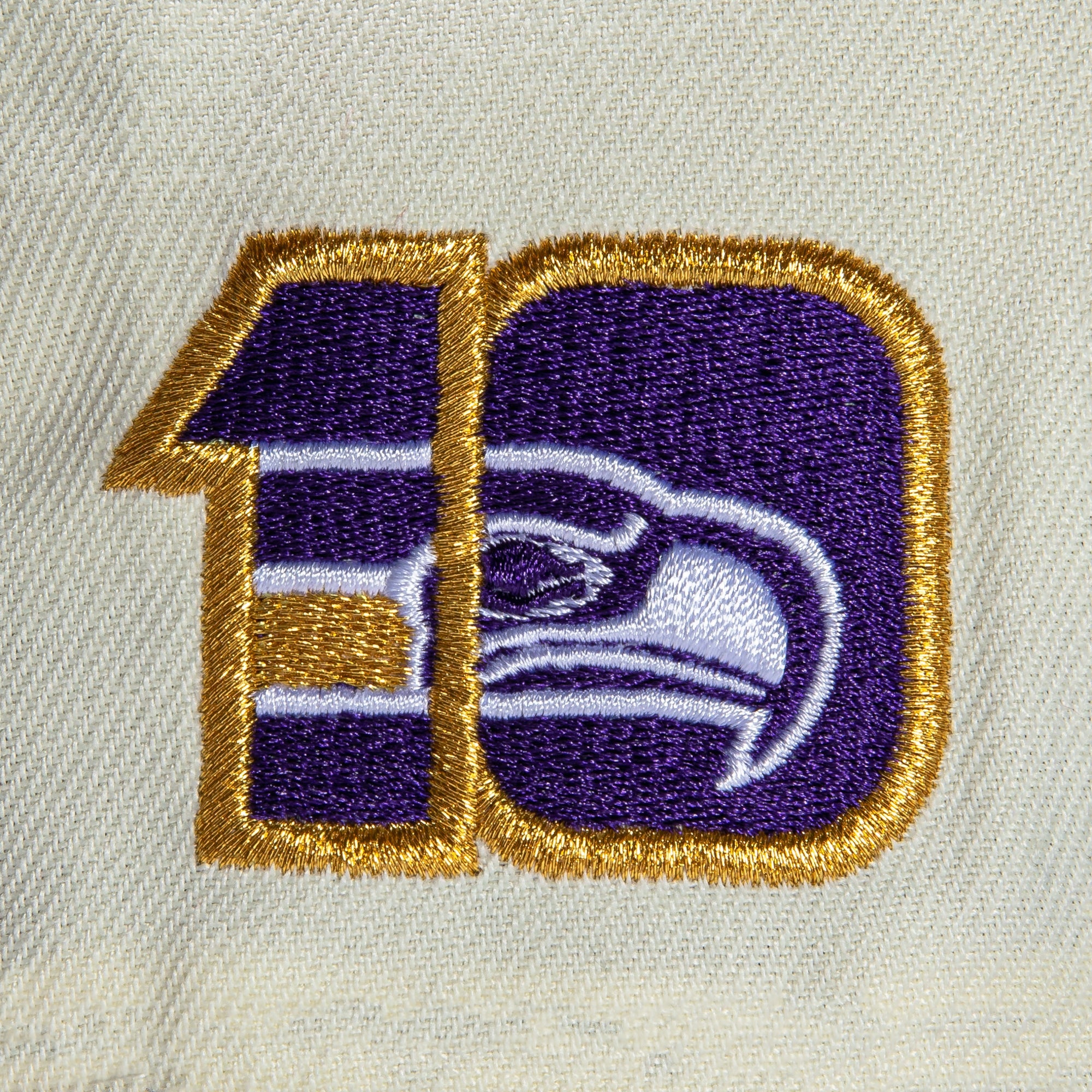 This New Era Seattle Seahawks 10th Anniversary 59FIFTY Fitted Hat is a Hat Club exclusive. The fitted has a white six panel structured high crown and embroidered eyelets with a purple fabric squatchee button. The fitted cap has a purple flat bill with a grey undervisor and black sweatband. The front panel features the Seattle Seahawks logo embroidery and an Anniversary side patch embroidery on the right panel. The left panel of the fitted displays the New Era logo and the official NFL shield embroidery on the rear crown.