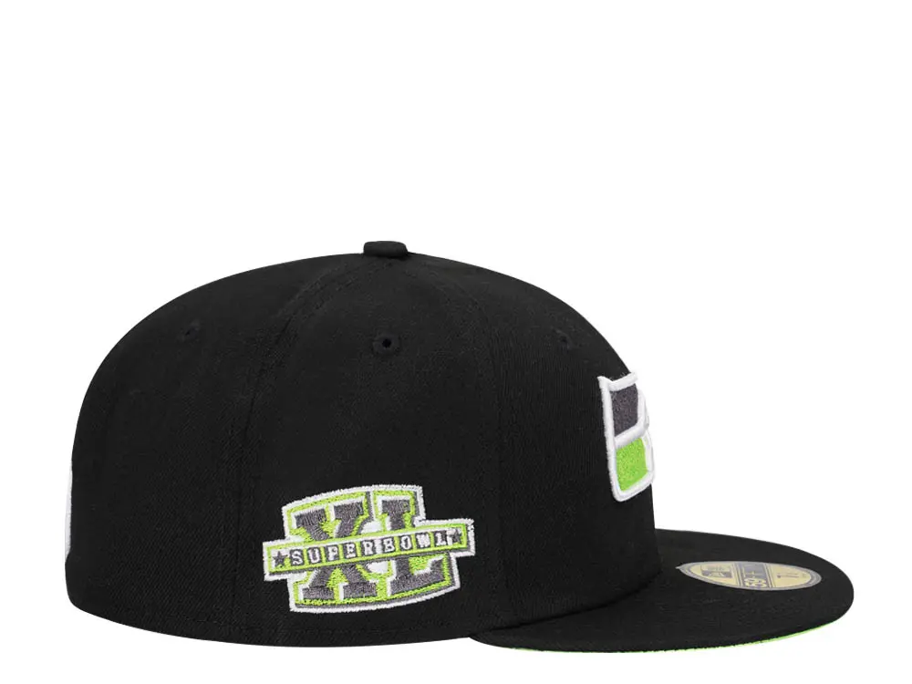 This New Era Seattle Seahawks Super Bowl XL Black Neon 59FIFTY Fitted Hat has a black six panel structured high crown and embroidered eyelets with a black fabric squatchee button. The fitted cap also has a black flat bill with a lime green undervisor and white sweatband. The front panel features the Seattle Seahawks logo embroidery and a Super Bowl XL side patch on the right panel. The left panel of the fitted displays the New Era logo and the official NFL shield logo embroidery on the rear crown.