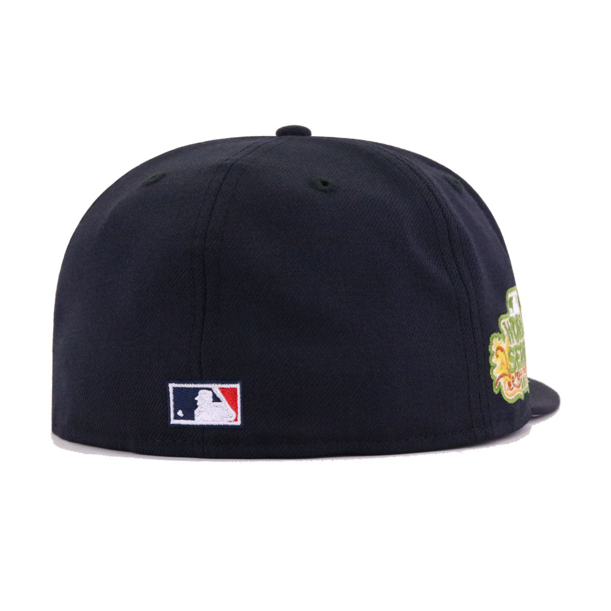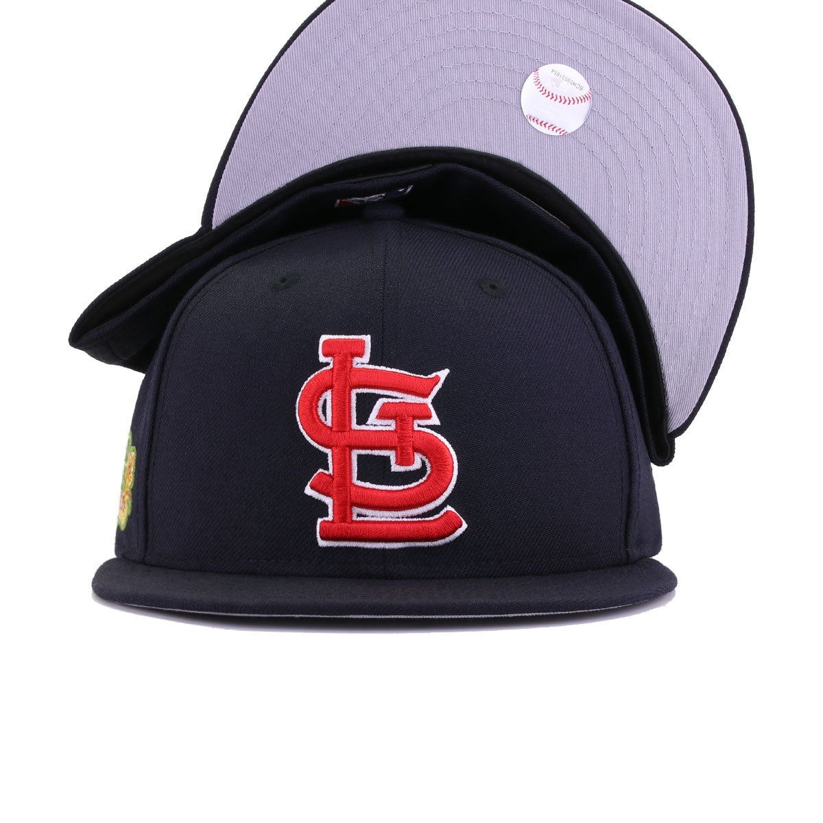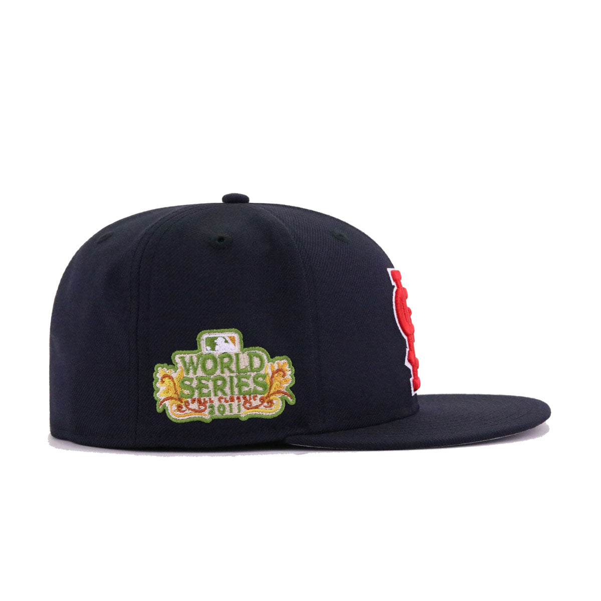This New Era St Louis Cardinals Navy 2011 World Series 59FIFTY Fitted Hat was released by Hat Heaven. The fitted has a navy blue six panel structured high crown and embroidered eyelets with a navy blue fabric squatchee button. The flat bill of the fitted cap is also navy blue with a grey undervisor and black sweatband. The front panel features the St. Louis Cardinals logo embroidered in red stitching and the New Era "Fly Your Own Flag" logo on the left panel.