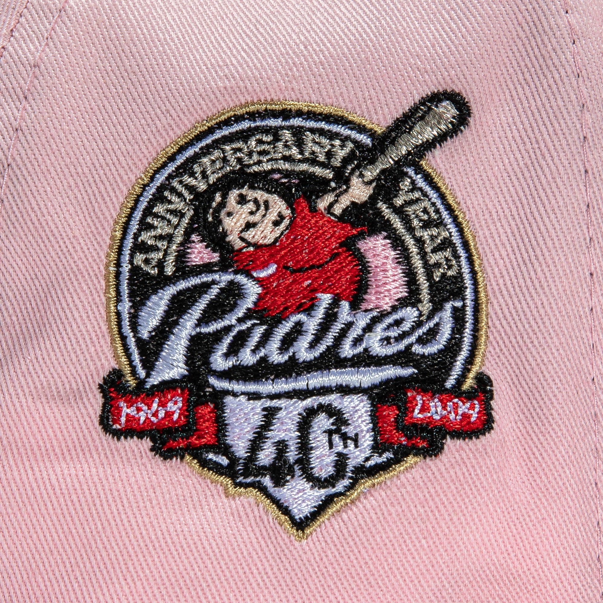 This New Era New Era Strawberry Jam San Diego Padres 40th Anniversary 59FIFTY Fitted Hat was released by Hat Club. The fitted features a soft pink six panel structured high crown, embroidered eyelets and fabric squatchee button. The flat bill of the fitted is also soft pink with a red undervisor and white sweatband. The front panel includes the San Diego Padres logo embroidery and a side patch on the right-wear side.