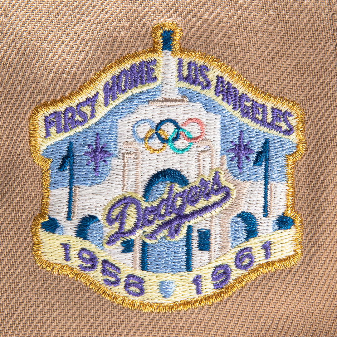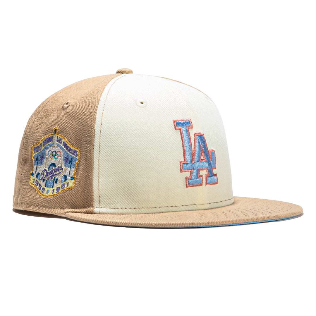 This New Era Sugar Shack 2.0 Los Angeles Dodgers 1st Home 59FIFTY Fitted Hat is a Hat Club Exclusive. It has a tan and white six panel structured high crown and embroidered eyelets with a tan and white fabric squatchee button. The fitted cap has a tan flat bill with a sky blue undervisor and white sweatband. The front panel features the Los Angeles Dodgers logo embroidery and a 1st Home side patch embroidery on the right panel. The left panel of the fitted displays the New Era logo and the official MLB logo embroidery on the rear crown.