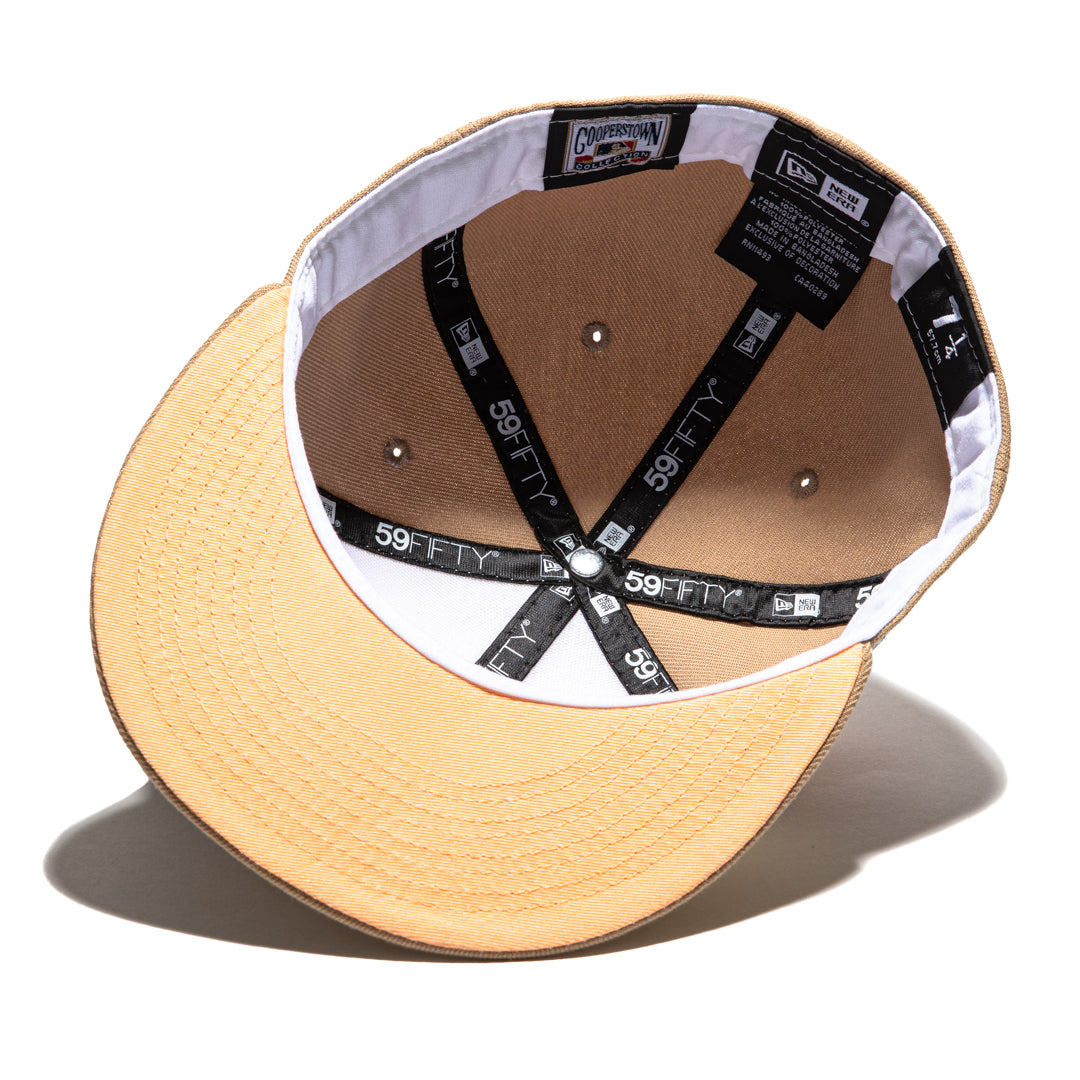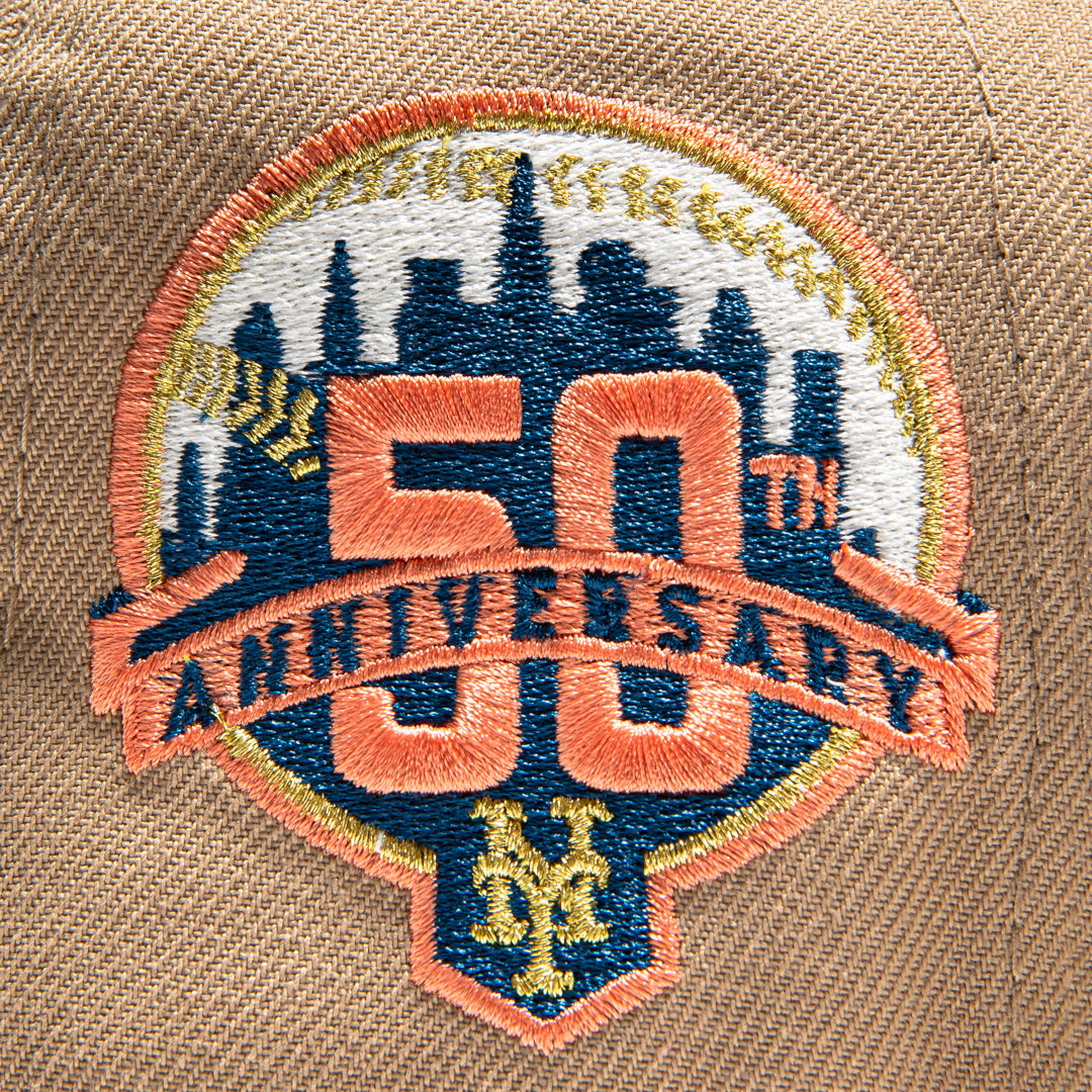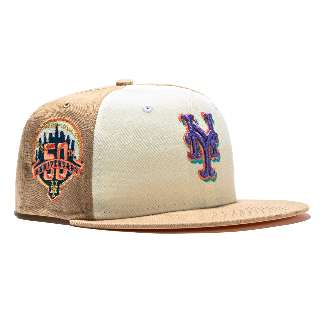 This New Era Sugar Shack 2.0 New York Mets 50th Anniversary 59FIFTY Fitted Hat is a Hat Club Exclusive. It has a tan and white six panel structured high crown and embroidered eyelets with a tan and white fabric squatchee button. The fitted cap has a tan flat bill with a peach undervisor and white sweatband. The front panel features the New York Mets logo embroidery and a 50th Anniversary side patch embroidery on the right panel. The left panel of the fitted displays the New Era logo and the official MLB logo embroidery on the rear crown.