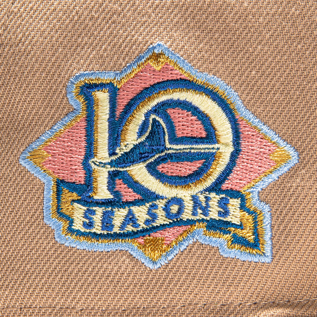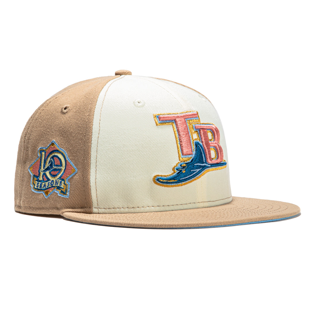 This New Era Sugar Shack 2.0 Tampa Bay Rays 10th Anniversary 59FIFTY Fitted Hat is a Hat Club Exclusive. It has a tan and white six panel structured high crown and embroidered eyelets with a tan and white fabric squatchee button. The fitted cap has a tan flat bill with a sky blue undervisor and white sweatband. The front panel features the Tampa Bay Rays logo embroidery and a 10th Anniversary side patch embroidery on the right panel. The left panel of the fitted displays the New Era logo and the official MLB logo embroidery on the rear crown.