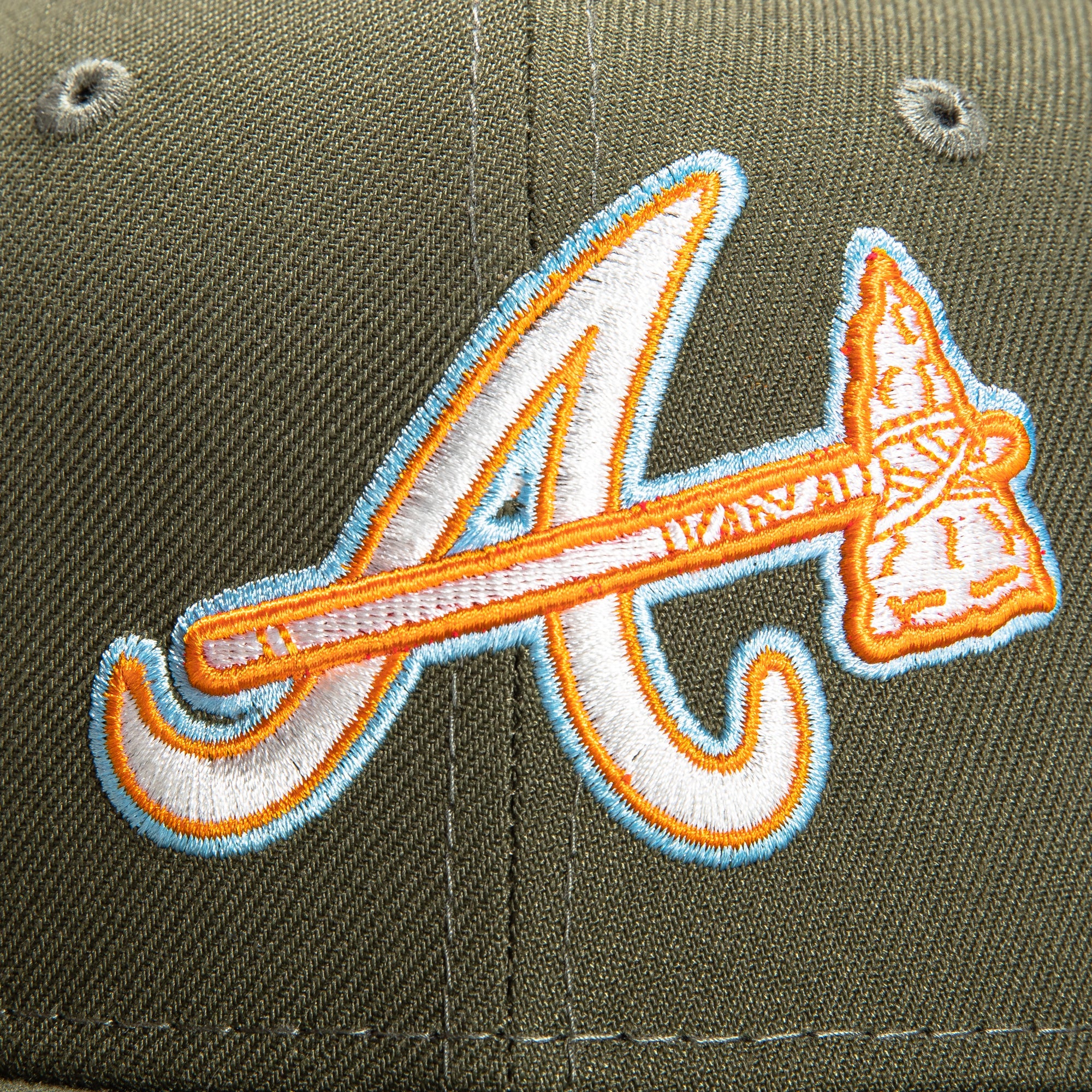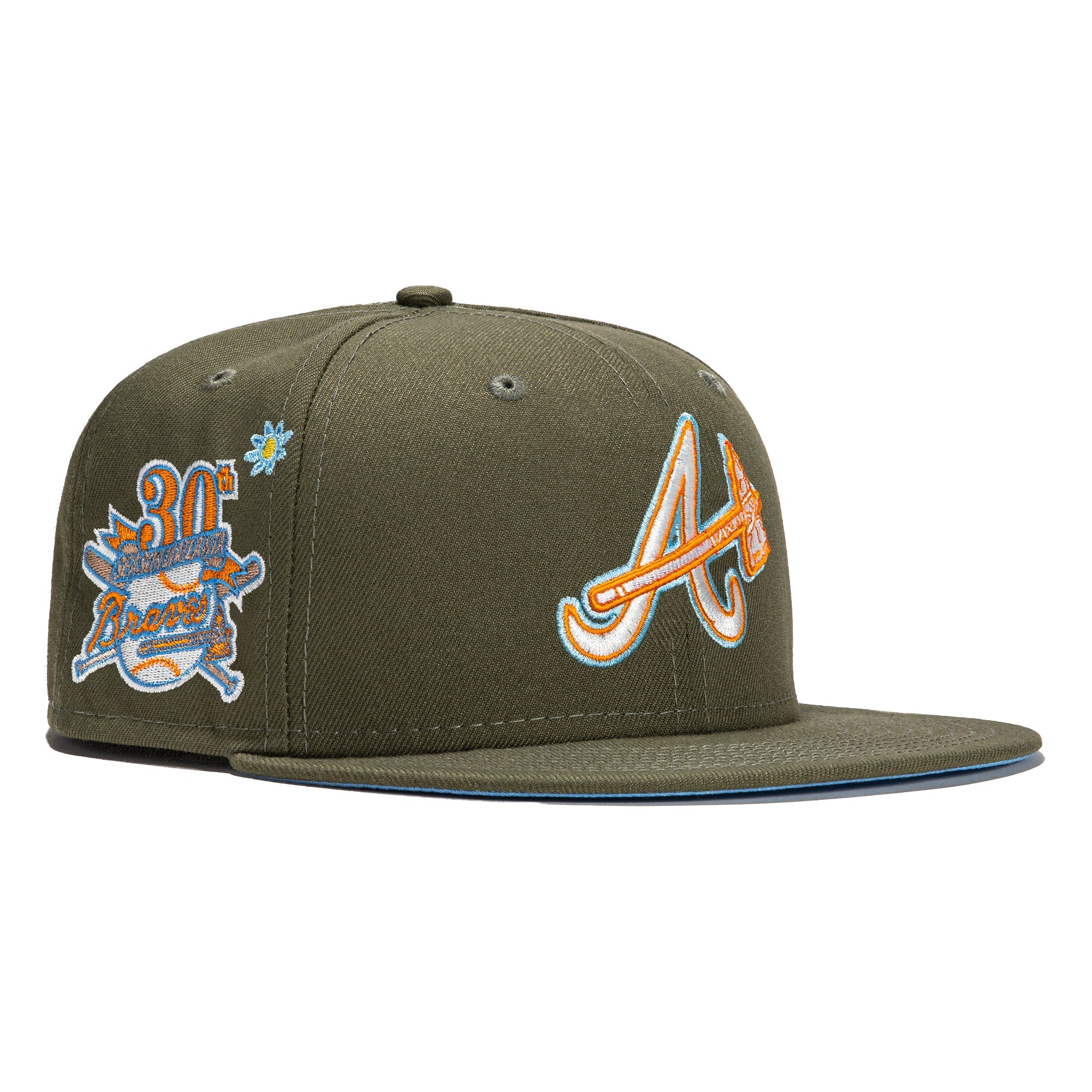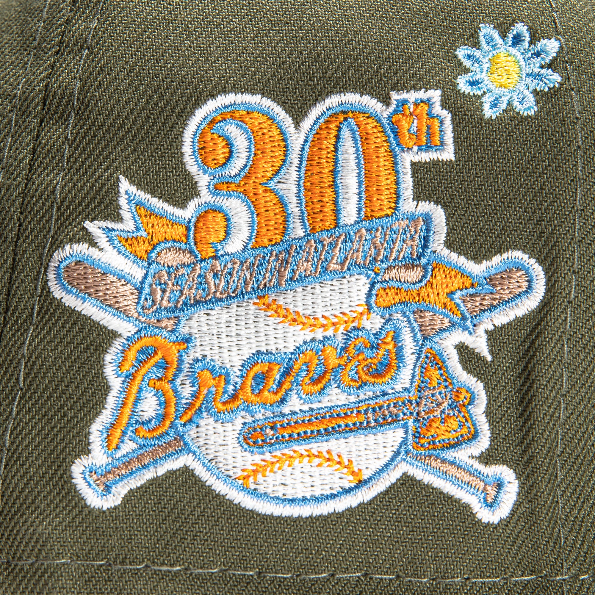 This New Era Super Bloom Atlanta Braves 30th Anniversary 2022 59FIFTY Fitted Hat is a Hat Club exclusive. It has a olive six panel structured high crown and embroidered eyelets with a olive fabric squatchee button. The fitted cap has a olive flat bill with a light blue undervisor. The front panel features the Atlanta Braves logo embroidery and a 30th Anniversary side patch embroidery on the right panel. The left panel of the fitted displays the New Era logo and the official MLB logo embroidery on the rear crown.