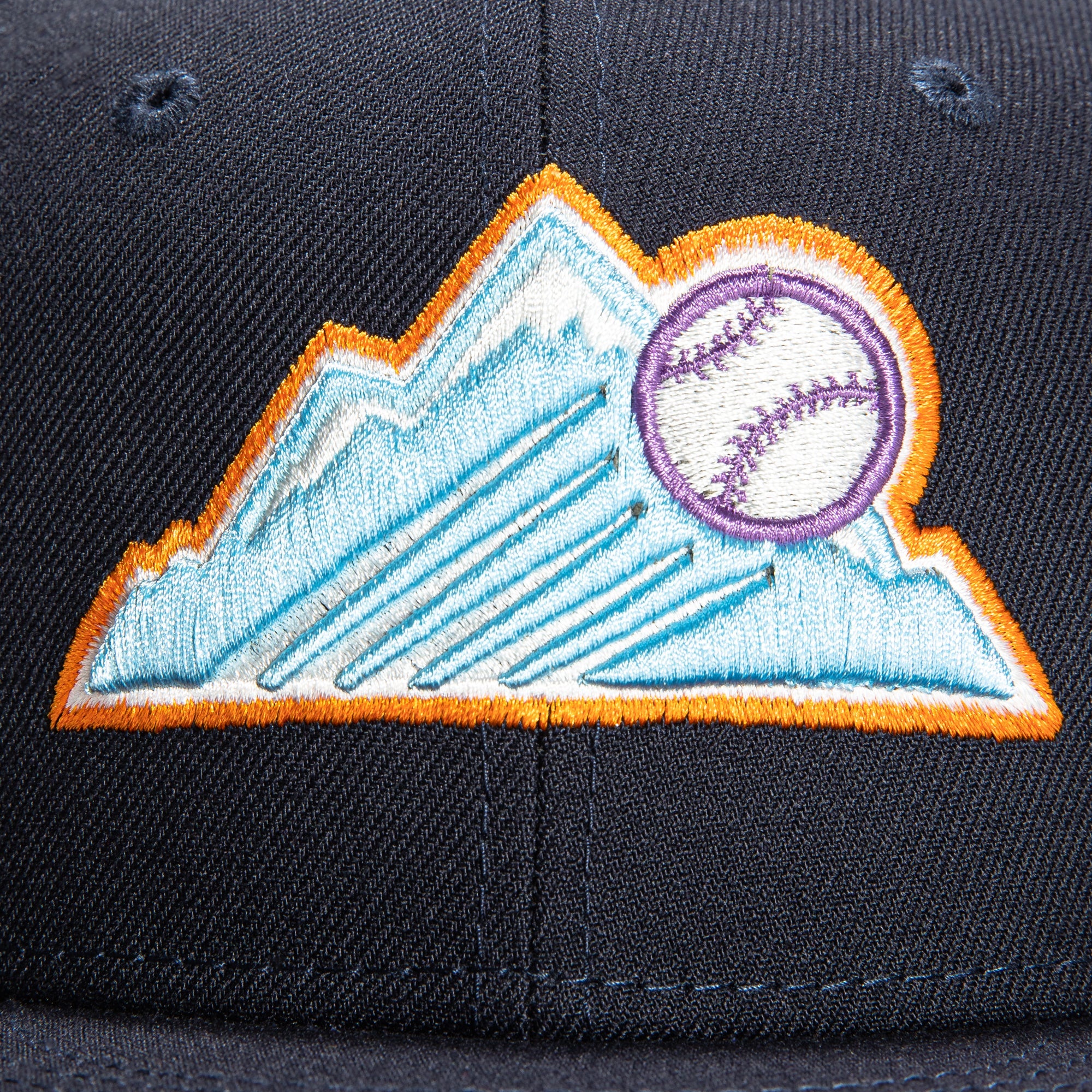 This New Era Super Bloom Colorado Rockies 25th Anniversary 2022 59FIFTY Fitted Hat is a Hat Club exclusive. It has a navy six panel structured high crown and embroidered eyelets with a navy fabric squatchee button. The fitted cap has a navy flat bill with a orange undervisor. The front panel features the Colorado Rockies logo embroidery and a 25th Anniversary side patch embroidery on the right panel. The left panel of the fitted displays the New Era logo and the official MLB logo embroidery on the rear crown.