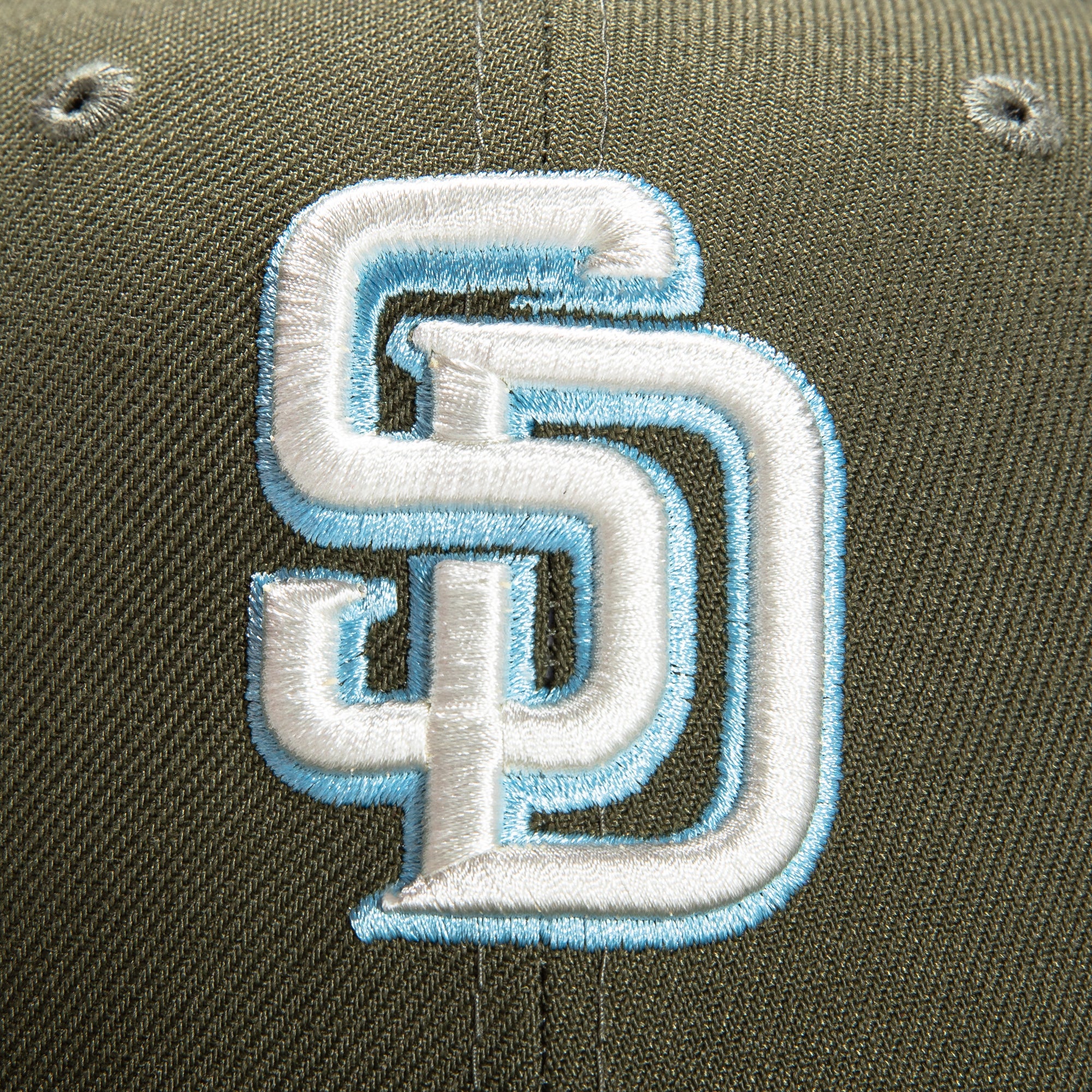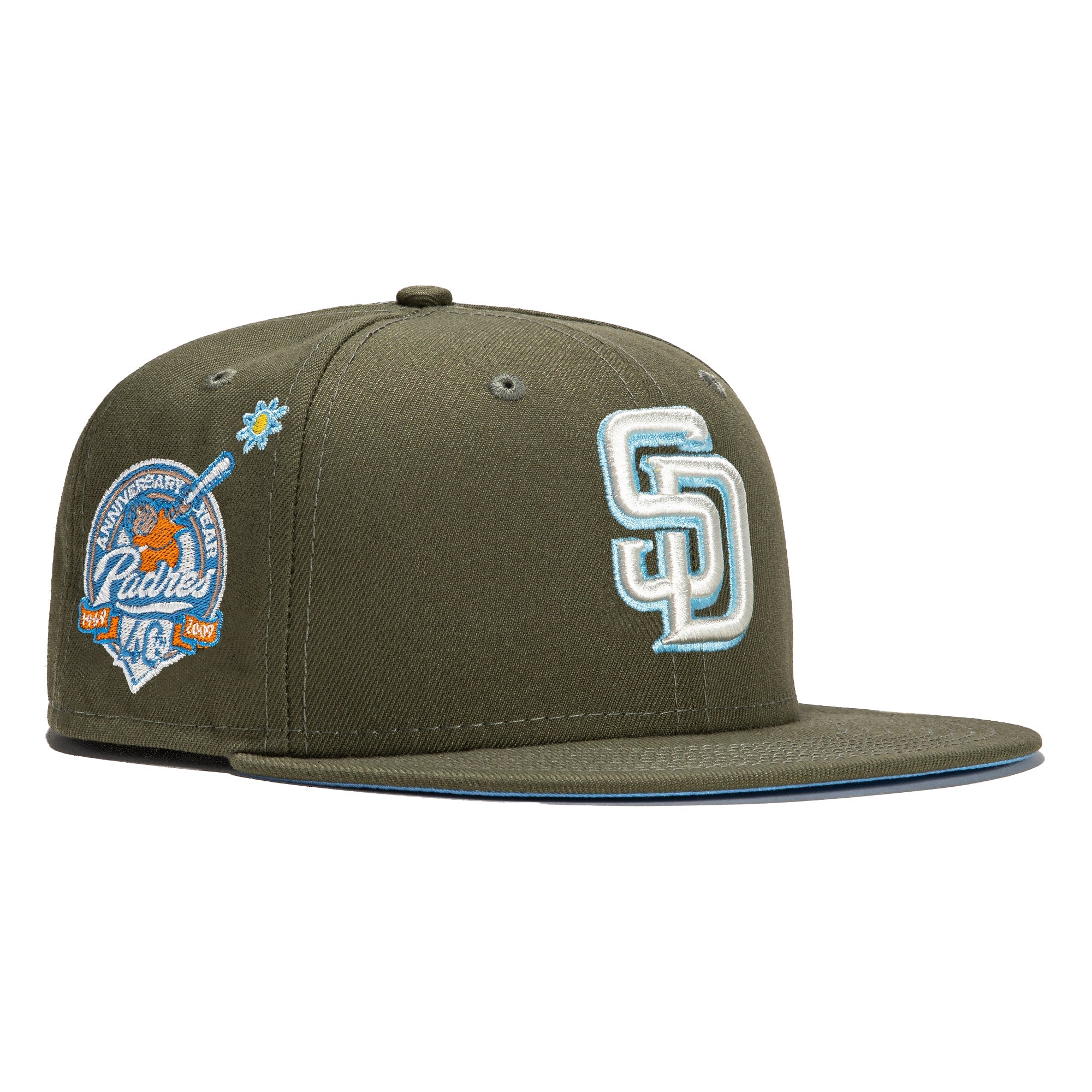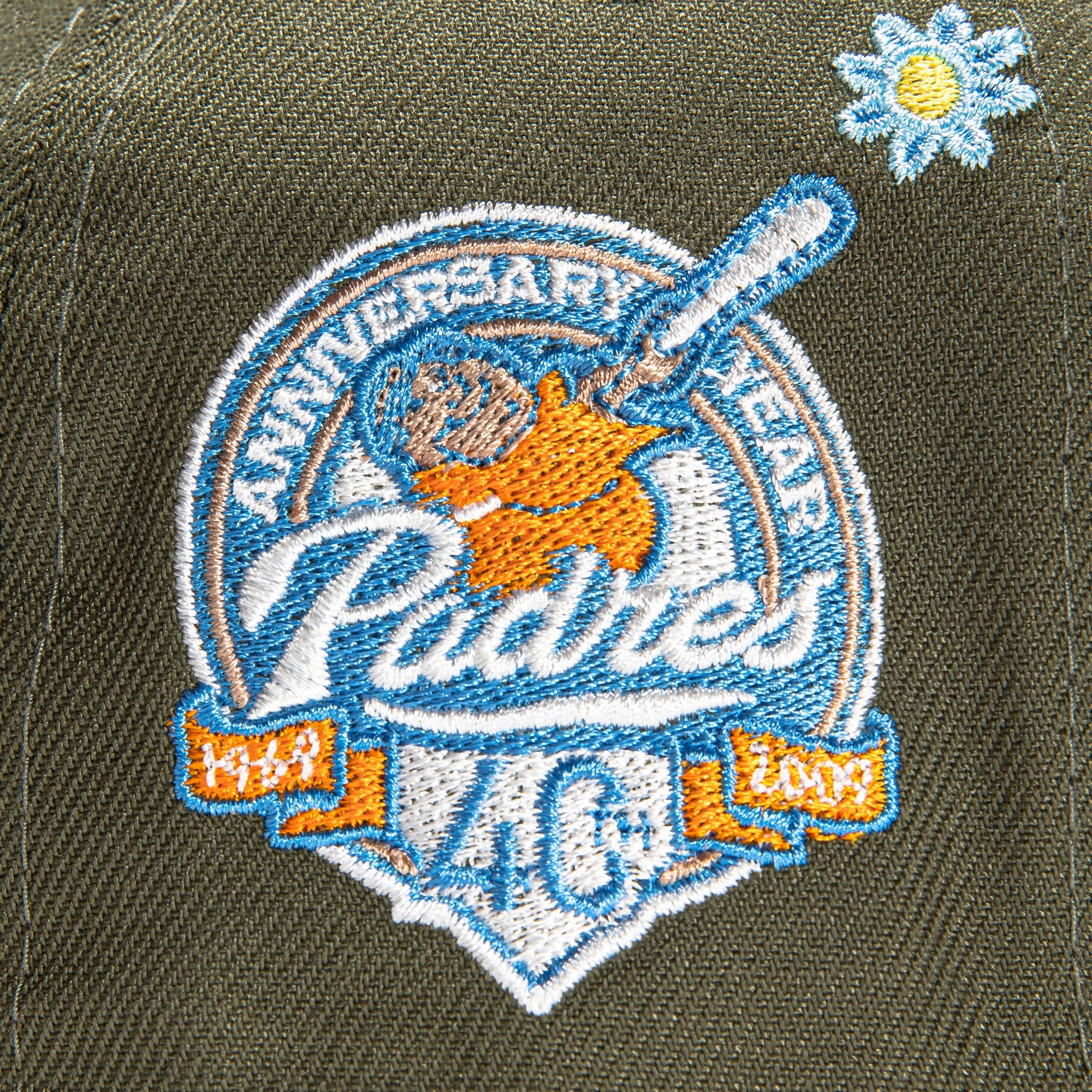 This New Era Super Bloom San Diego Padres 40th Anniversary 2022 59FIFTY Fitted Hat is a Hat Club exclusive. It has a olive six panel structured high crown and embroidered eyelets with a olive fabric squatchee button. The fitted cap has a olive flat bill with a light blue undervisor. The front panel features the San Diego Padres logo embroidery and a 40th Anniversary side patch embroidery on the right panel. The left panel of the fitted displays the New Era logo and the official MLB logo embroidery on the rear crown.