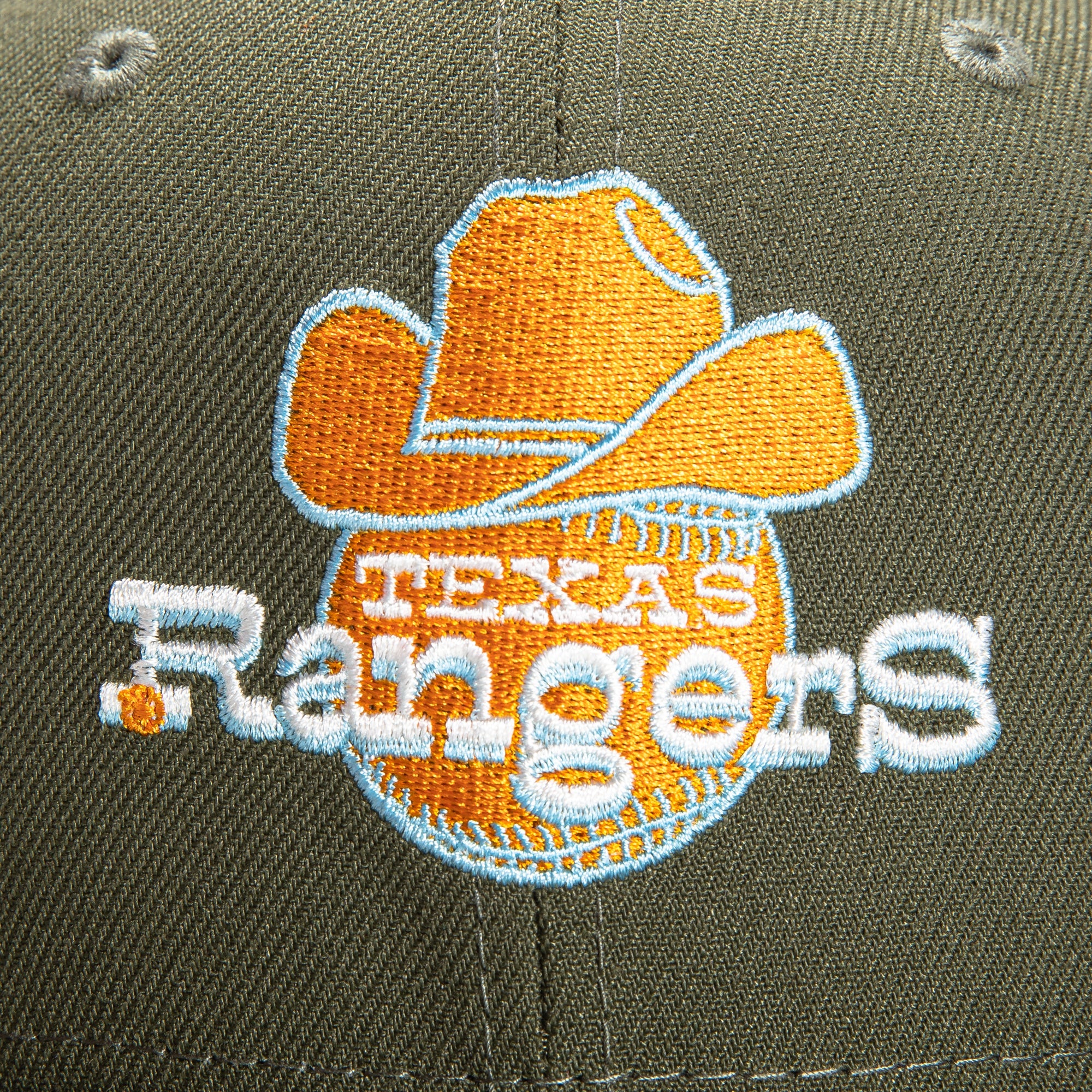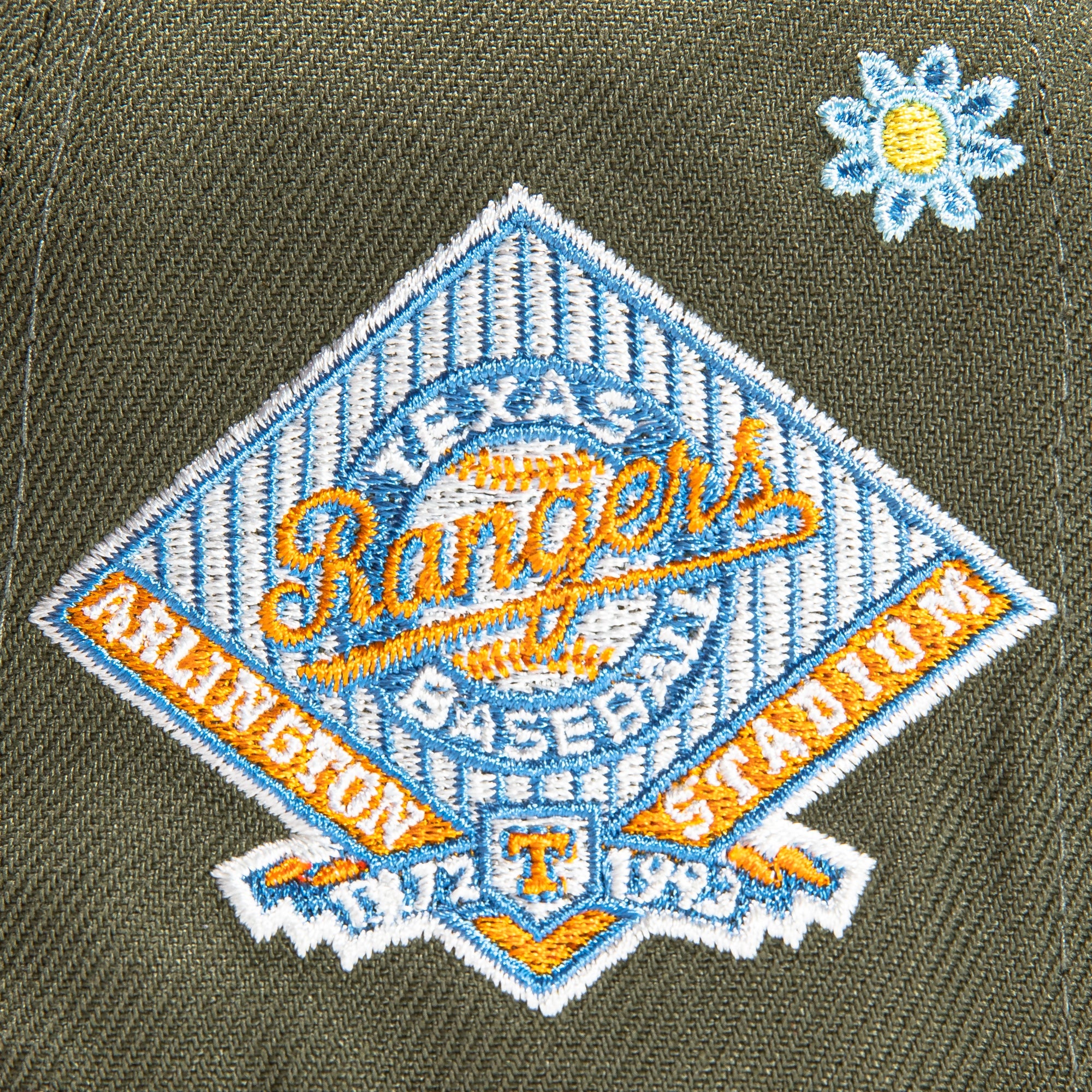 This New Era Super Bloom Texas Rangers Stadium 2022 59FIFTY Fitted Hat is a Hat Club exclusive. It has a olive six panel structured high crown and embroidered eyelets with a olive fabric squatchee button. The fitted cap has a olive flat bill with a light blue undervisor. The front panel features the Texas Rangers logo embroidery and a Stadium side patch embroidery on the right panel. The left panel of the fitted displays the New Era logo and the official MLB logo embroidery on the rear crown.