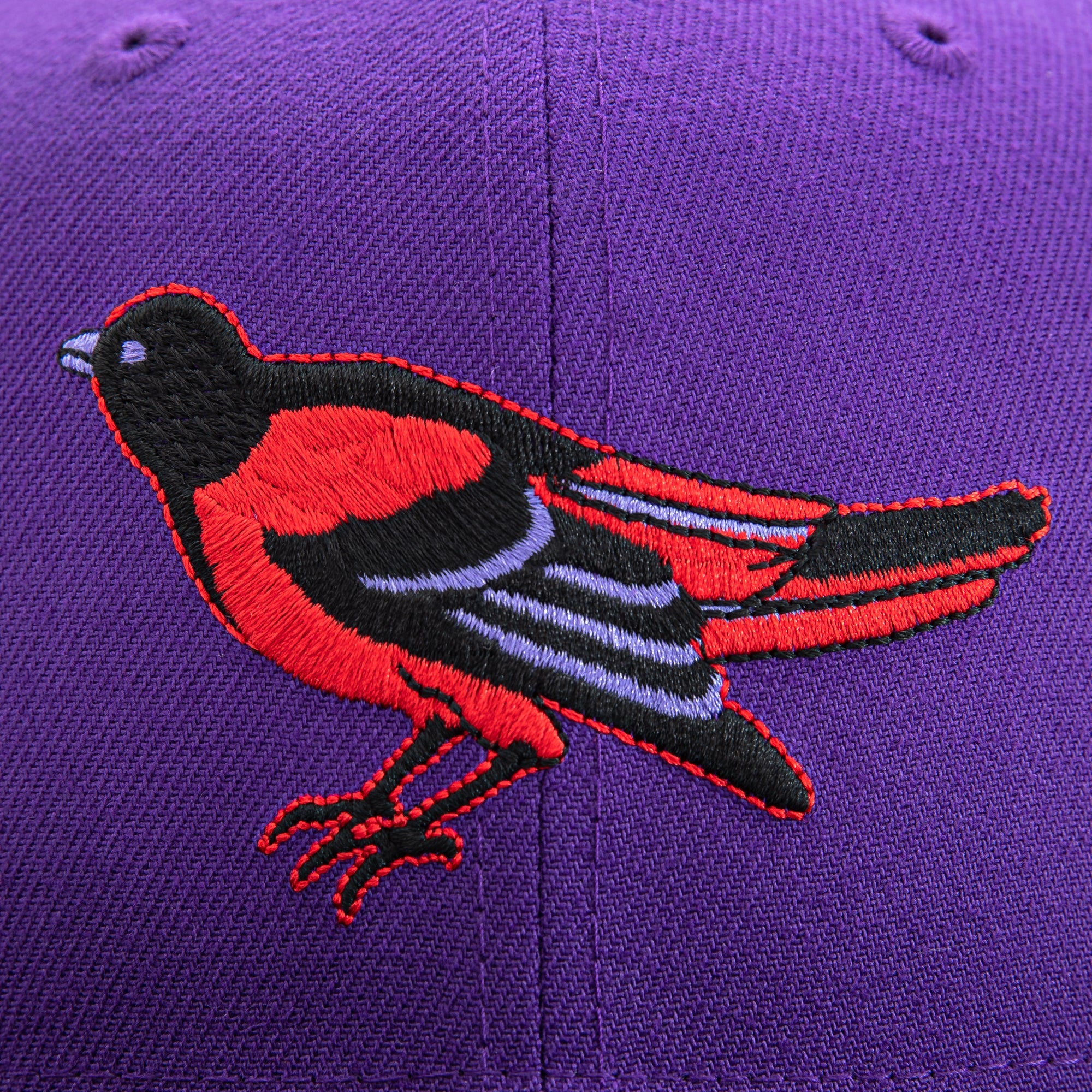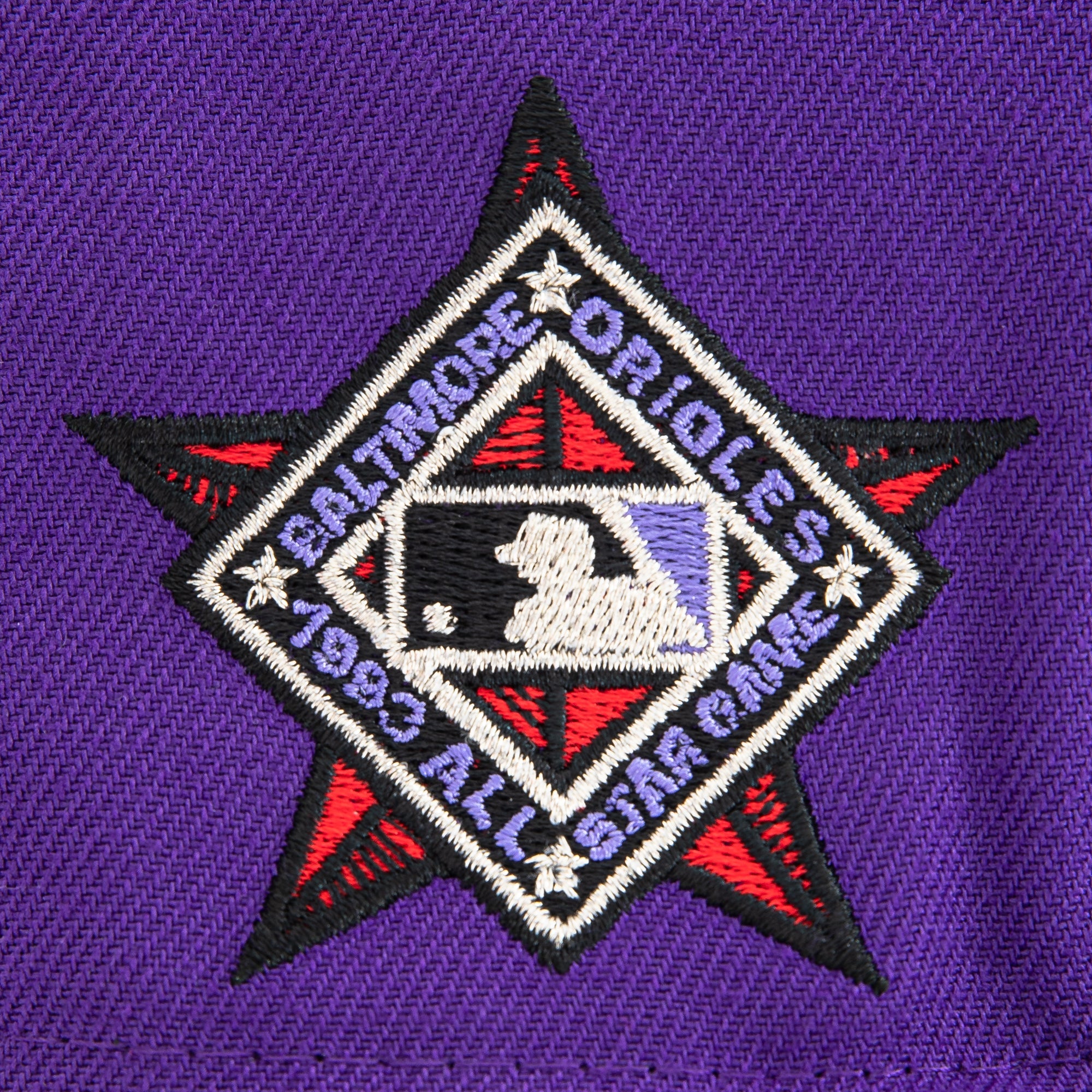 This New Era T-Dot Baltimore Orioles 1993 All-Star Game Patch 59FIFTY Fitted Hat is a Hat Club exclusive. It features a purple six panel structured high crown and embroidered eyelets with a black fabric squatchee button. The fitted cap has a black flat bill with a red undervisor. The front panel features the Baltimore Orioles logo embroidery and a side patch embroidery on the right panel. The left panel of the fitted displays the New Era logo and the official MLB logo embroidery on the rear crown.