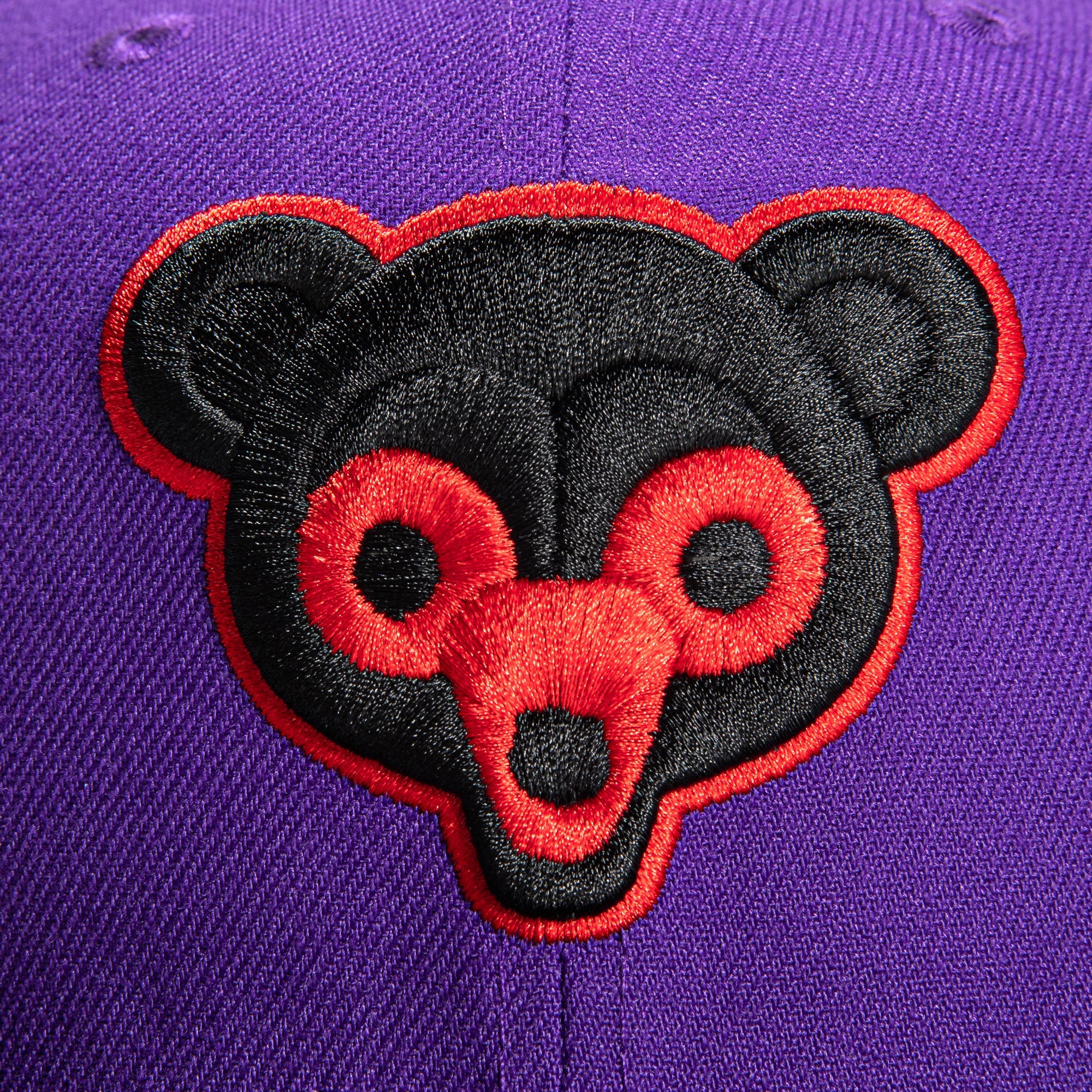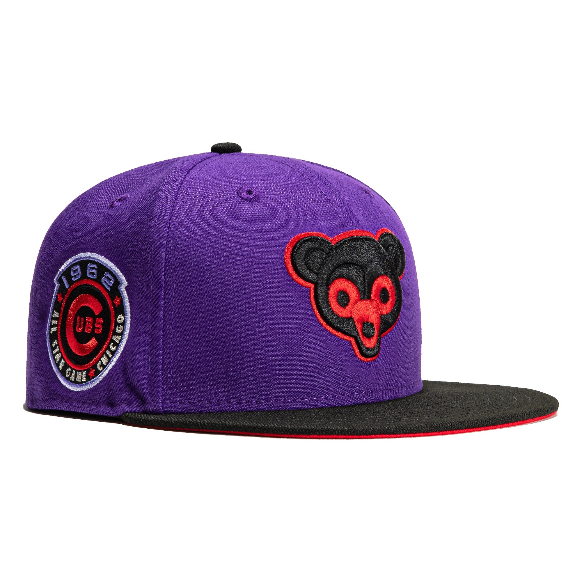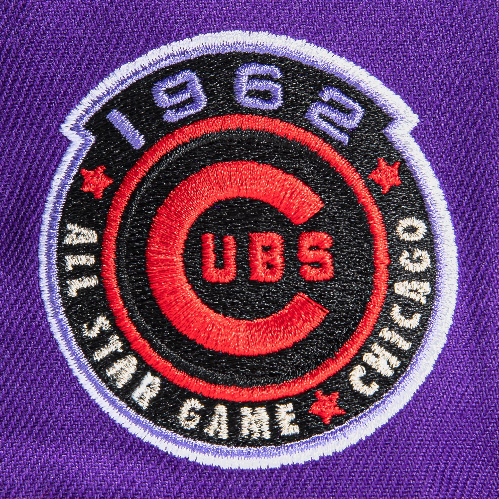 This New Era T-Dot Chicago Cubs 1962 All-Star Game 59FIFTY Fitted Hat is a Hat Club exclusive. It features a purple six panel structured high crown and embroidered eyelets with a black fabric squatchee button. The fitted cap has a black flat bill with a red undervisor. The front panel features the Chicago Cubs logo embroidery and a side patch embroidery on the right panel. The left panel of the fitted displays the New Era logo and the official MLB logo embroidery on the rear crown.