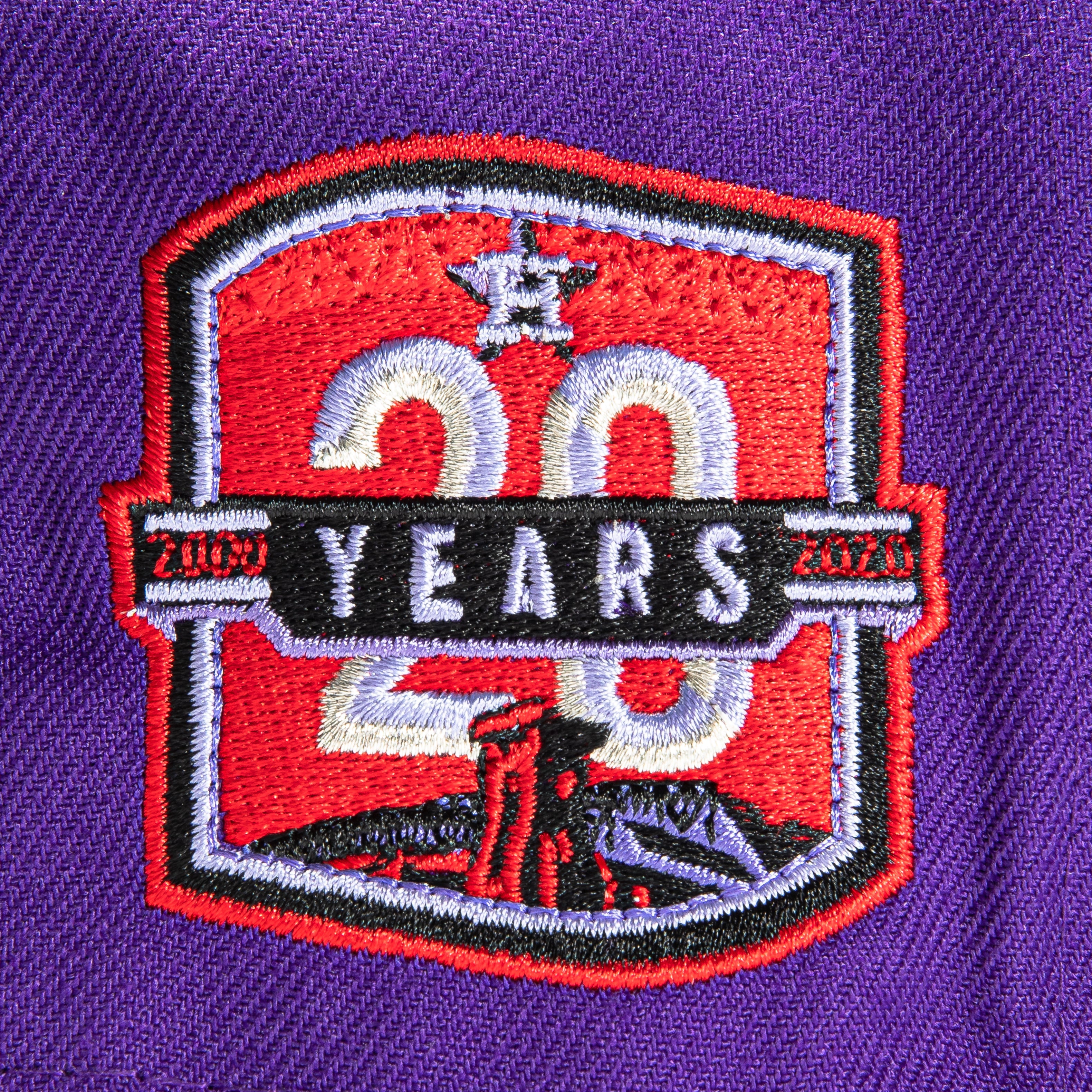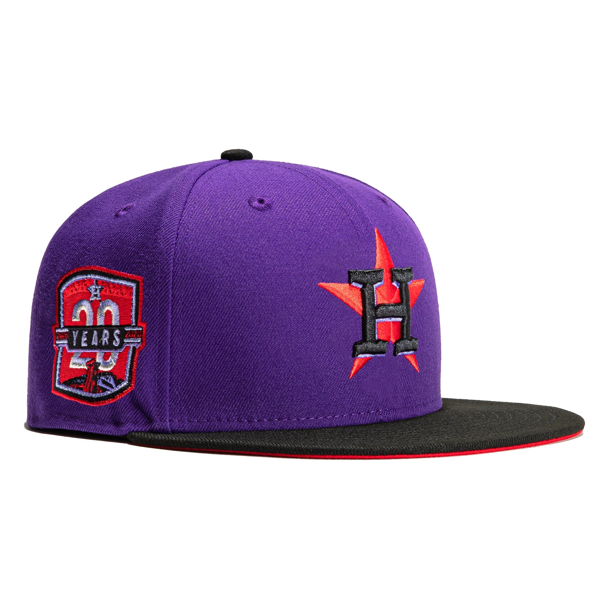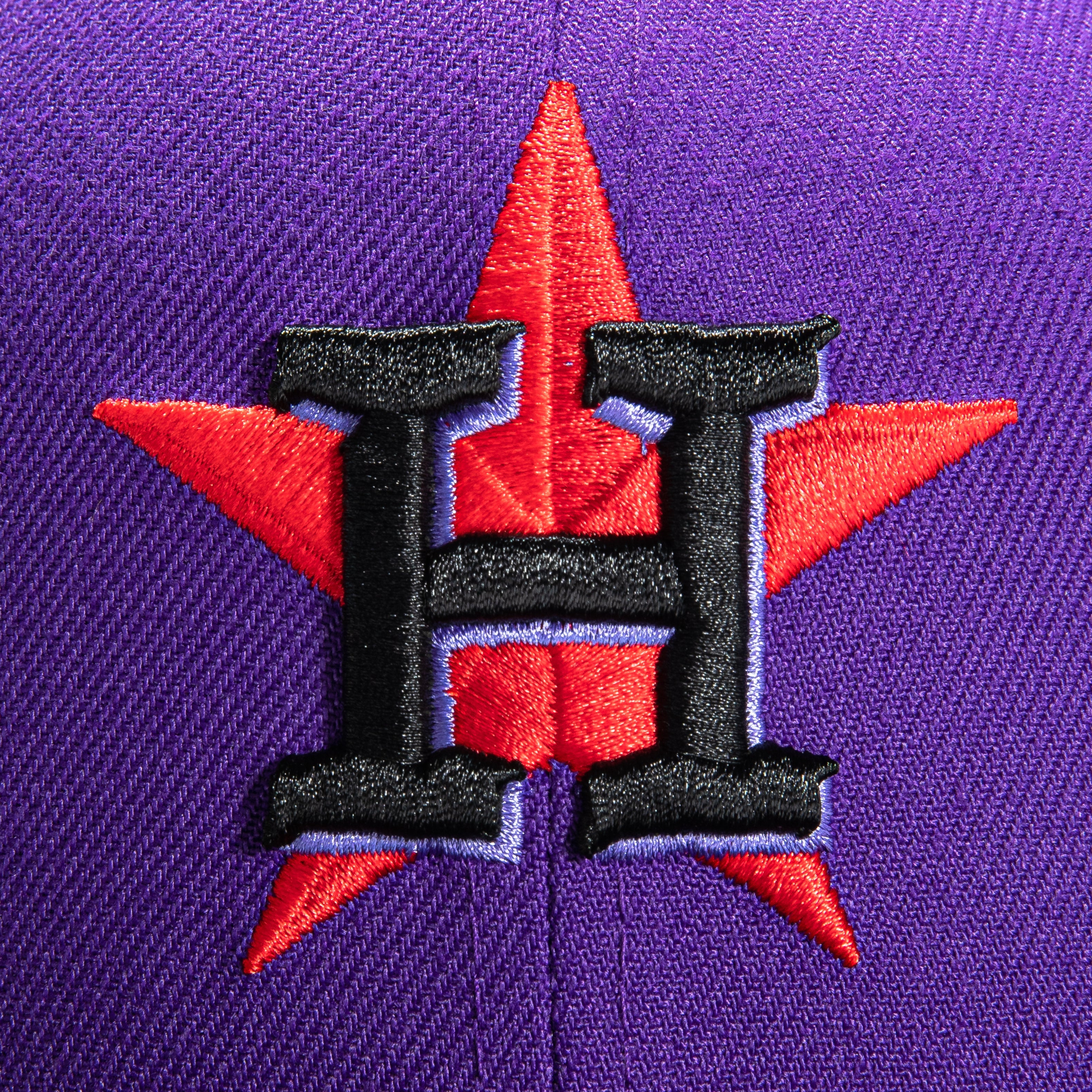This New Era T-Dot Houston Astros 20th Anniversary 59FIFTY Fitted Hat is a Hat Club exclusive. It features a purple six panel structured high crown and embroidered eyelets with a black fabric squatchee button. The fitted cap has a black flat bill with a red undervisor. The front panel features the Houston Astros logo embroidery and a side patch embroidery on the right panel. The left panel of the fitted displays the New Era logo and the official MLB logo embroidery on the rear crown.