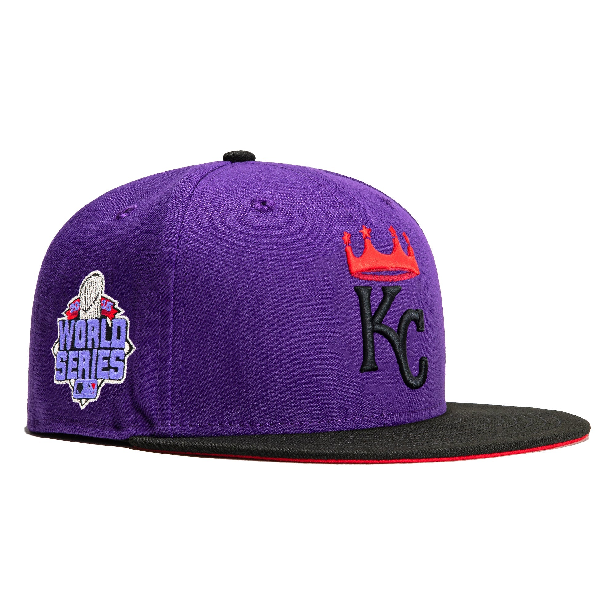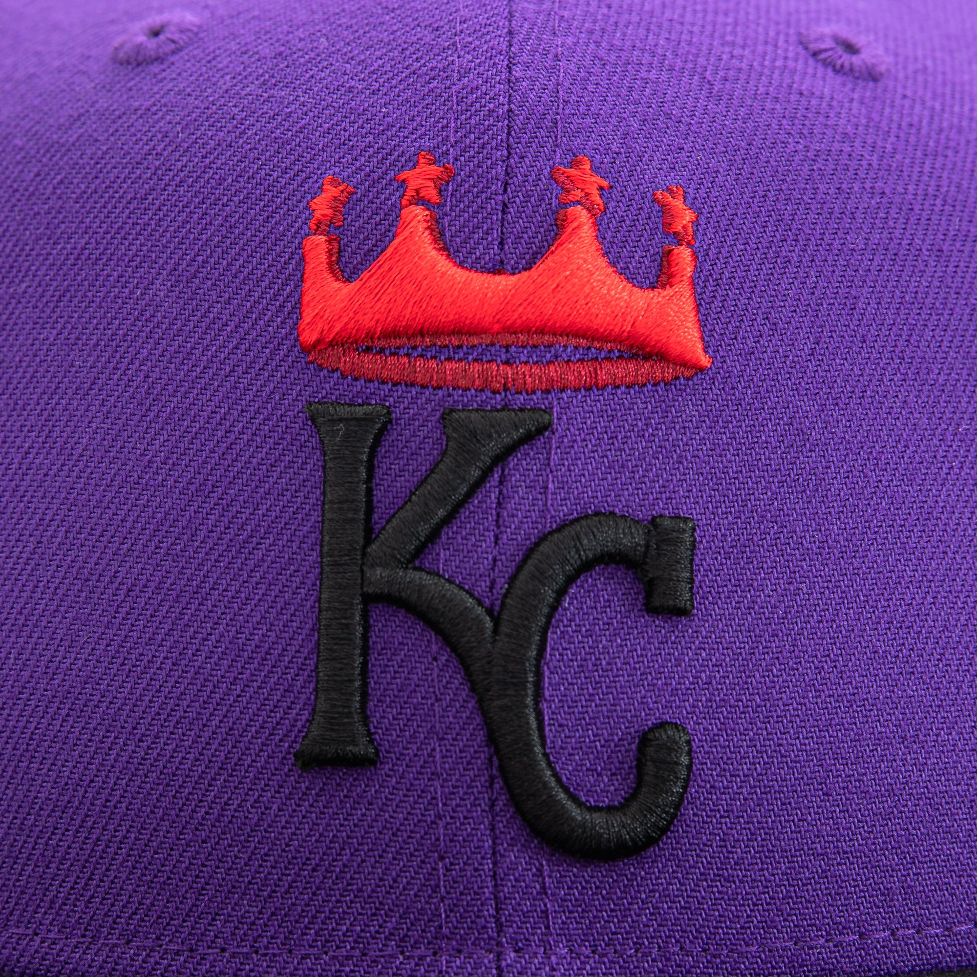 This New Era T-Dot Kansas City Royals 40th Anniversary 59FIFTY Fitted Hat is a Hat Club exclusive. It features a purple six panel structured high crown and embroidered eyelets with a black fabric squatchee button. The fitted cap has a black flat bill with a red undervisor. The front panel features the Kansas City Royals logo embroidery and a side patch embroidery on the right panel. The left panel of the fitted displays the New Era logo and the official MLB logo embroidery on the rear crown.