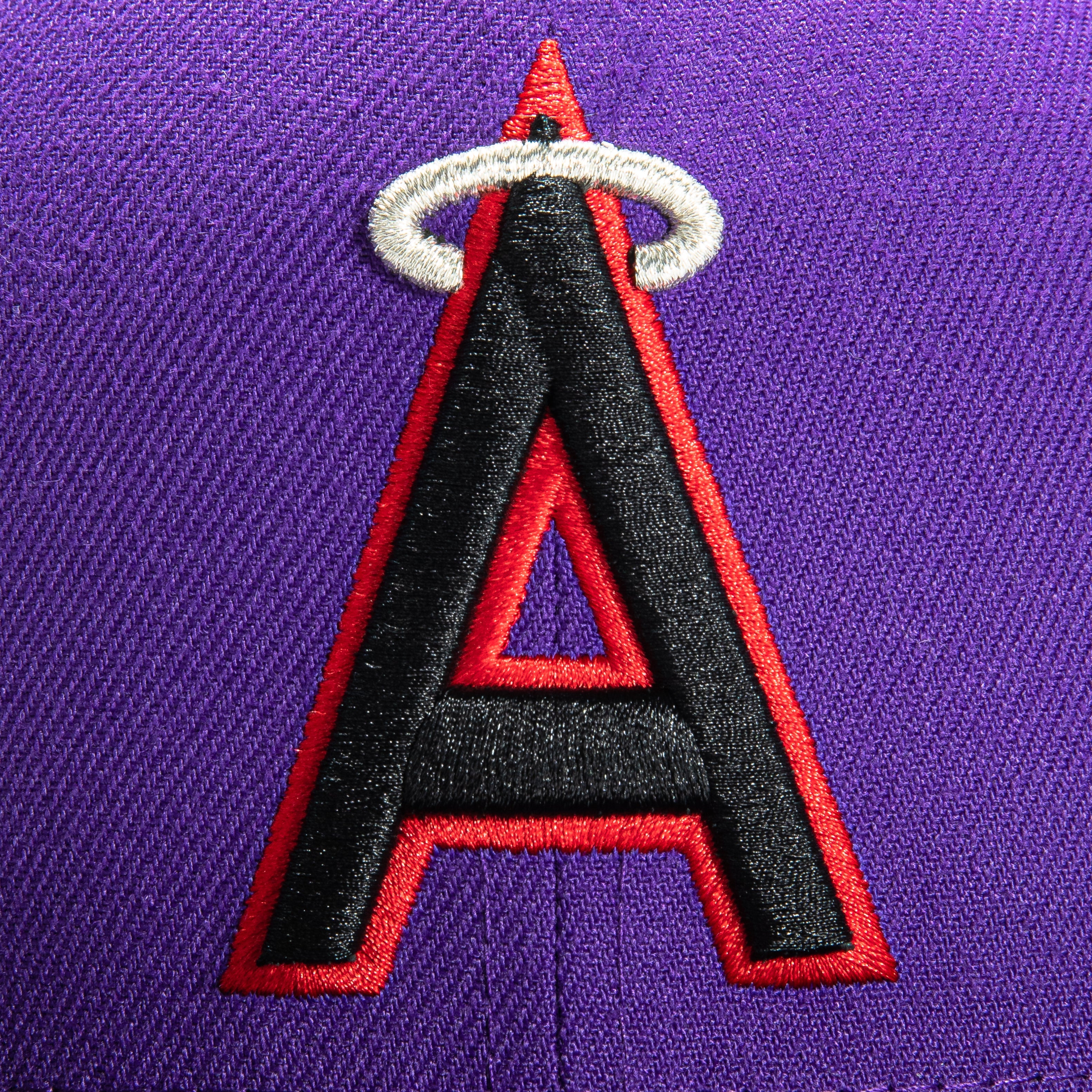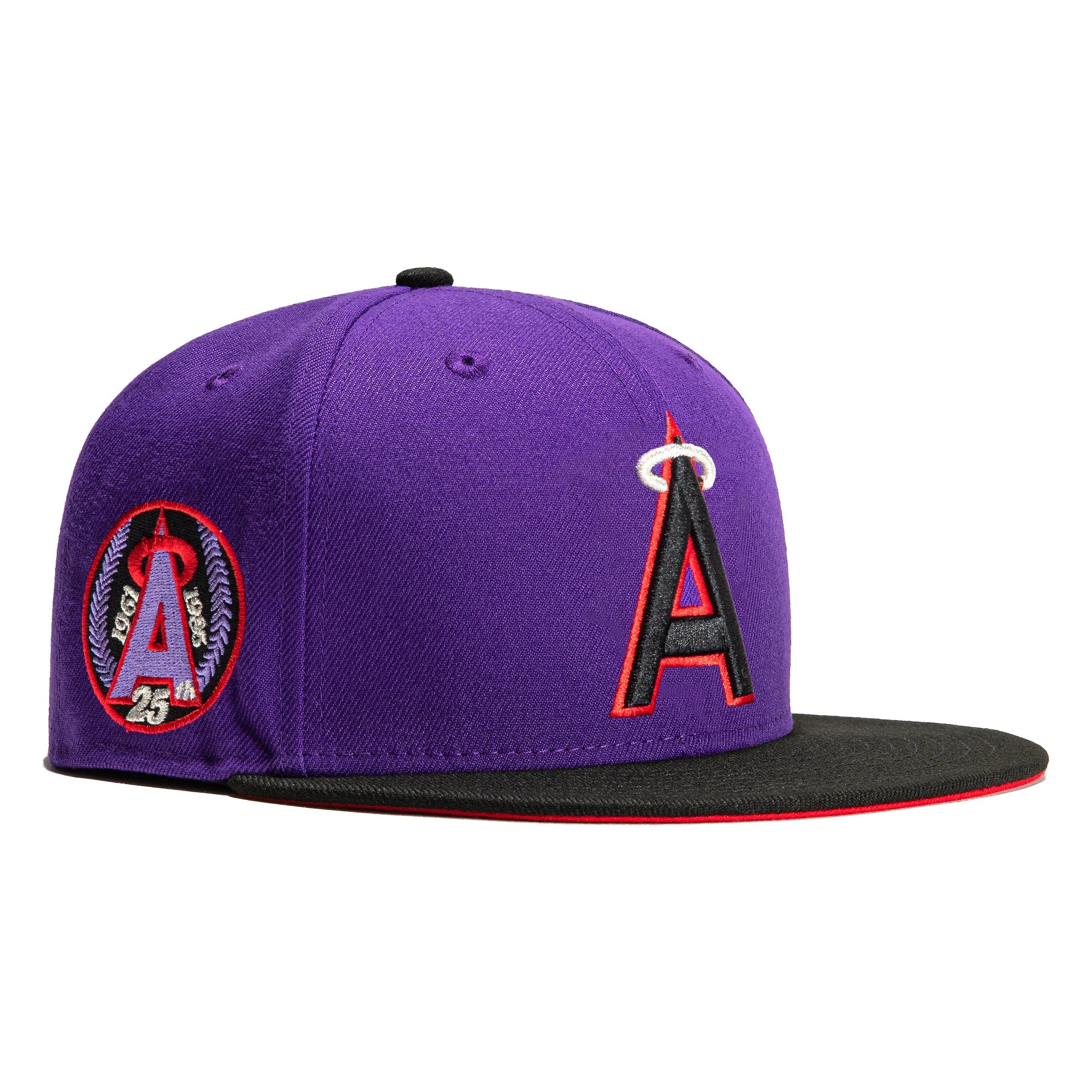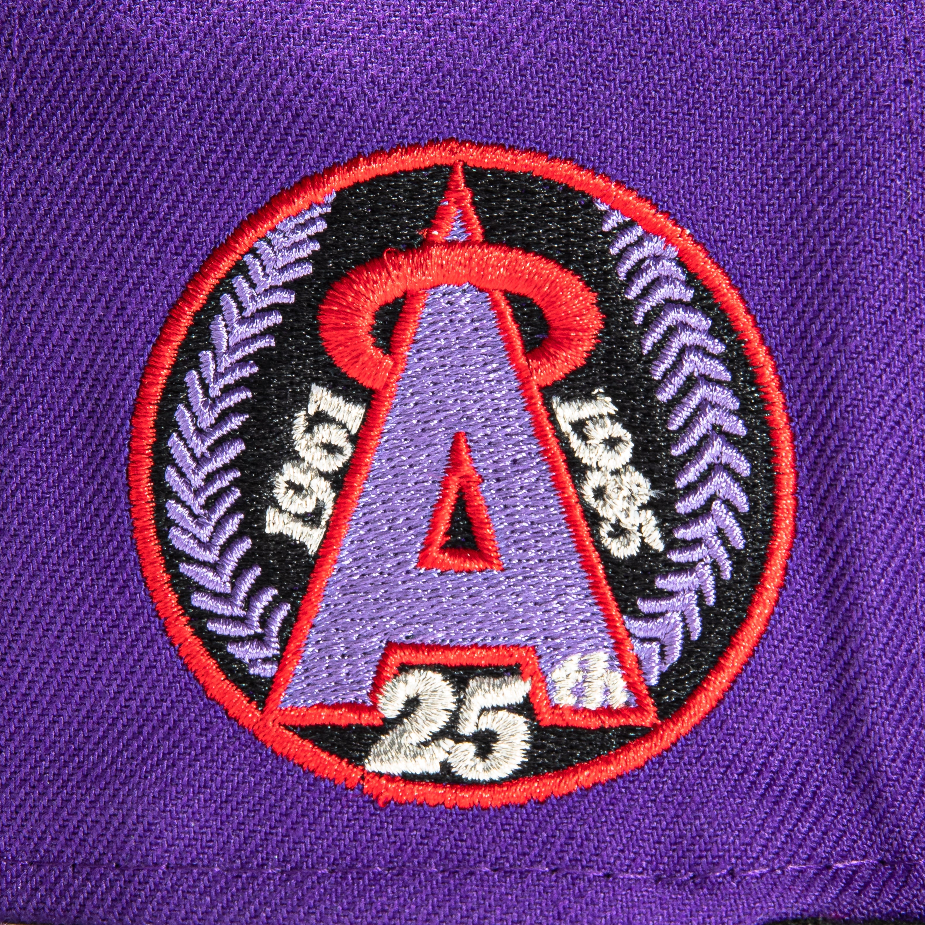 This New Era T-Dot Los Angeles Angels 25th Anniversary 59FIFTY Fitted Hat is a Hat Club exclusive. It features a purple six panel structured high crown and embroidered eyelets with a black fabric squatchee button. The fitted cap has a black flat bill with a red undervisor. The front panel features the Los Angeles Angels logo embroidery and a side patch embroidery on the right panel. The left panel of the fitted displays the New Era logo and the official MLB logo embroidery on the rear crown.