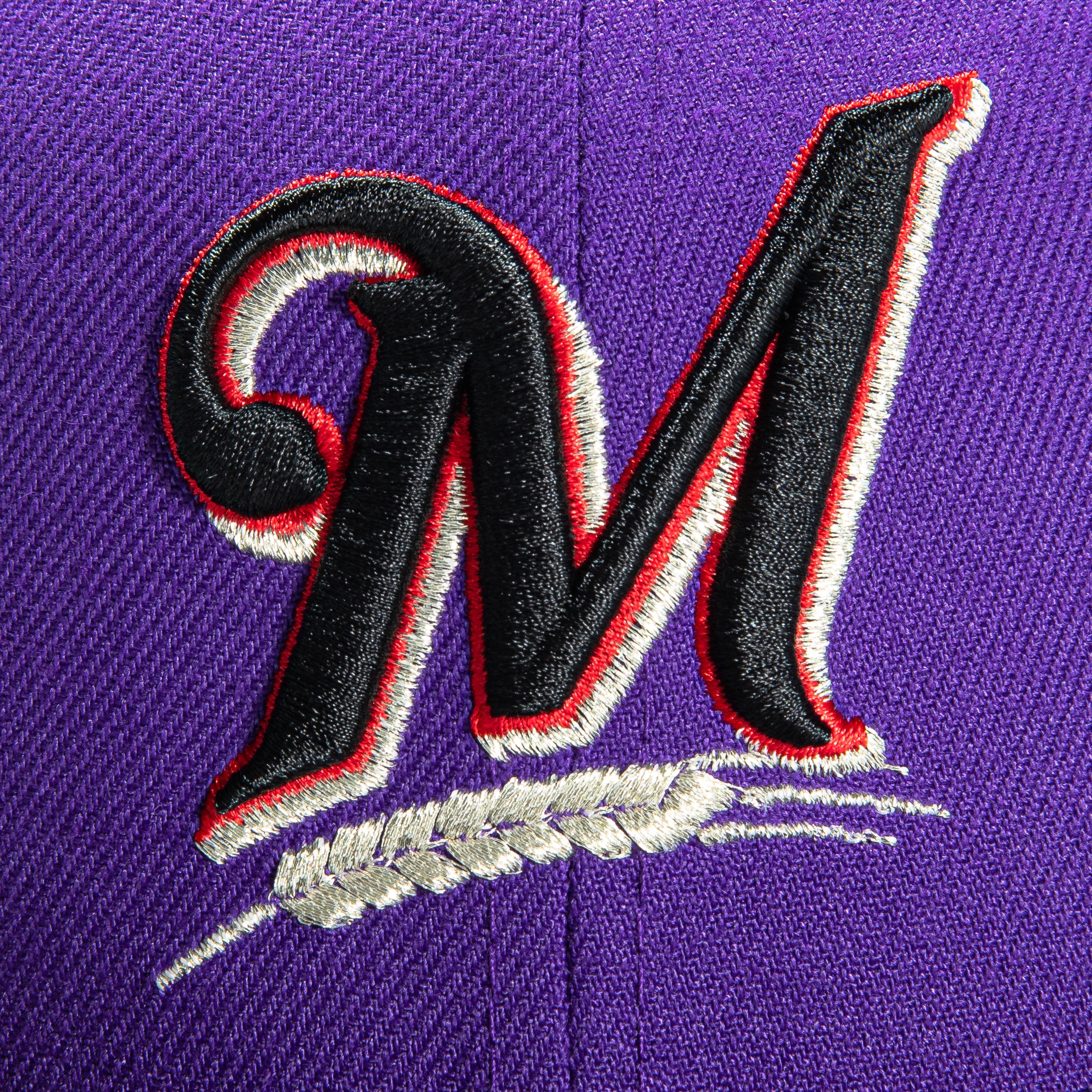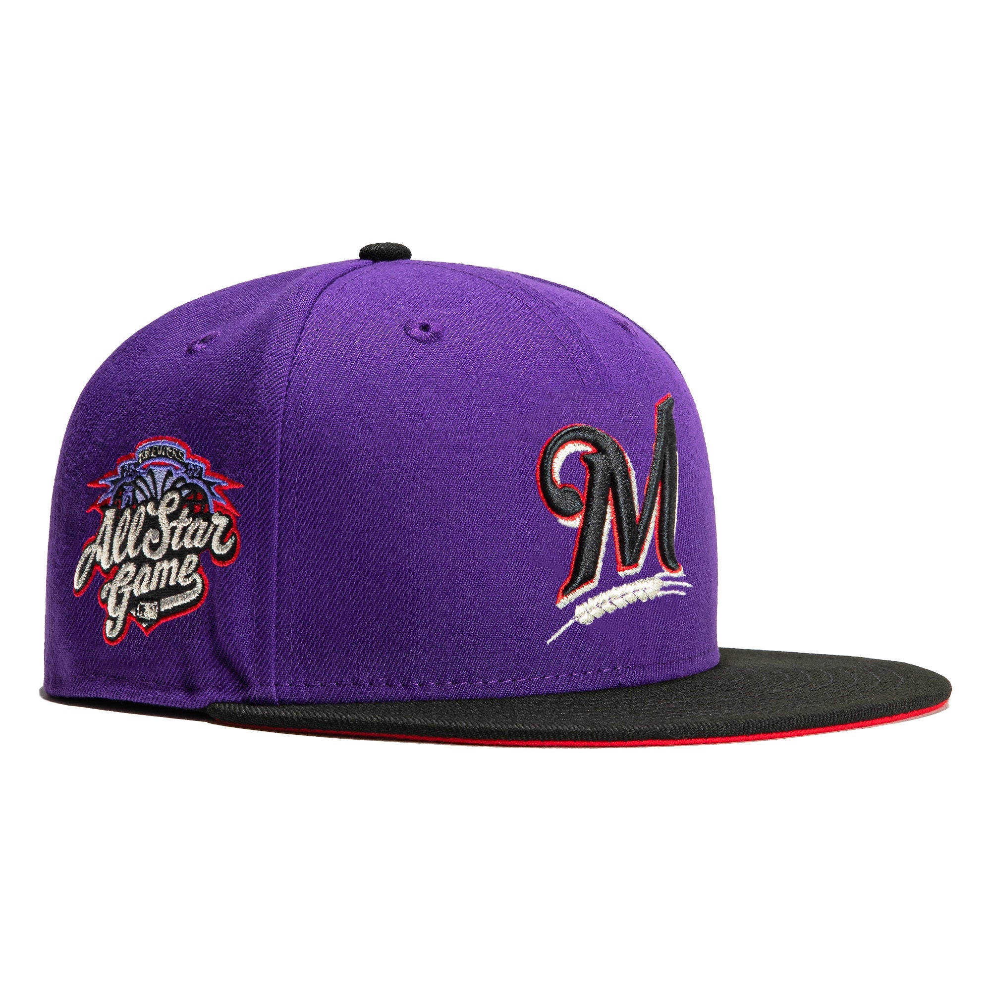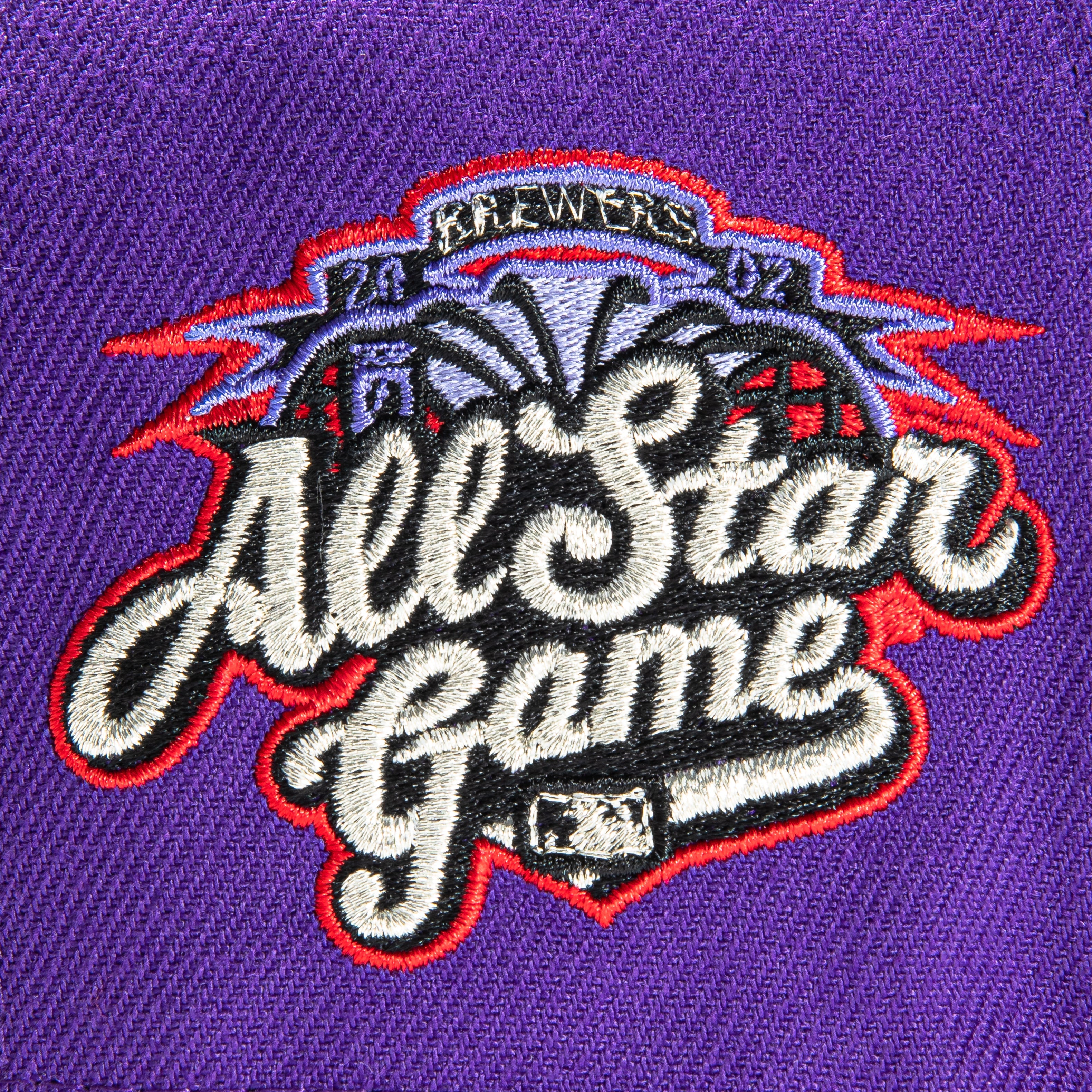 This New Era T-Dot Milwaukee Brewers 2002 All-Star Game 59FIFTY Fitted Hat is a Hat Club exclusive. It features a purple six panel structured high crown and embroidered eyelets with a black fabric squatchee button. The fitted cap has a black flat bill with a red undervisor. The front panel features the Milwaukee Brewers logo embroidery and a  side patch embroidery on the right panel. The left panel of the fitted displays the New Era logo and the official MLB logo embroidery on the rear crown.