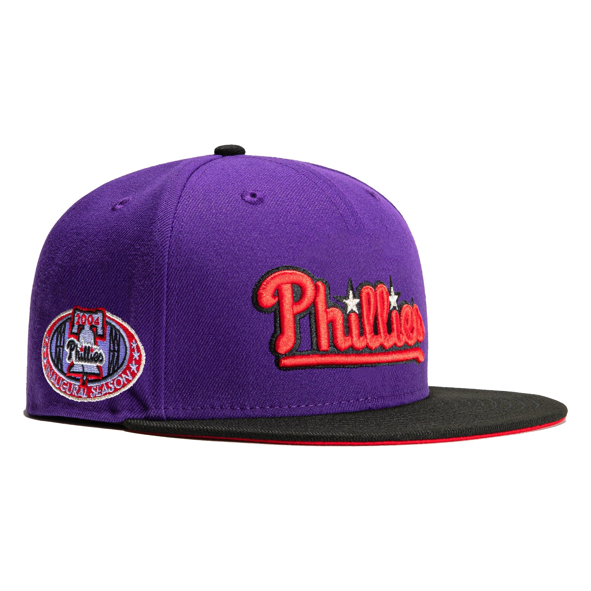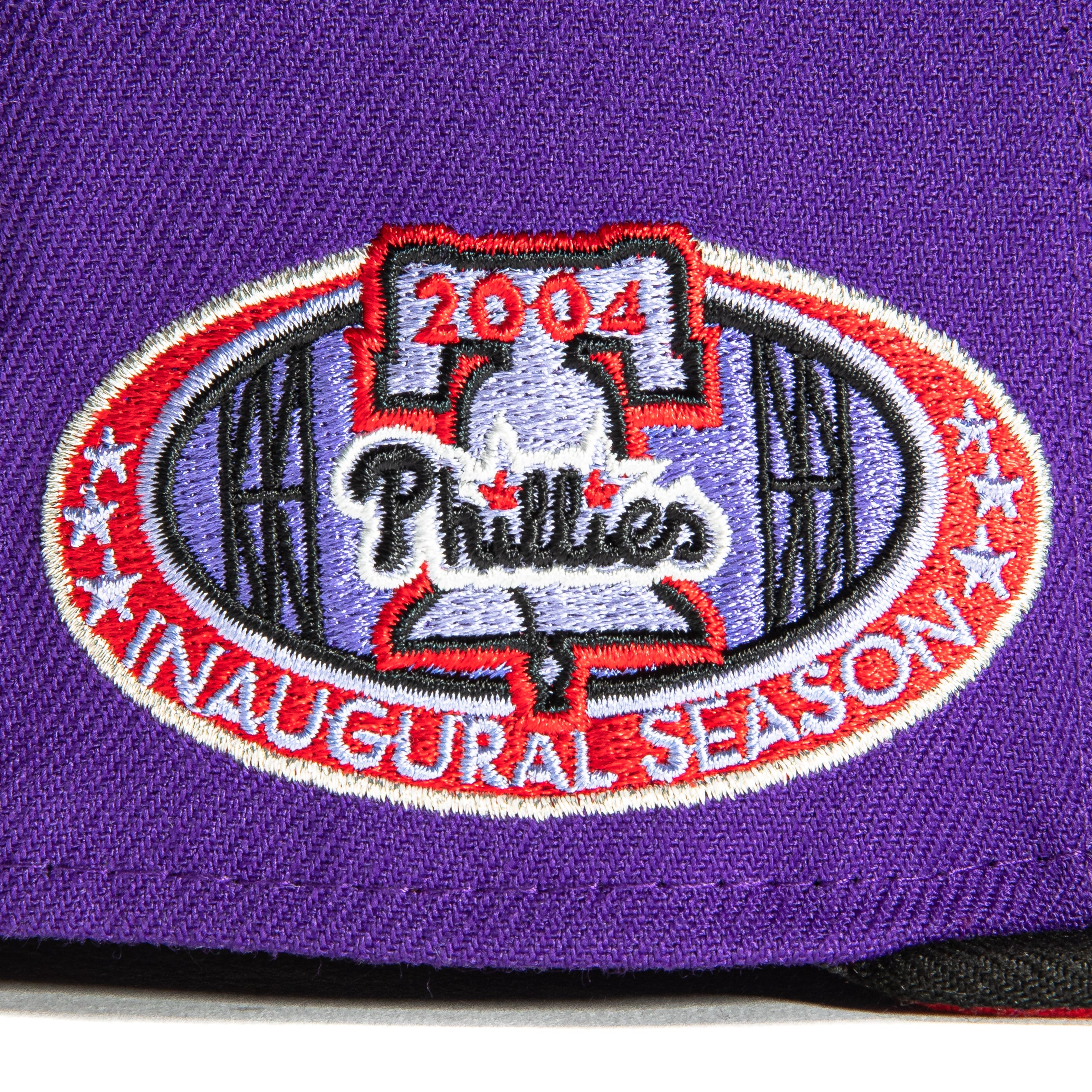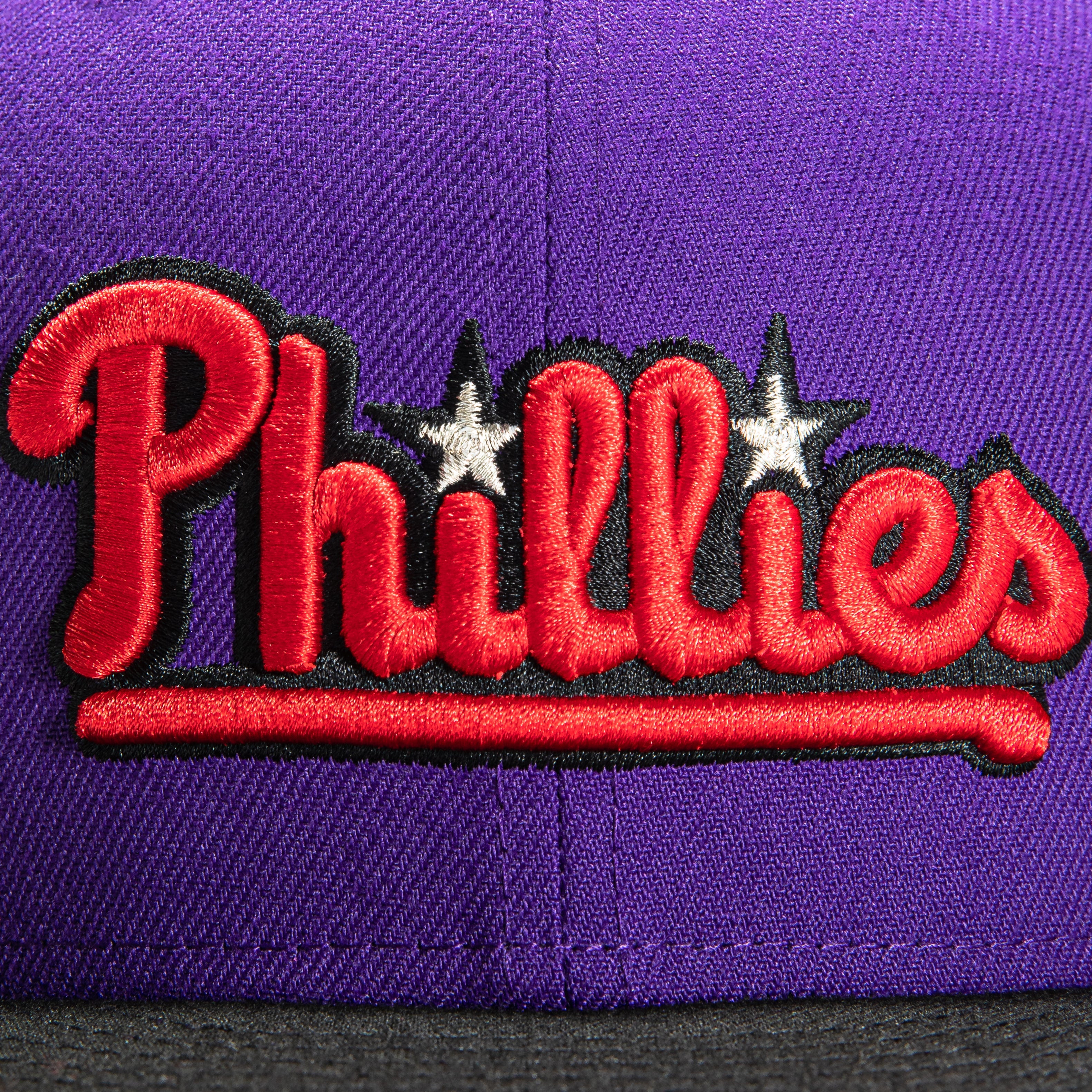 This New Era T-Dot Philadelphia Phillies 1996 All-Star Game 59FIFTY Fitted Hat is a Hat Club exclusive. It features a purple six panel structured high crown and embroidered eyelets with a black fabric squatchee button. The fitted cap has a black flat bill with a red undervisor. The front panel features the Philadelphia Phillies logo embroidery and a side patch embroidery on the right panel. The left panel of the fitted displays the New Era logo and the official MLB logo embroidery on the rear crown.