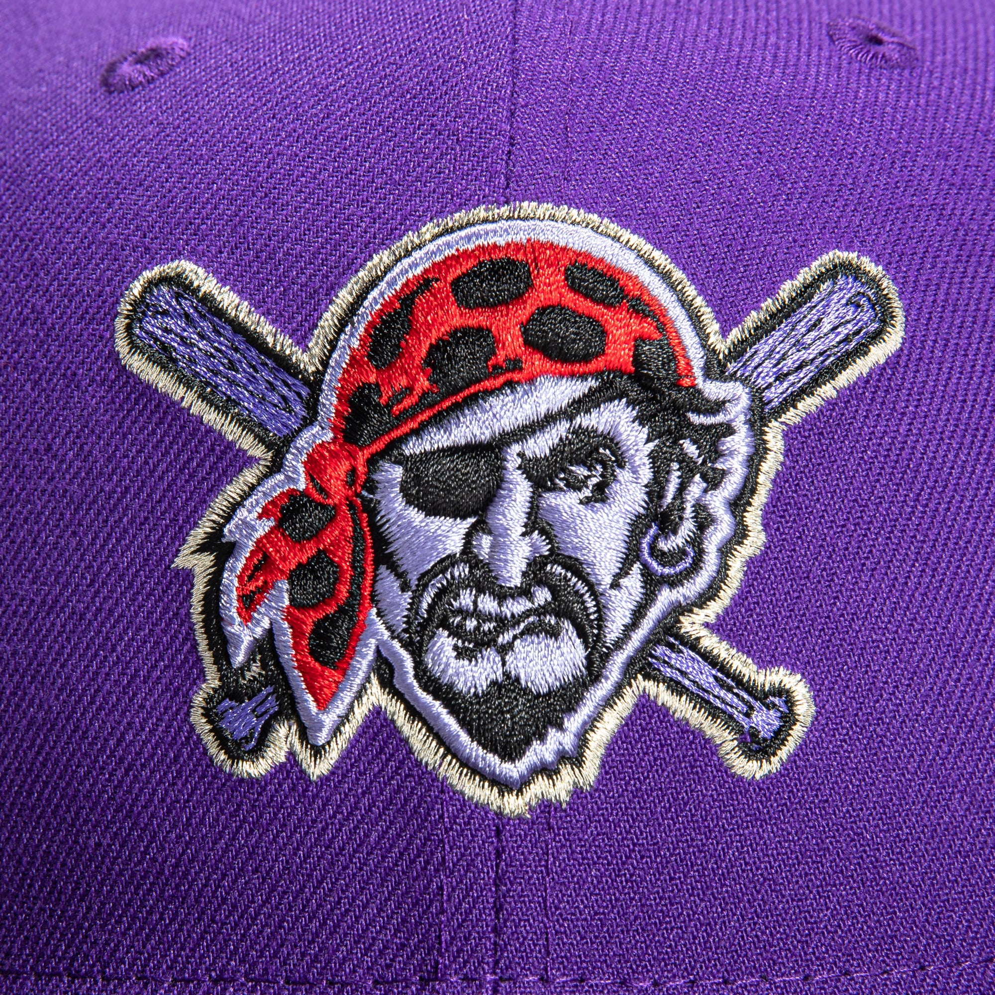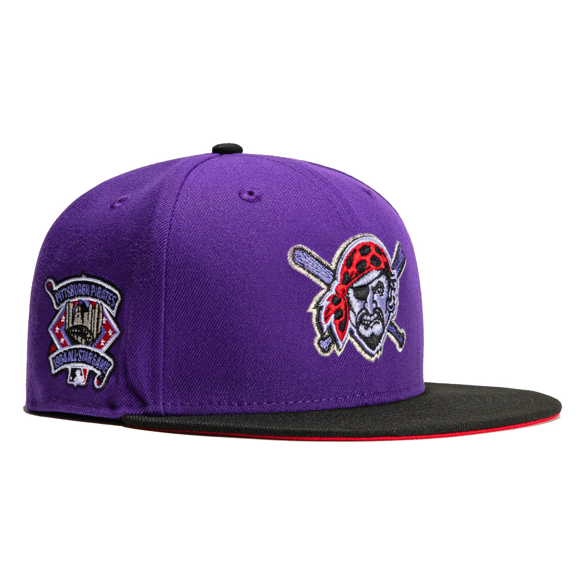 This New Era T-Dot Pittsburgh Pirates 1994 All-Star Game 59FIFTY Fitted Hat is a Hat Club exclusive. It features a purple six panel structured high crown and embroidered eyelets with a black fabric squatchee button. The fitted cap has a black flat bill with a red undervisor. The front panel features the Pittsburgh Pirates logo embroidery and a  side patch embroidery on the right panel. The left panel of the fitted displays the New Era logo and the official MLB logo embroidery on the rear crown.