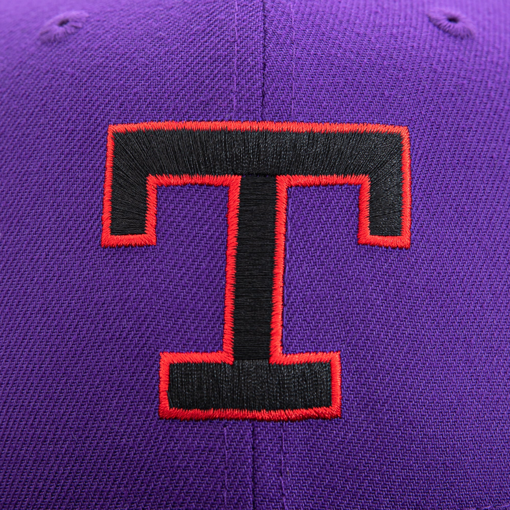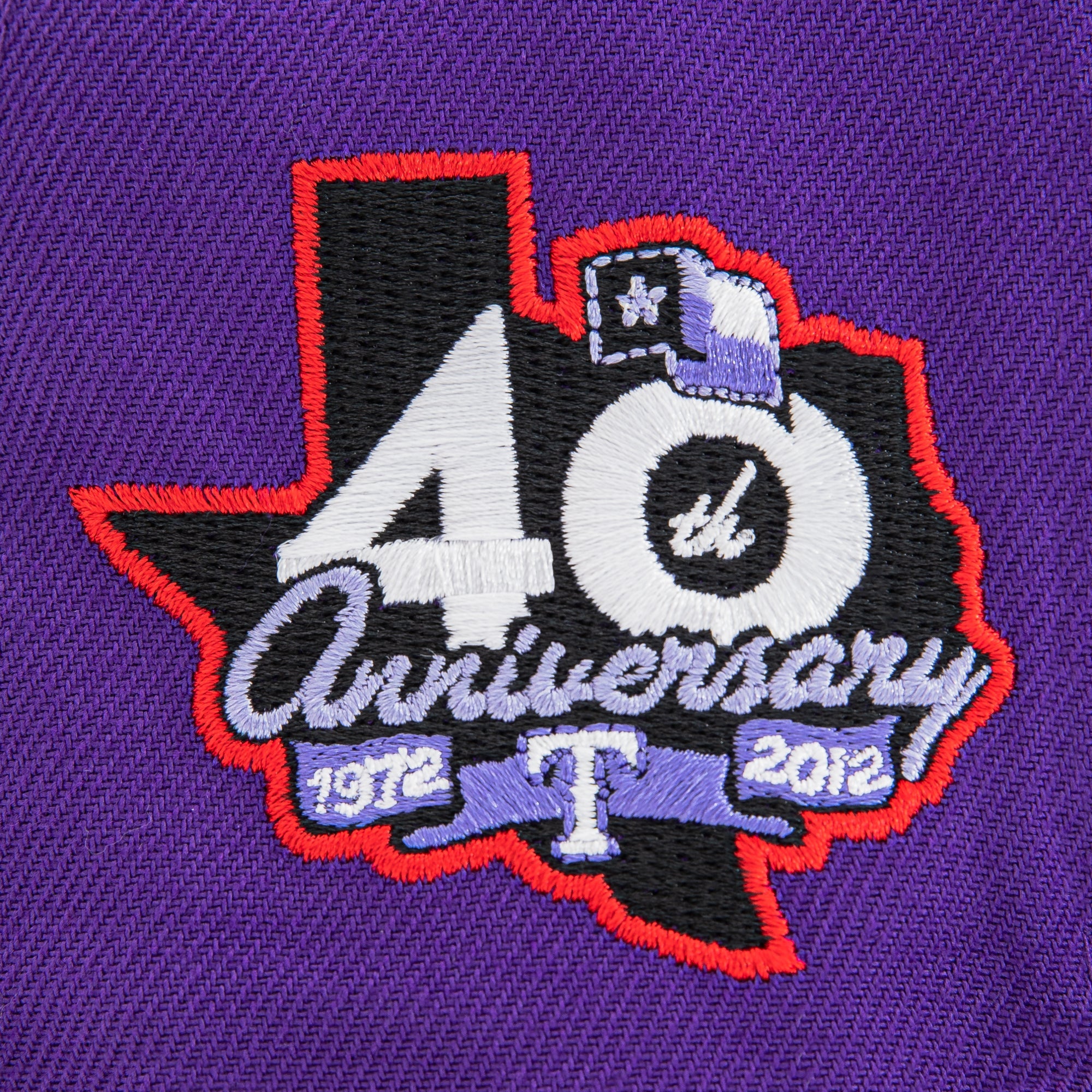 This New Era T-Dot Texas Rangers 40th Anniversary 59FIFTY Fitted Hat is a Hat Club exclusive. It features a purple six panel structured high crown and embroidered eyelets with a black fabric squatchee button. The fitted cap has a black flat bill with a red undervisor. The front panel features the Texas Rangers logo embroidery and a  side patch embroidery on the right panel. The left panel of the fitted displays the New Era logo and the official MLB logo embroidery on the rear crown.