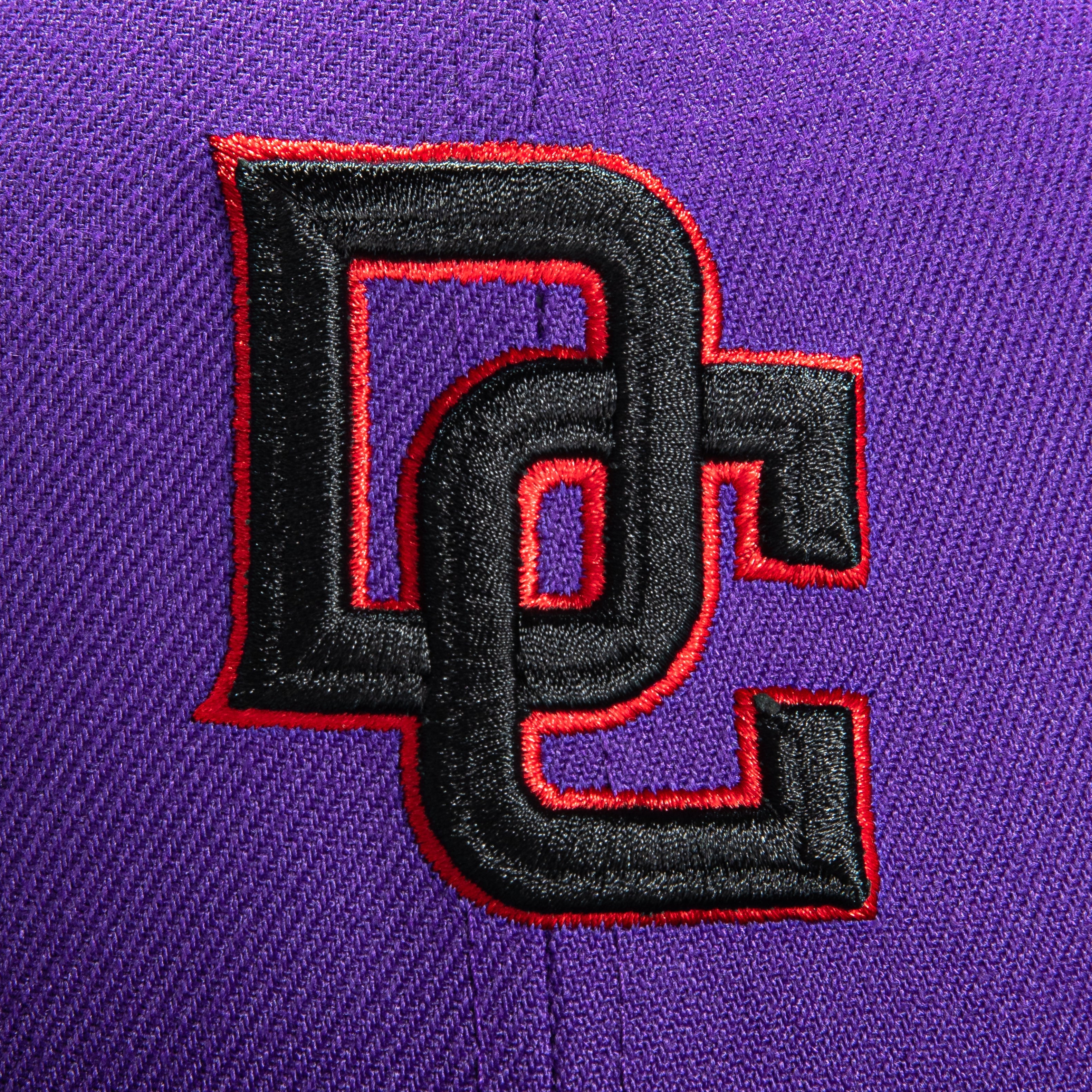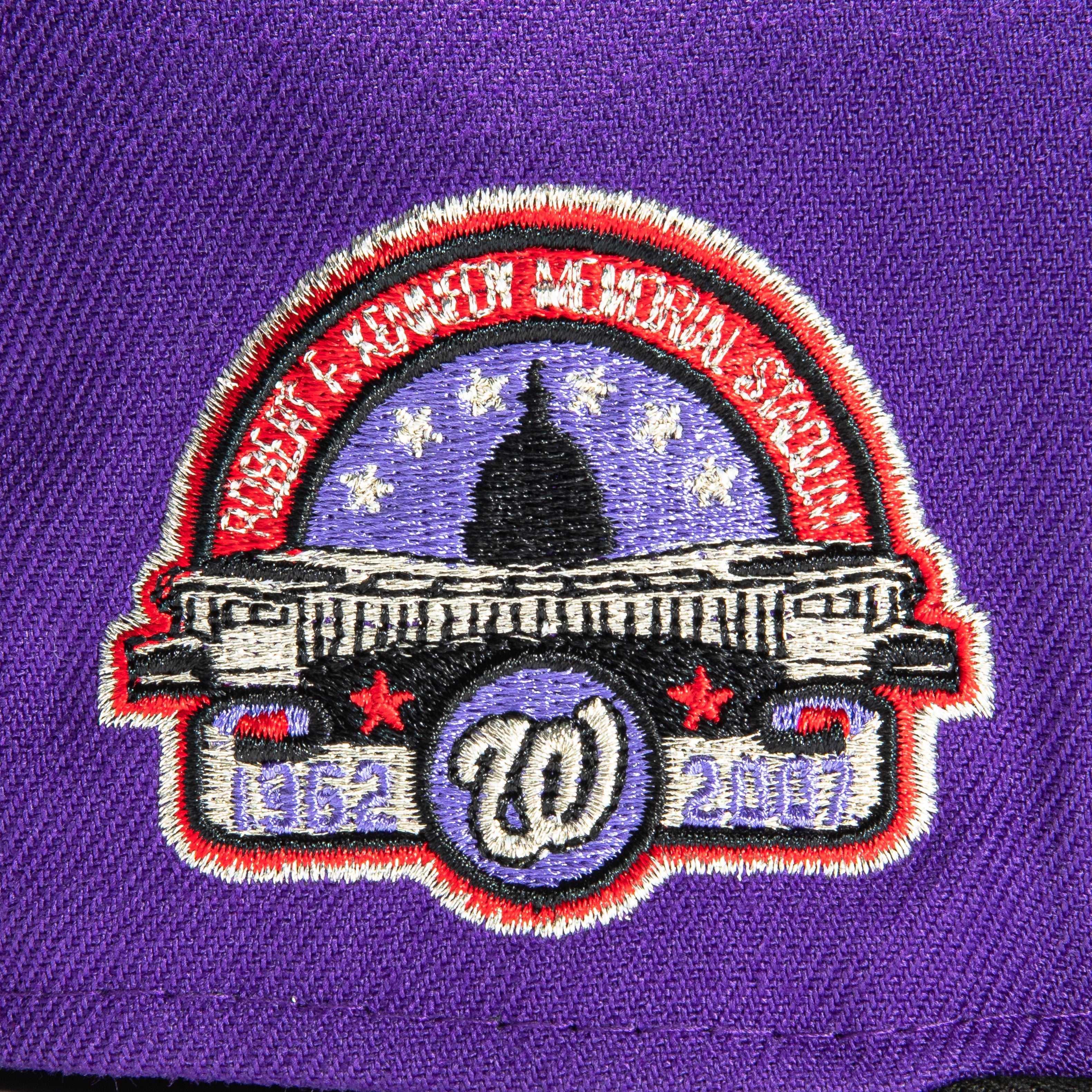 This New Era T-Dot Washington Nationals RFK Stadium 59FIFTY Fitted Hat is a Hat Club exclusive. It features a purple six panel structured high crown and embroidered eyelets with a black fabric squatchee button. The fitted cap has a black flat bill with a red undervisor. The front panel features the Washington Nationals logo embroidery and a side patch embroidery on the right panel. The left panel of the fitted displays the New Era logo and the official MLB logo embroidery on the rear crown.