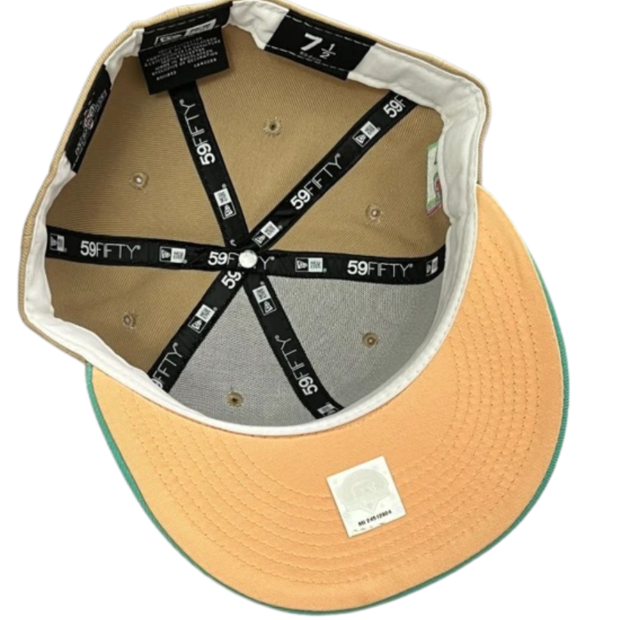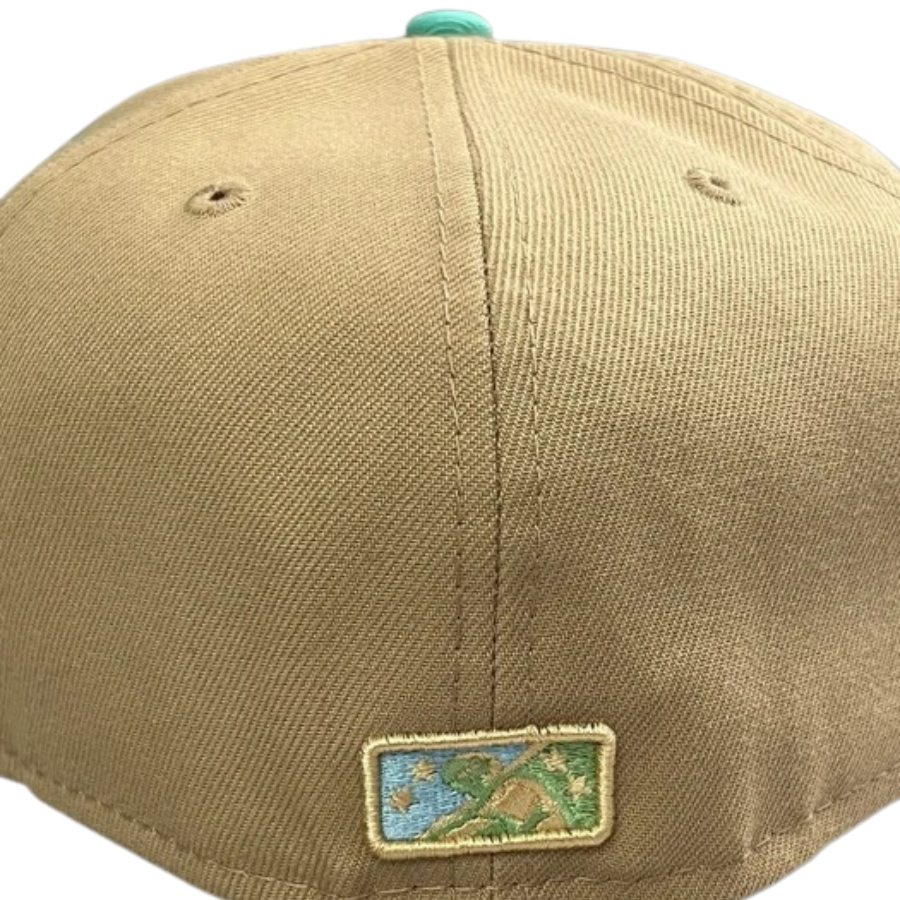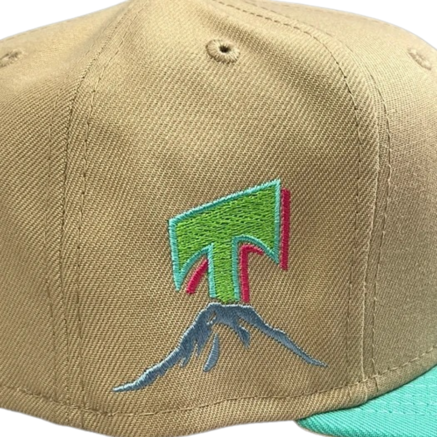 This New Era Tacoma Rainers Rosalina Two Tone 59FIFTY Fitted Cap is a My Fitteds exclusive. The fitted features a tan six panel structured high crown, and embroidered eyelets with a teal fabric squatchee button and flat bill. The undervisor of the fitted is peach with a white sweatband.