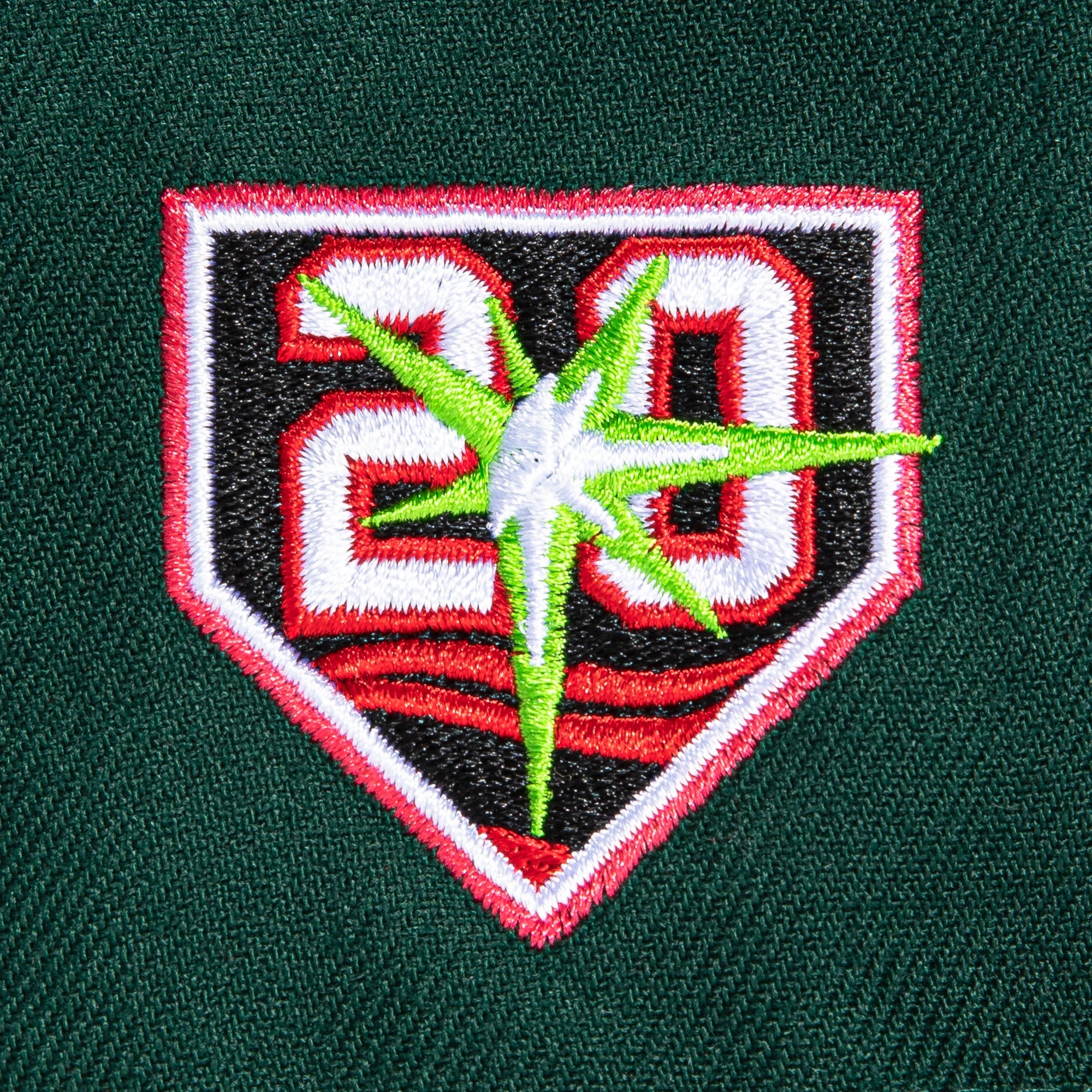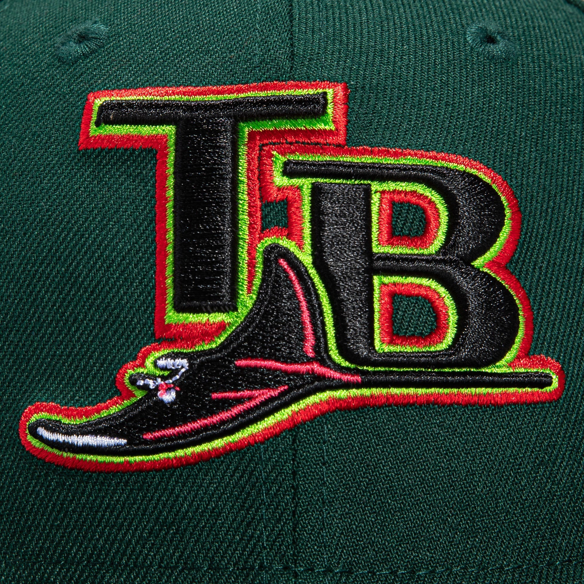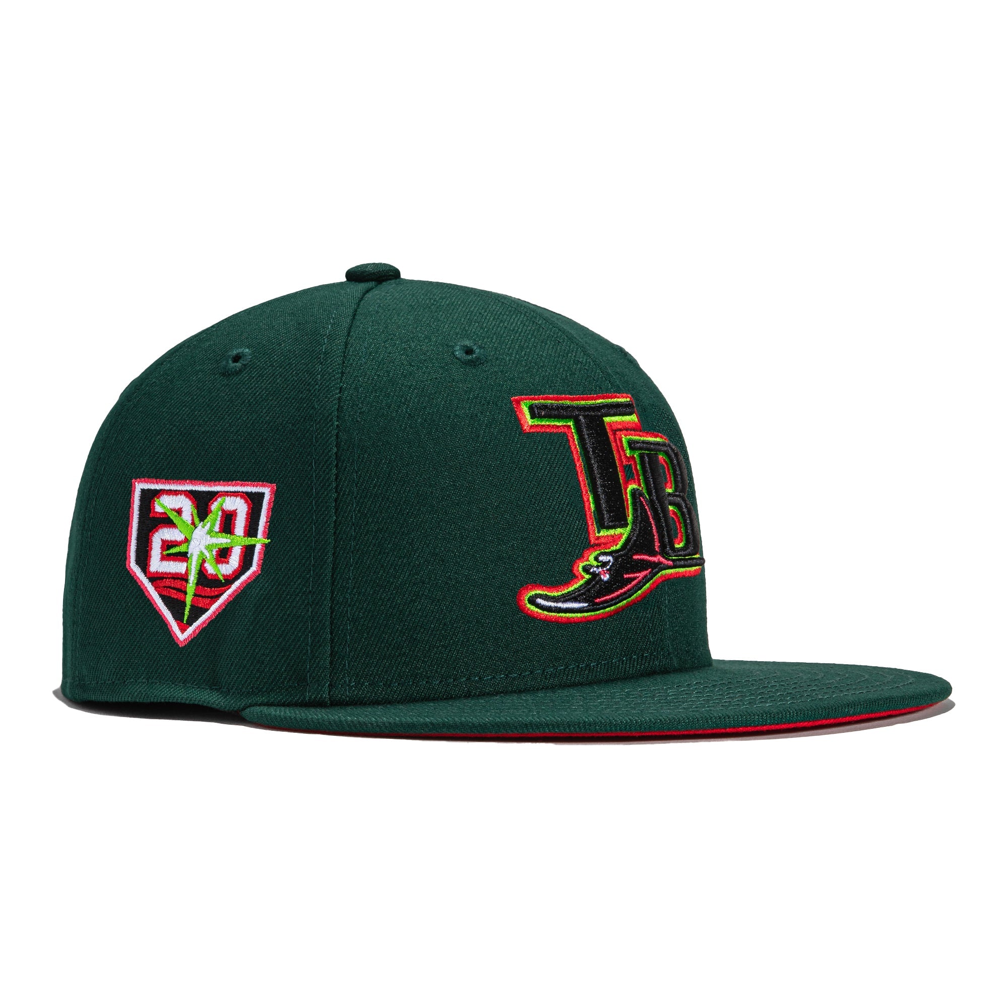 This New Era Tampa Bay Devil Rays 20th Anniversary 'Watermelon' 59FIFTY Fitted Hat was originally released by Hat Club. The fitted has a dark green six panel structured high crown, embroidered eyelets and fabric squatchee button. The flat bill of the fitted cap is also dark green with a red bottom undervisor. The front panel features the Tampa Bay Devil Rays logo embroidery and a side patch embroidered on the right panel. The left panel of the fitted displays the New Era logo and the official MLB insignia embroidered on the rear crown. The fitted hat colorway is inspired by the colors of a watermelon.