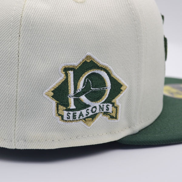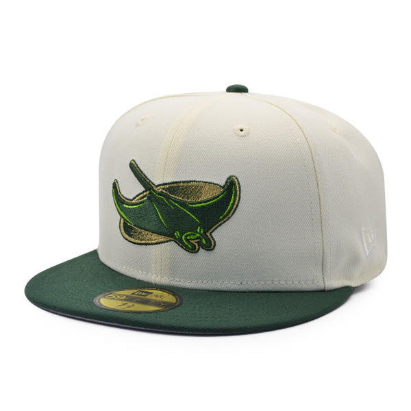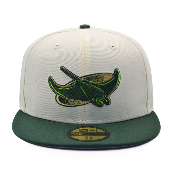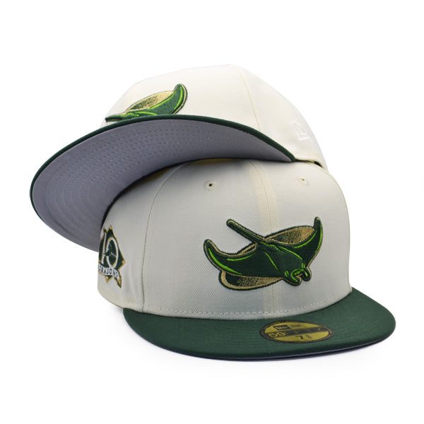 This New Era Tampa Bay Devil Rays White/Pine/Gold 10 Season 59FIFTY Fitted Hat was released by Hat Dreams. The fitted has a white six panel structured high crown and embroidered eyelets with a pine green fabric squatchee button. The flat bill of the fitted cap is also pine green with a grey bottom undervisor. The front panel features the Tampa Bay Devil Rays logo embroidery and a side patch embroidered on the right panel. The left panel of the fitted displays the New Era logo and the official MLB Batterman logo embroidered on the rear crown.