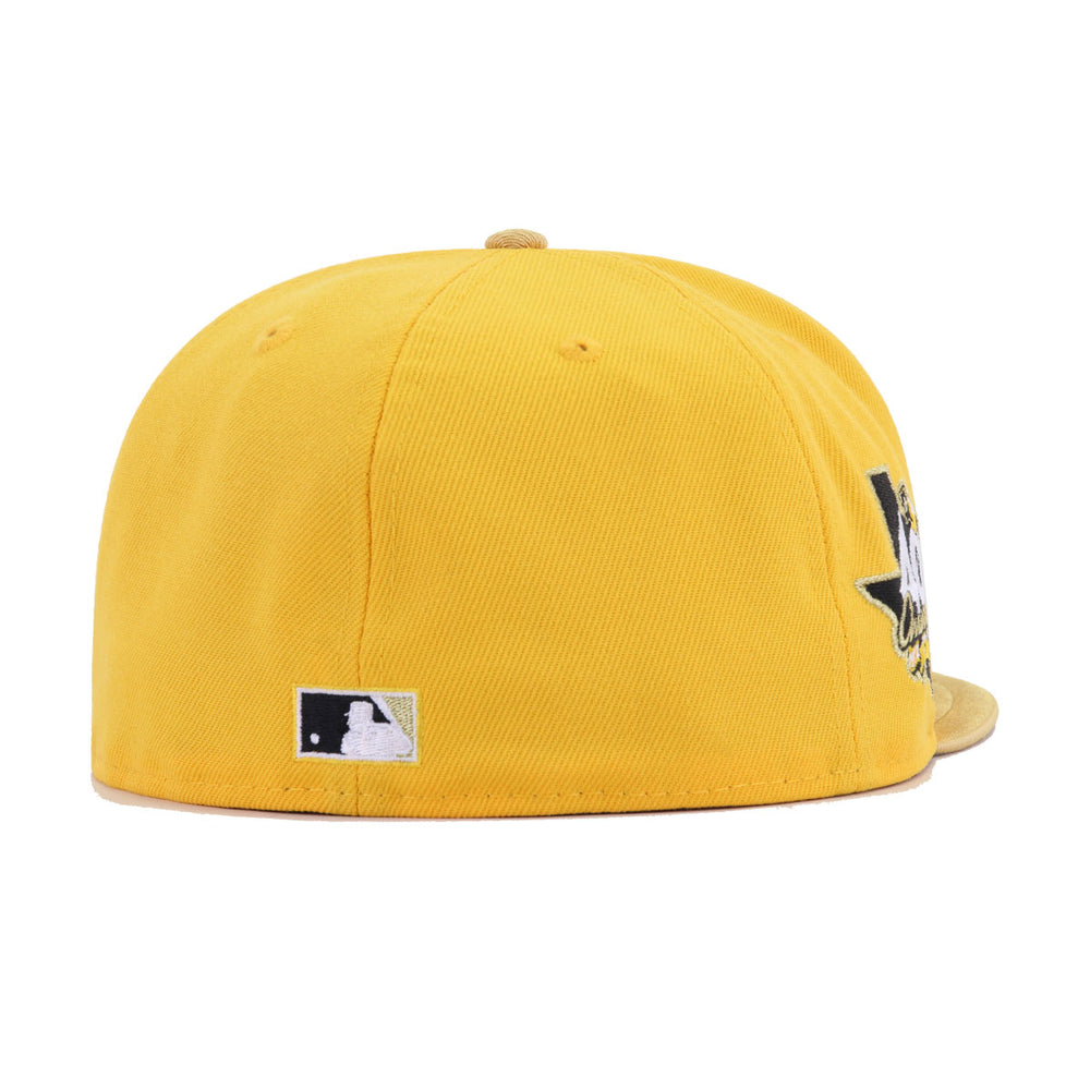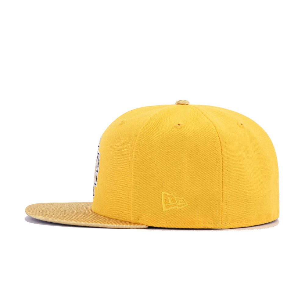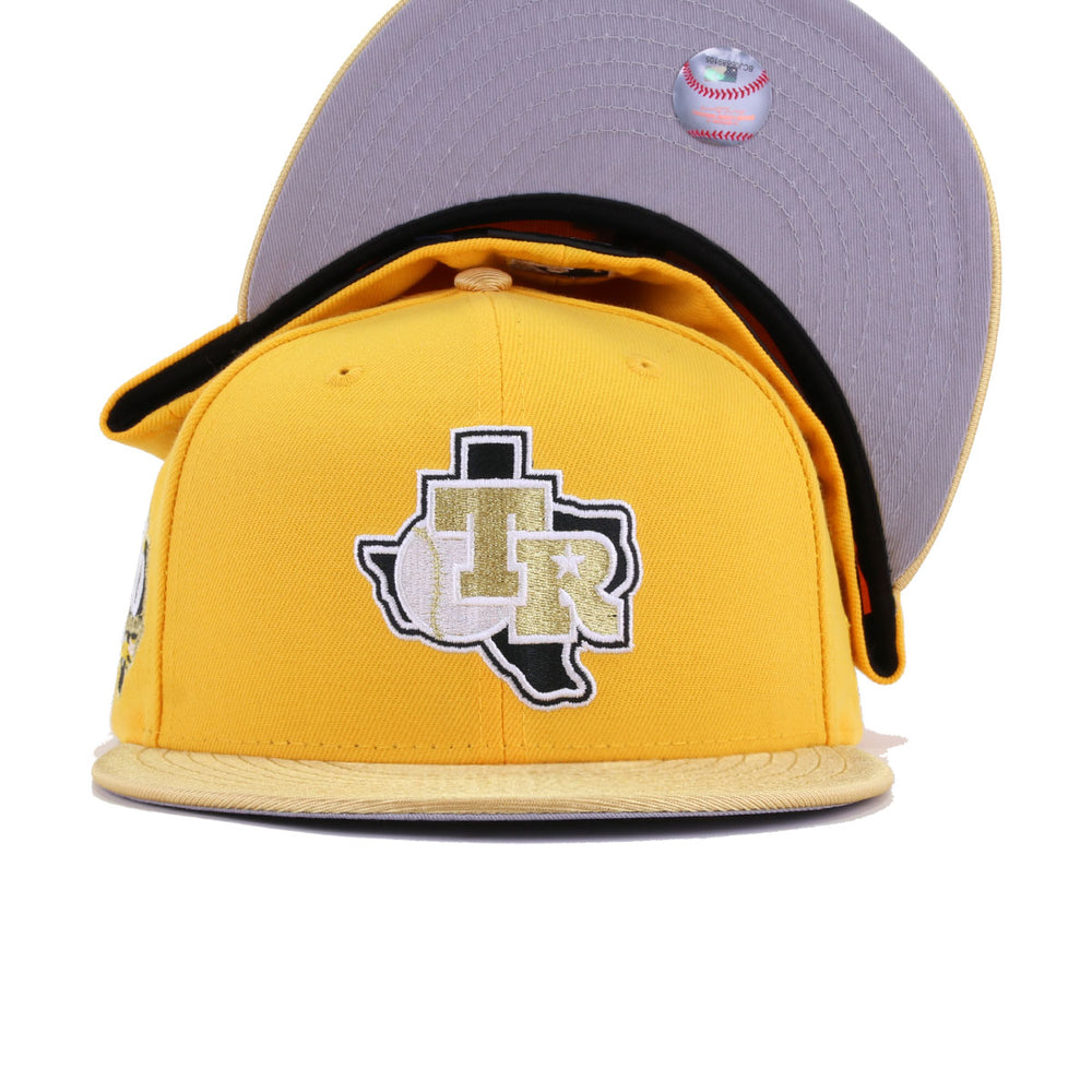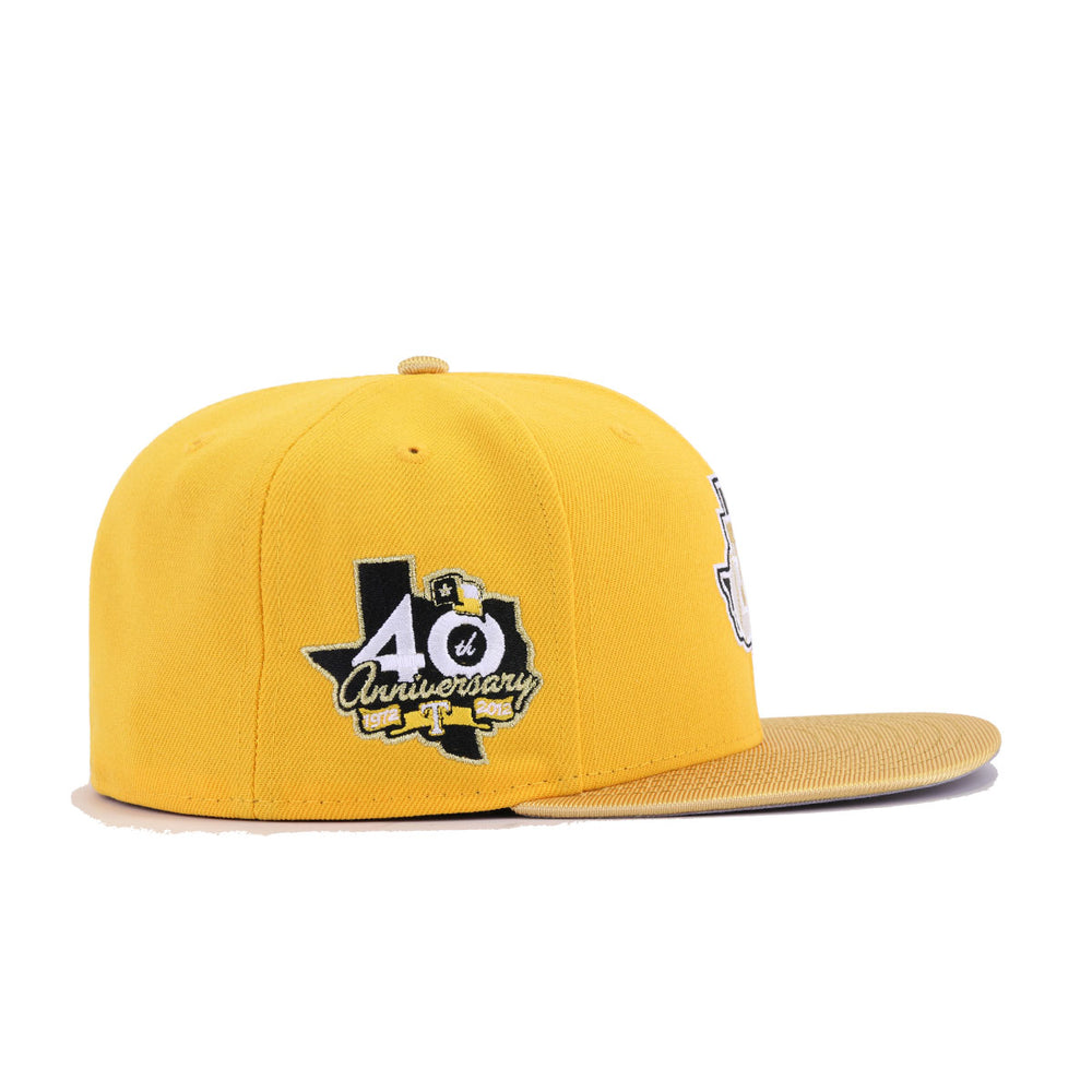 This New Era 59FIFTY Texas Rangers fitted hat was released by Hat Heaven. The fitted has a gold six panel structured high crown and embroidered eyelets with a metallic gold fabric squatchee button and flat bill. The fitted also has a grey bottom undervisor. The front panel features the Texas Rangers logo embroidery in black, metallic gold and white threads with a 40th Anniversary side patch on the right panel.