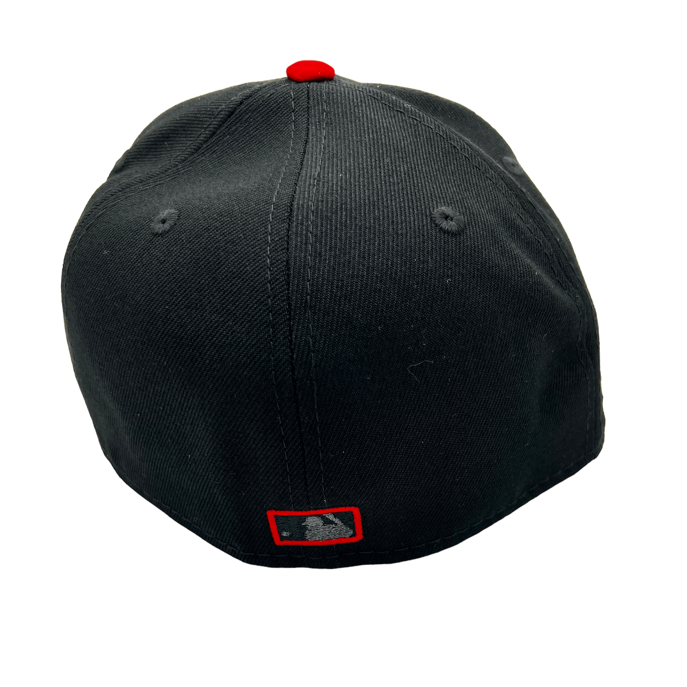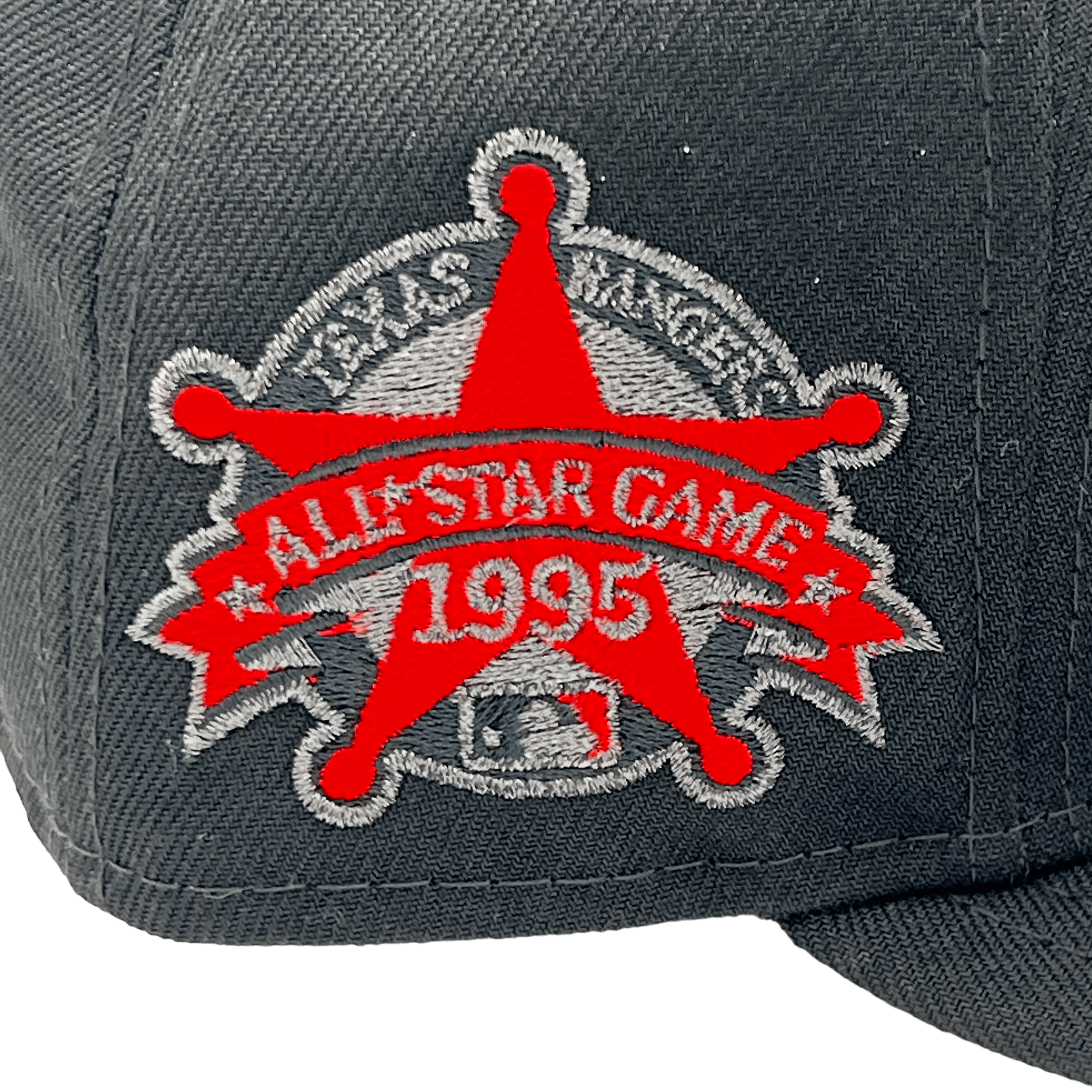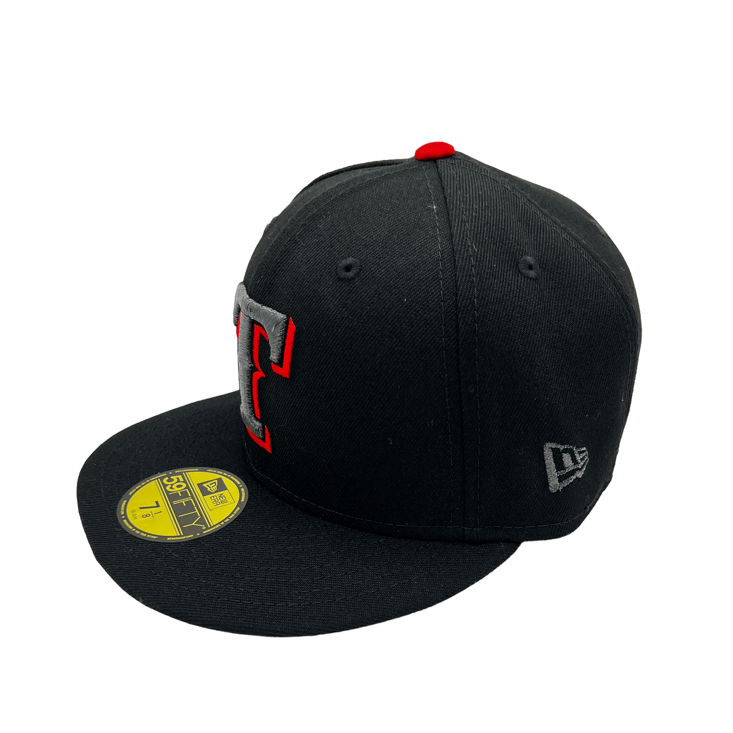 This Texas Rangers 59FIFTY fitted hat was released by Pro Image Sports. The fitted has a black six panel structured high crown, embroidered eyelets and flat brim with a red fabric squatchee button and red undervisor. The front panel features the Texas Rangers metallic logo embroidery with a matching side patch on the right panel. The left panel of the fitted displays the New Era logo and the official MLB Batterman embroidery on the rear crown.