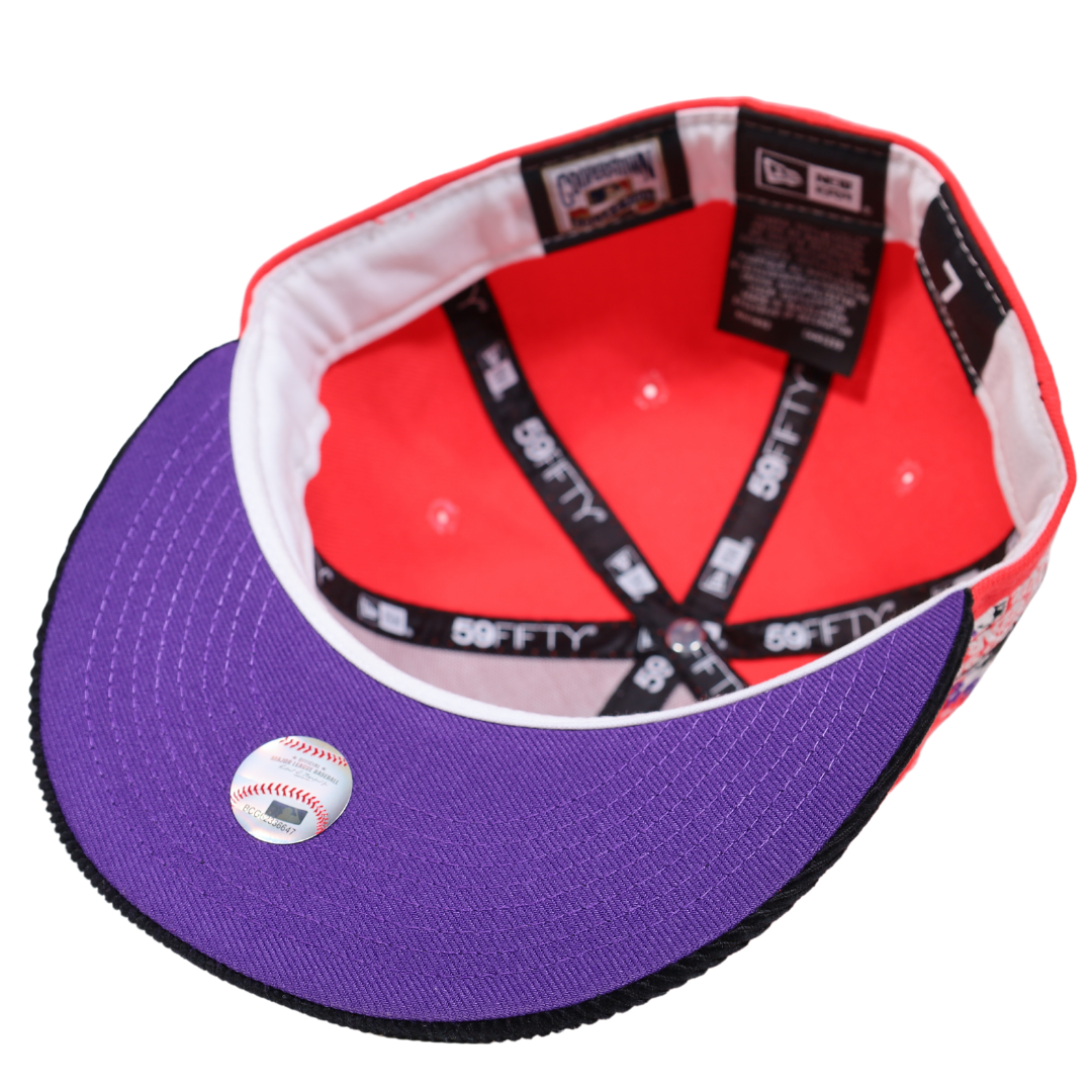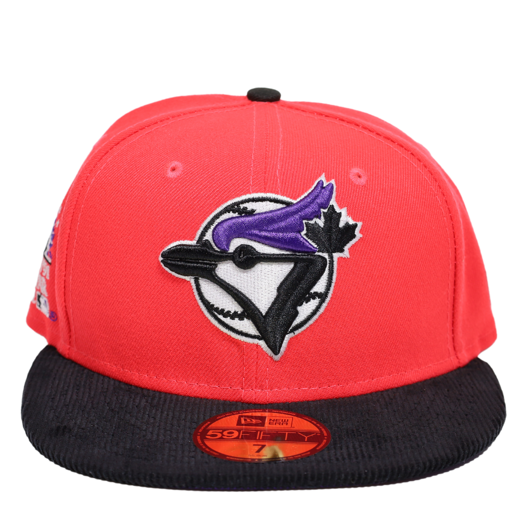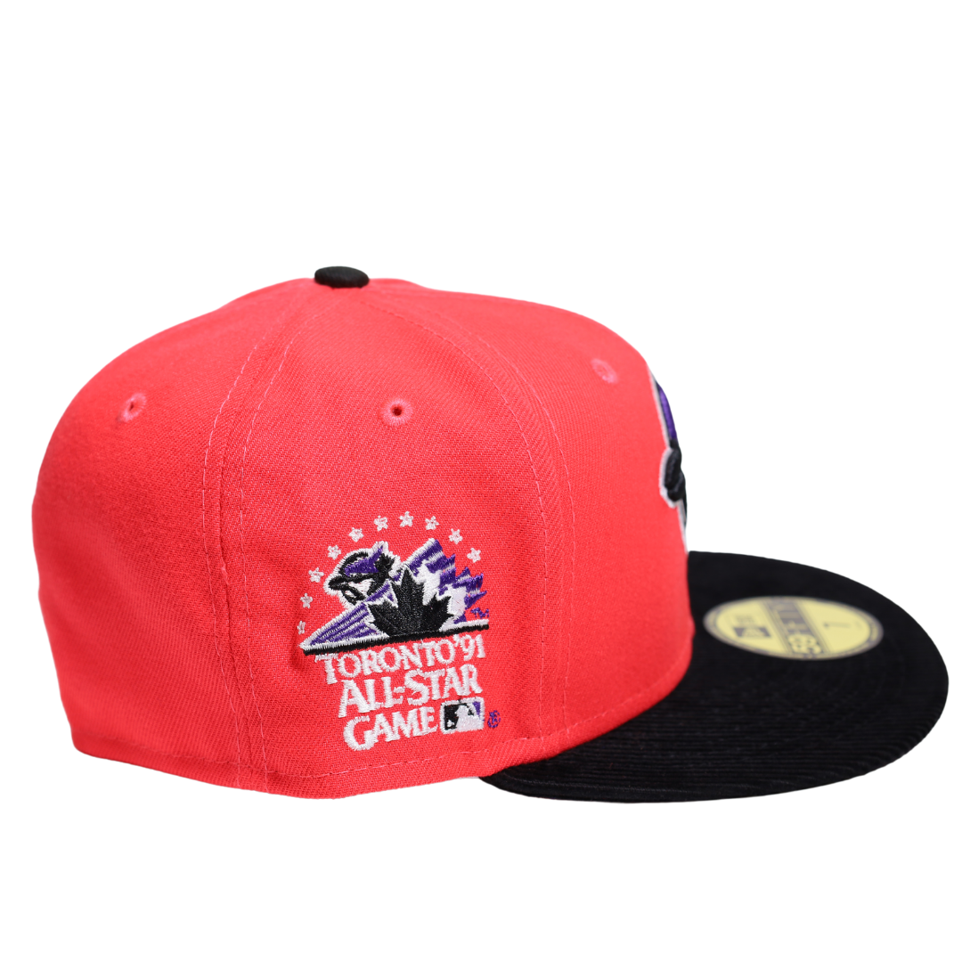 This New Era Toronto Blue Jays 1991 All-Star Game 59FIFTY Fitted Hat has a six panel structured high crown and embroidered eyelets with a fabric squatchee button. The fitted cap has a flat bill with a sweatband. The front panel features the Toronto Blue Jays logo embroidery.