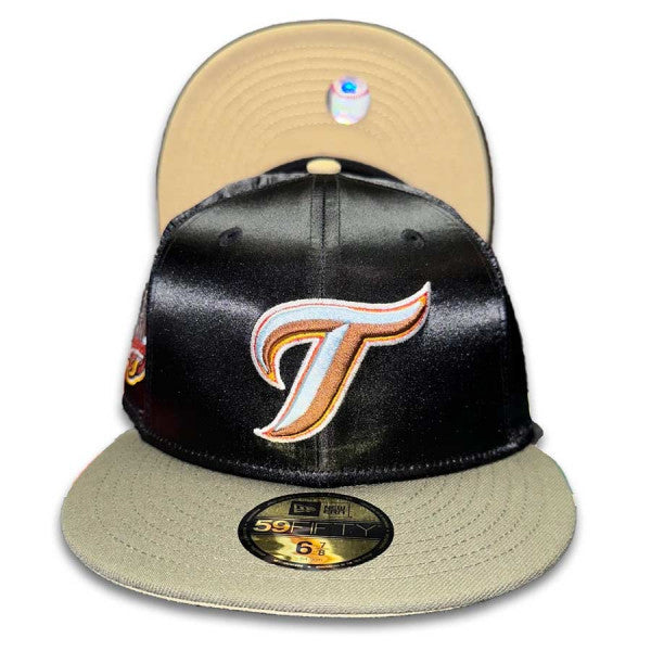This Toronto Blue Jays 59FIFTY fitted hat was released by Pro Image Sports. The fitted has a black satin six panel structured high crown, embroidered eyelets and a peach fabric squatchee button. The fitted cap also has a grey flat bill with a peach undervisor. The front panel features the Toronto Blue Jays logo embroidery and a side patch embroidery on the right panel. The left panel of the fitted displays the New Era logo and the official MLB Batterman logo embroidery on the rear crown.