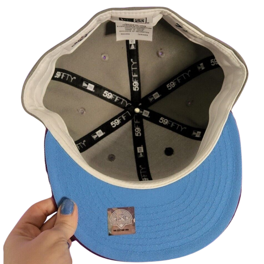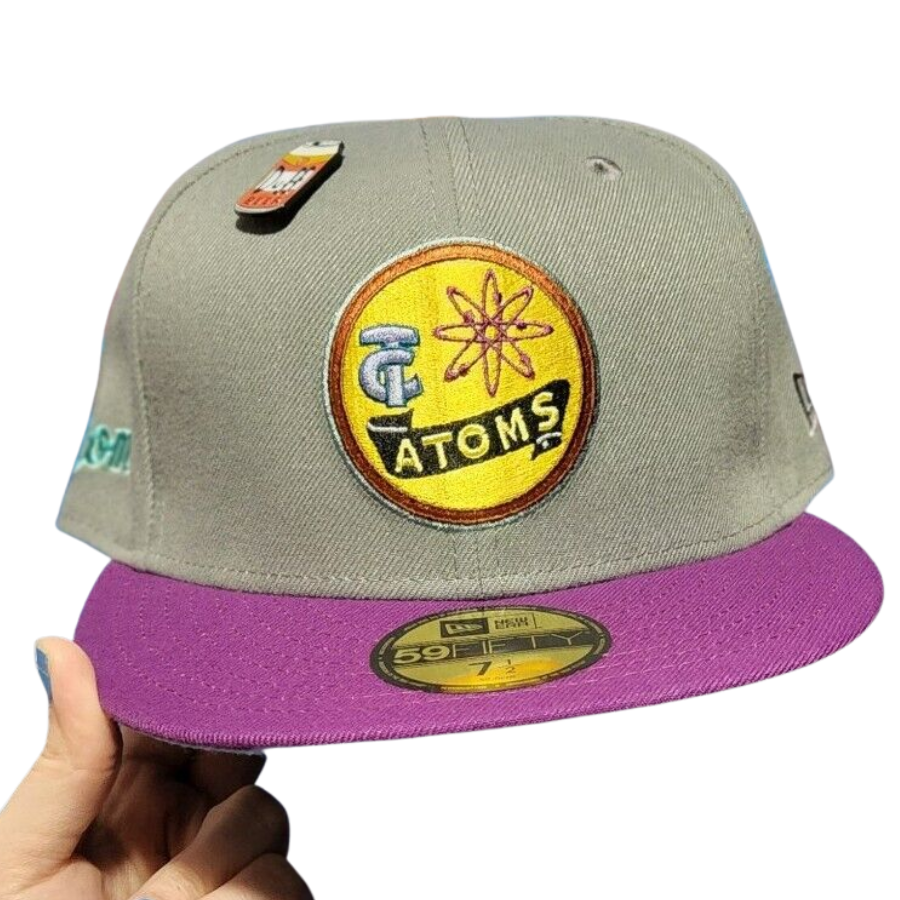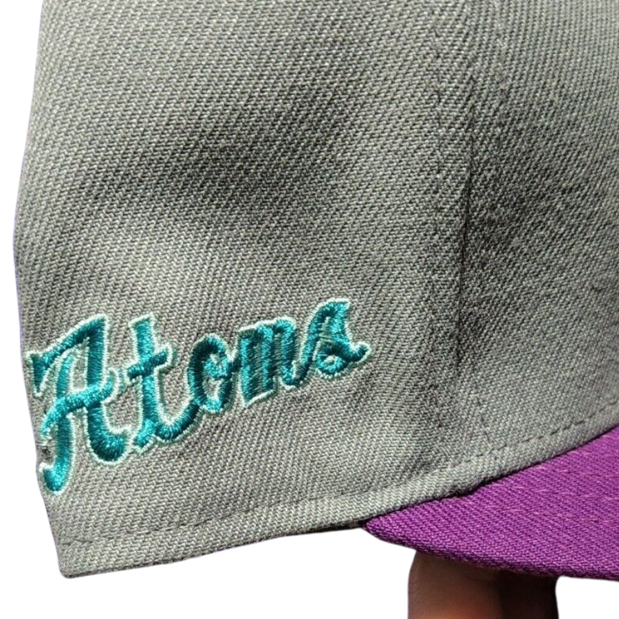 This New Era Tri-City Atoms "The Simpsons" Inspired 59FIFTY Fitted Hat is a My Fitteds exclusive. The fitted features a grey six panel structured high crown and eyelets with an orange fabric squatchee button and purple flat bill. The undervisor of the fitted is icy blue with a white sweatband. The front panel features the Tri-City Atoms logo embroidery and a side patch embroidered on the right panel.