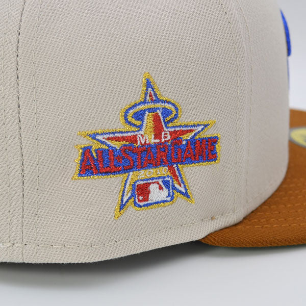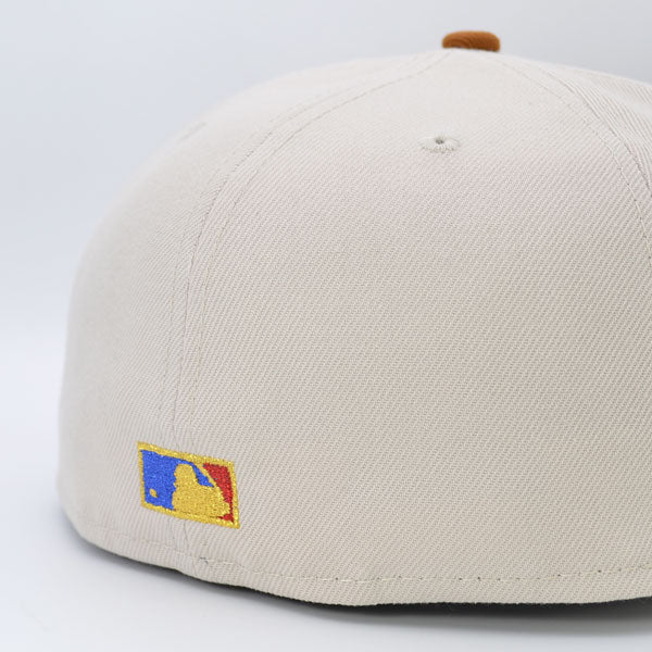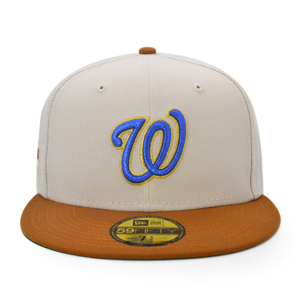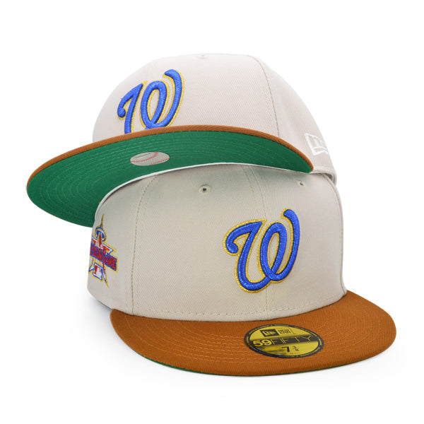 This Washington Nationals 59FIFTY fitted hat was released by Hat Dreams. The fitted has a stone six panel structured high crown and embroidered eyelets with a toasted peanut fabric squatchee button. The fitted cap also has a toasted peanut flat bill with a green undervisor. The front panel features the Washington Nationals logo embroidery and a 2010 All-Star Game side patch embroidery on the right panel. The left panel of the fitted displays the New Era logo and the official MLB logo embroidery on the rear crown.