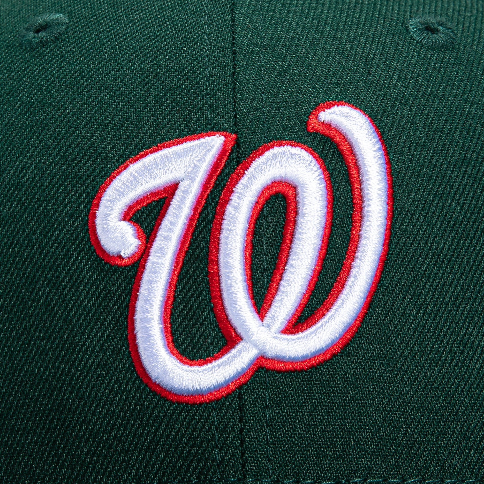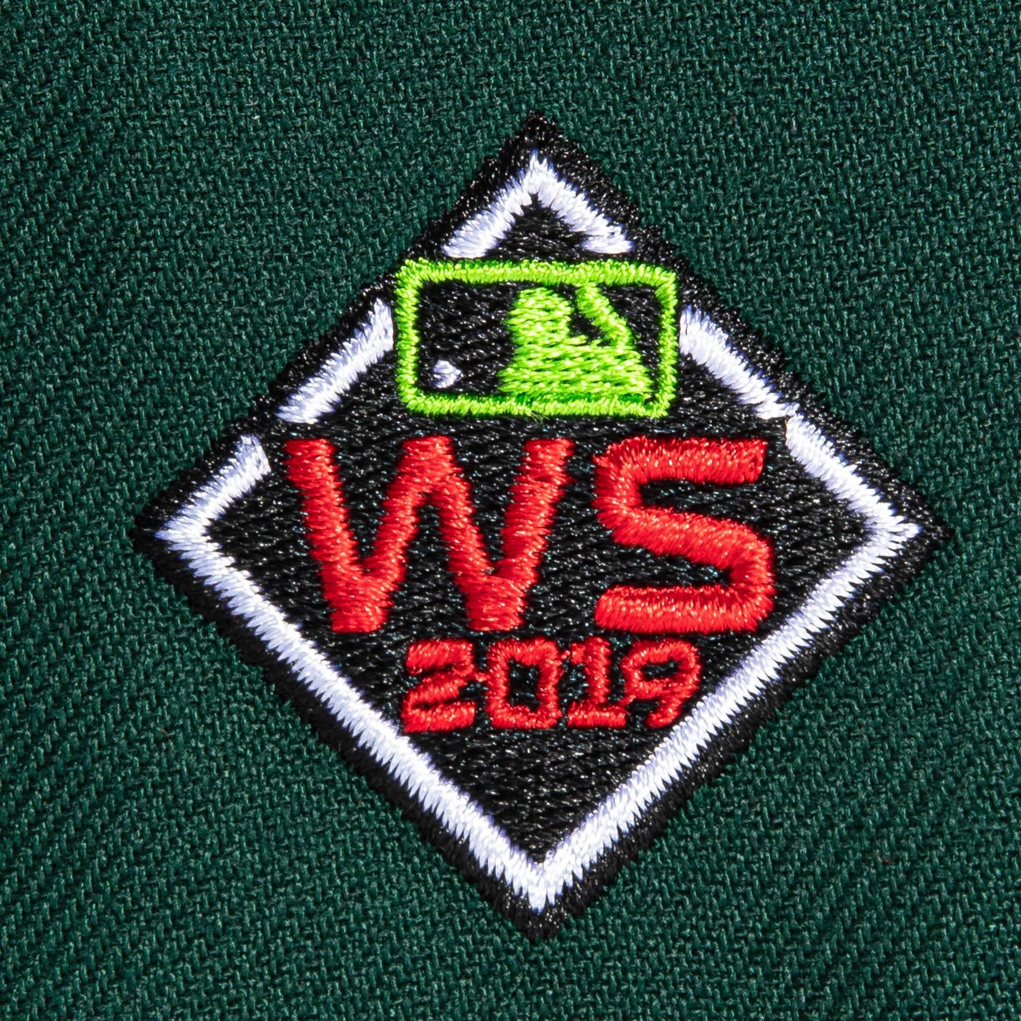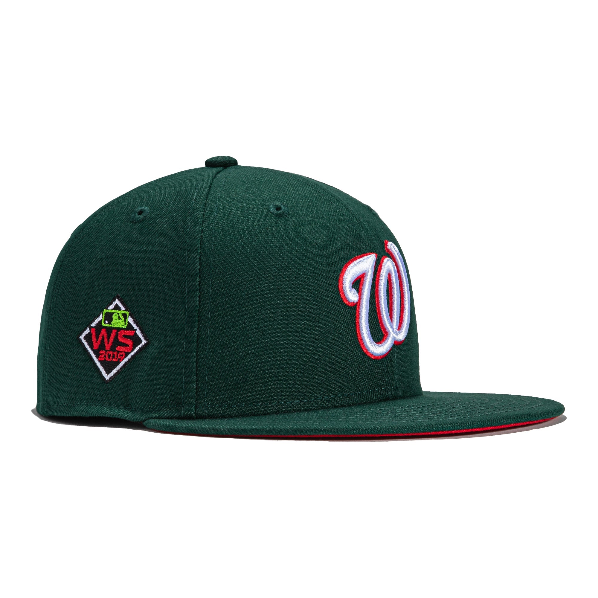 This New Era Washington Nationals 2019 World Series 'Watermelon' 59FIFTY Fitted Hat was originally released by Hat Club. The fitted has a dark green six panel structured high crown, embroidered eyelets and fabric squatchee button. The flat bill of the fitted cap is also dark green with a red bottom undervisor. The front panel features the Washington Nationals logo embroidery and a side patch embroidered on the right panel. The left panel of the fitted displays the New Era logo and the official MLB insignia embroidered on the rear crown. The fitted hat colorway is inspired by the colors of a watermelon.