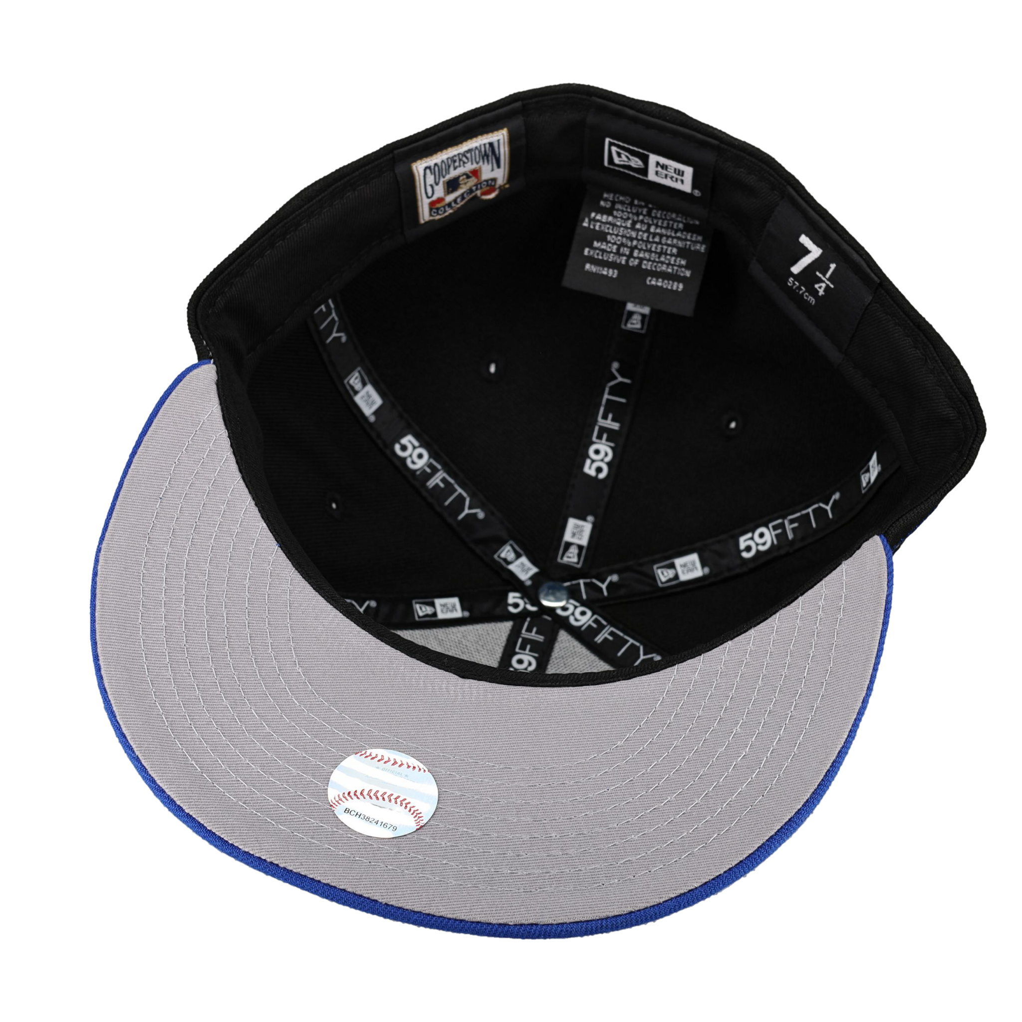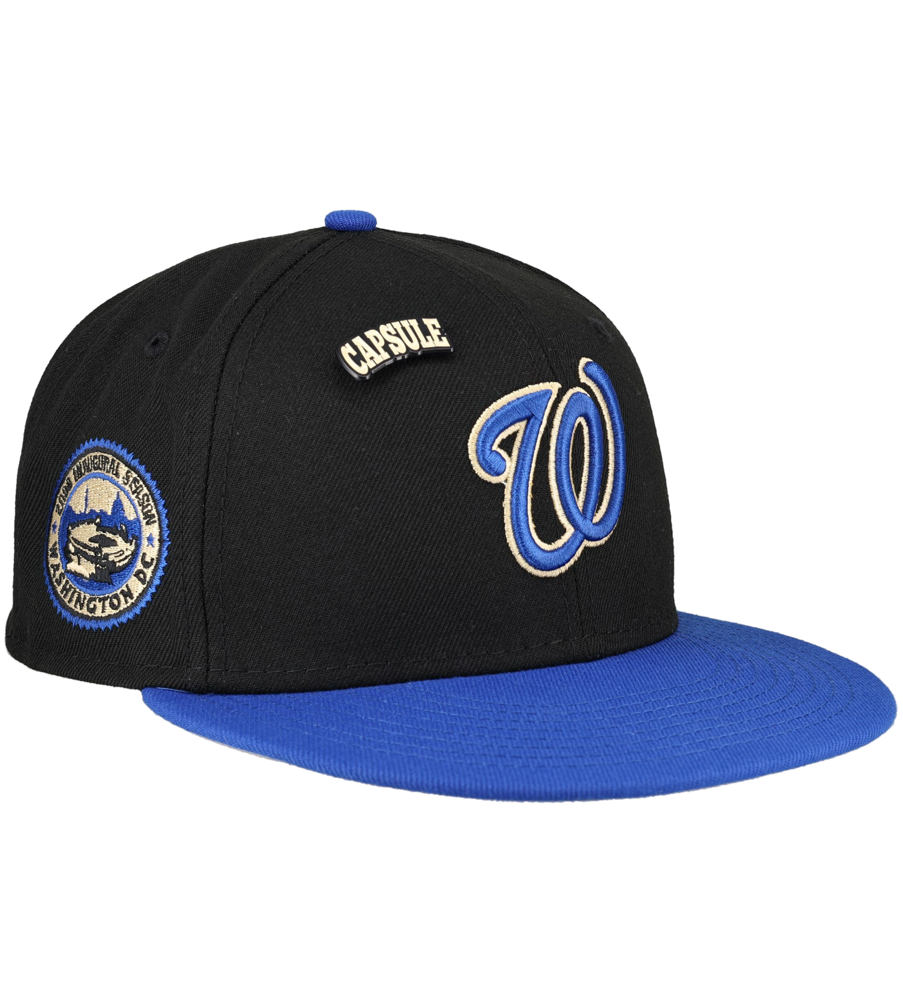 This Washington Nationals 59FIFTY fitted hat was released by Capsule Hats. The fitted has a black six panel structured high crown and embroidered eyelets with a blue fabric squatchee button. The fitted cap also has a blue flat bill with a grey undervisor and black sweatband. The front panel features the Washington Nationals logo embroidery and an Inaugural Season side patch on the right panel. The left panel of the fitted displays the New Era logo and the official MLB Batterman embroidery on the rear crown.
