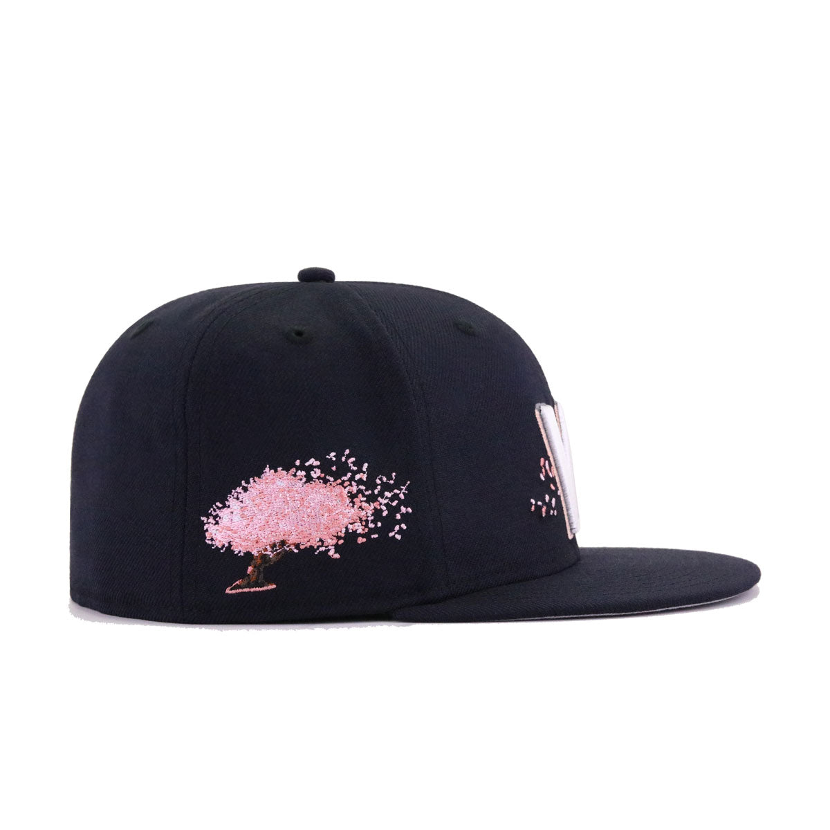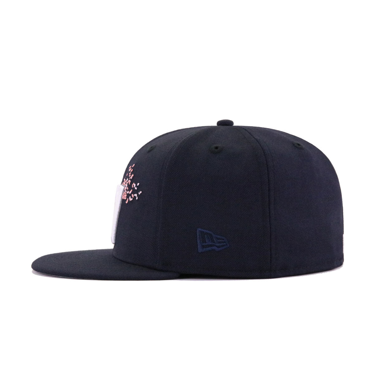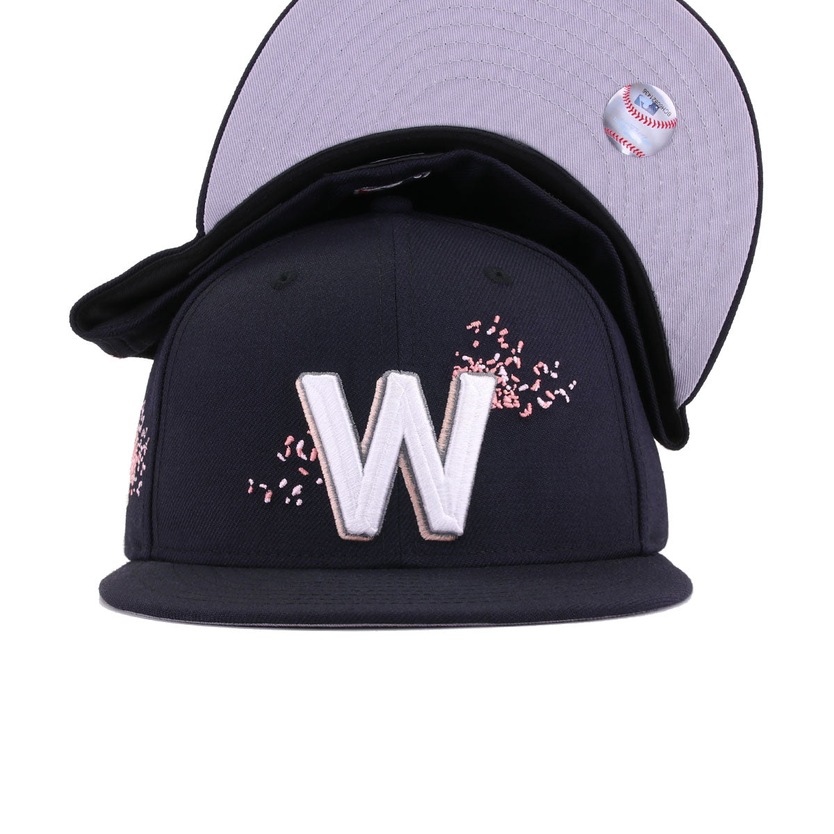 This New Era Washington Nationals Navy City Connect 59FIFTY Fitted Hat was released by Hat Heaven. The fitted has a navy blue six panel structured high crown and embroidered eyelets with a navy blue fabric squatchee button. The flat bill of the fitted cap is also navy blue with a grey undervisor and black sweatband. The front panel features the Washington Nationals logo embroidered in white and pink stitching and the New Era "Fly Your Own Flag" logo on the left panel.