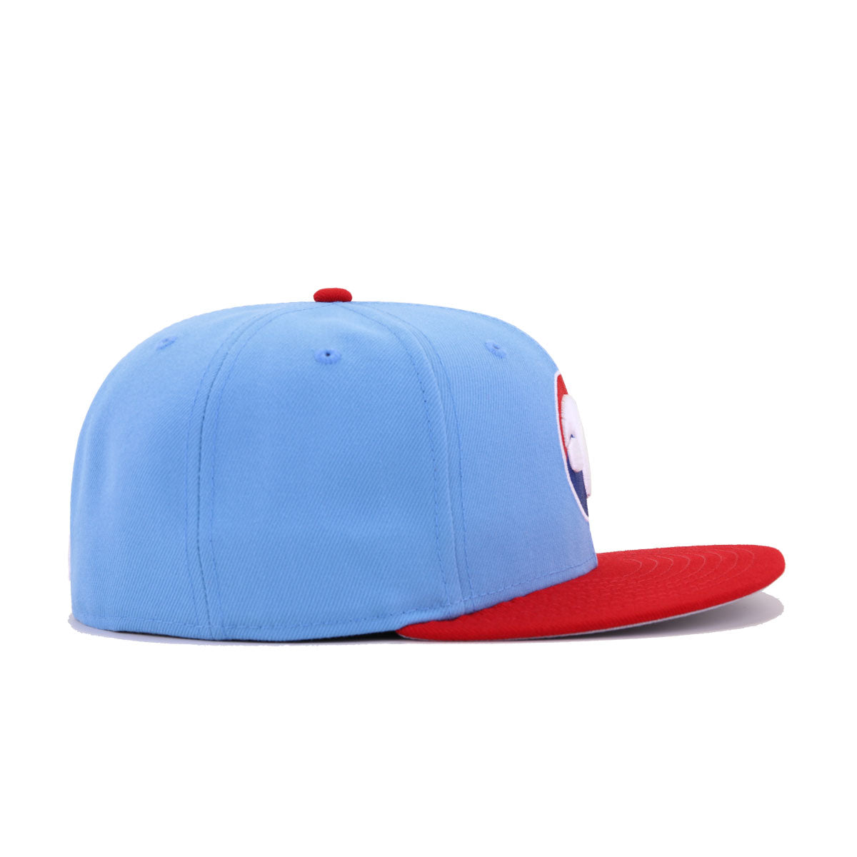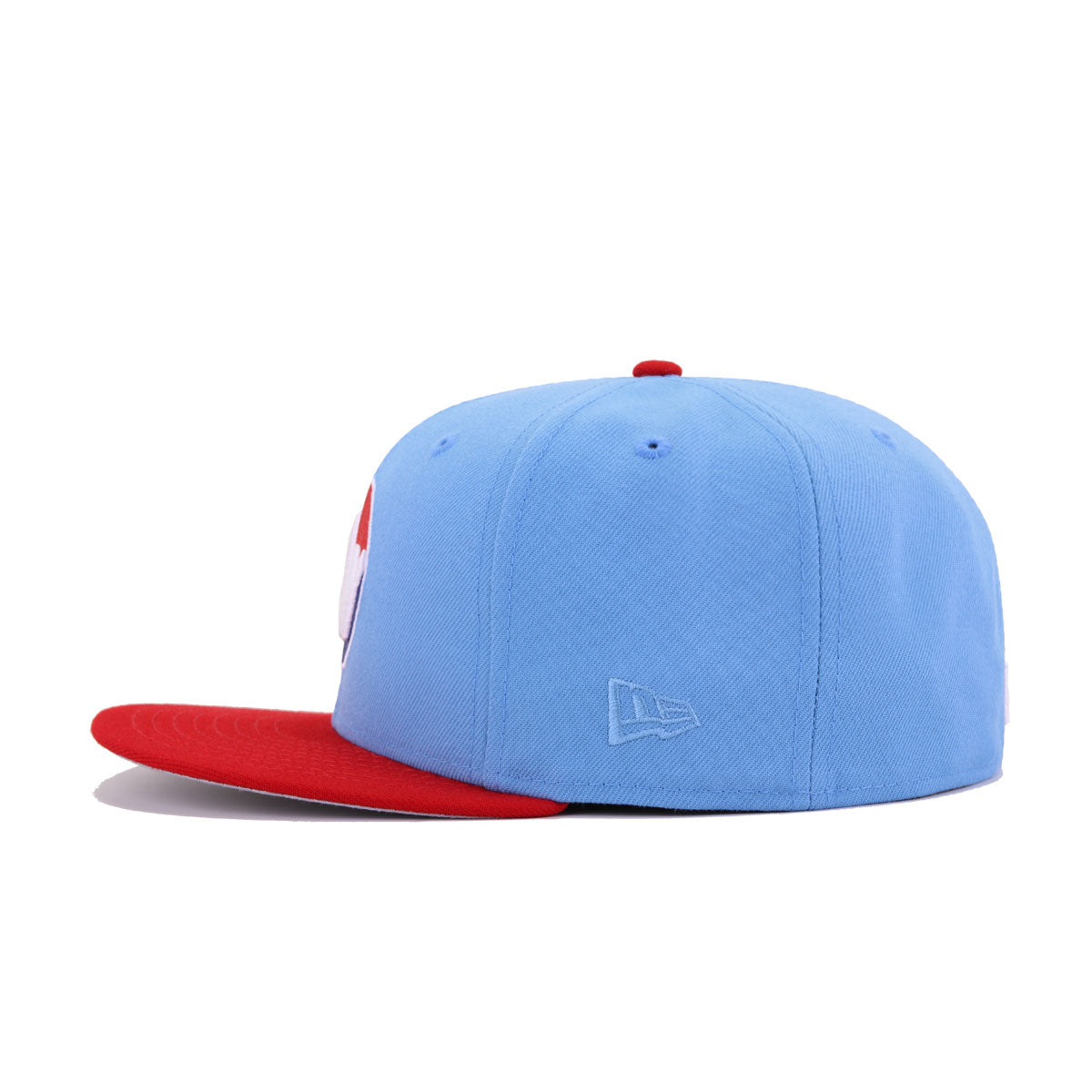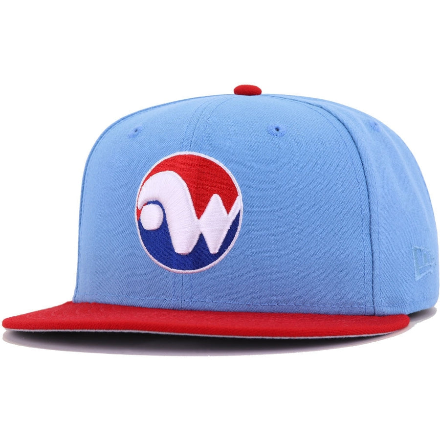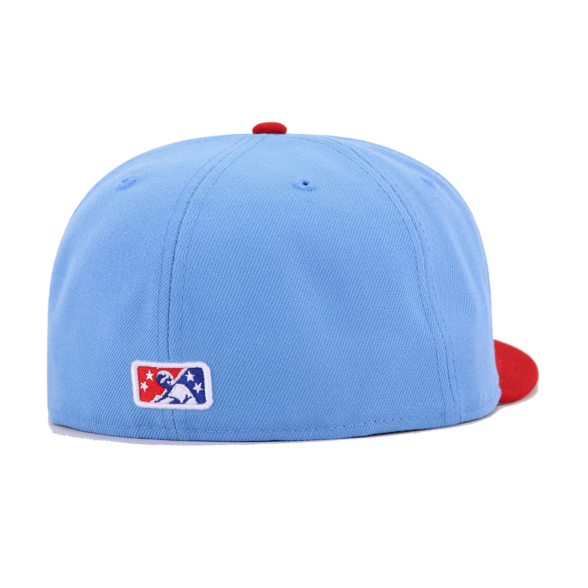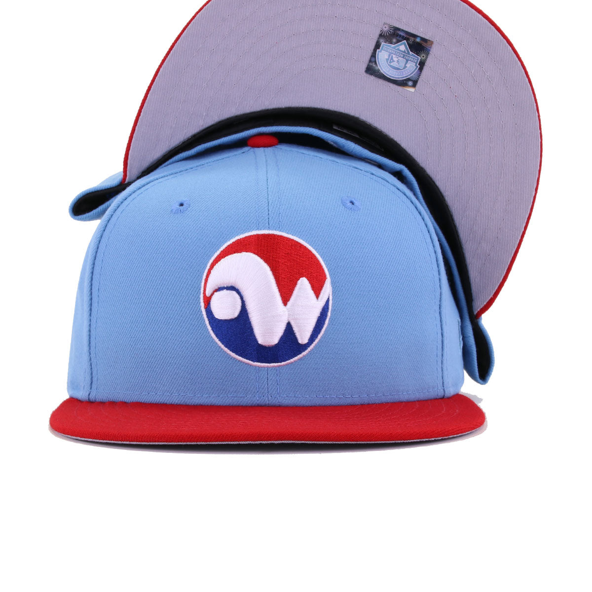 This New Era Winnipeg Whips Sky Blue Scarlet 59FIFTY Fitted Hat has a sky blue six panel structured high crown and embroidered eyelets with a sky blue fabric squatchee button. The fitted cap also has a sky blue flat bill. The front panel features the Winnipeg Whips logo embroidery. The left panel of the fitted displays the New Era logo and the official MiLB logo embroidery on the rear crown.