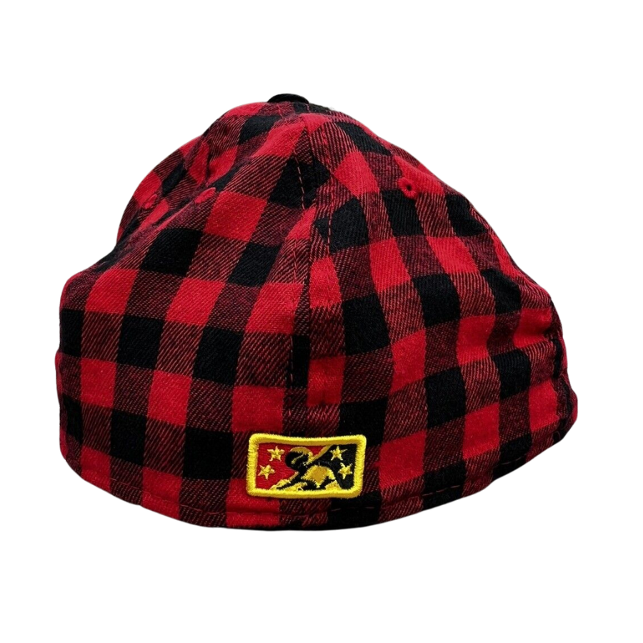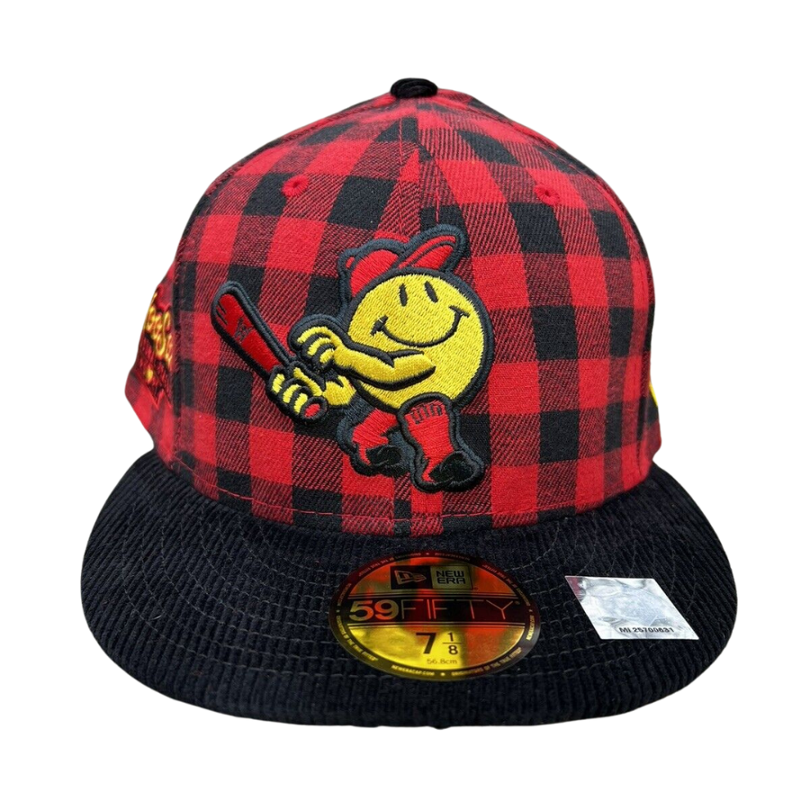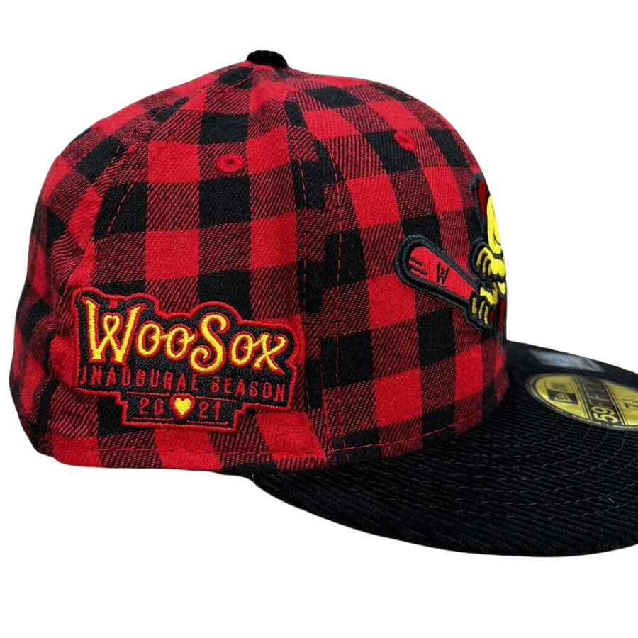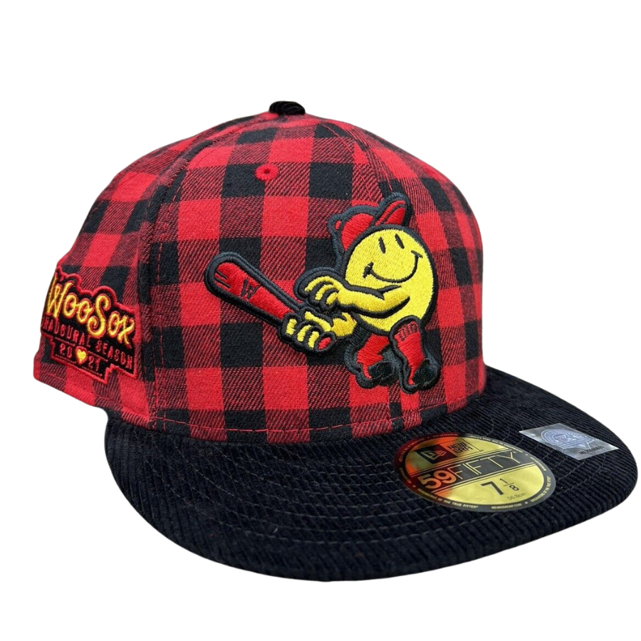 This New Era Worcester Red Sox Lumberjack Mick Foley 59FIFTY Fitted Hat was originally released by My Fitteds. The fitted has a black and red lumerbjack six panel structured high crown, red embroidered eyelets with a black fabric squatchee button. The fitted cap also has a black corduroy flat bill with a leopard undervisor and black sweatband. The front panel features the Worcester Red Sox logo embroidery and a 2021 Inaugural Season side patch embroidery on the right panel. The left panel of the fitted displays the New Era logo and the official MiLB Batterman logo embroidery on the rear crown.