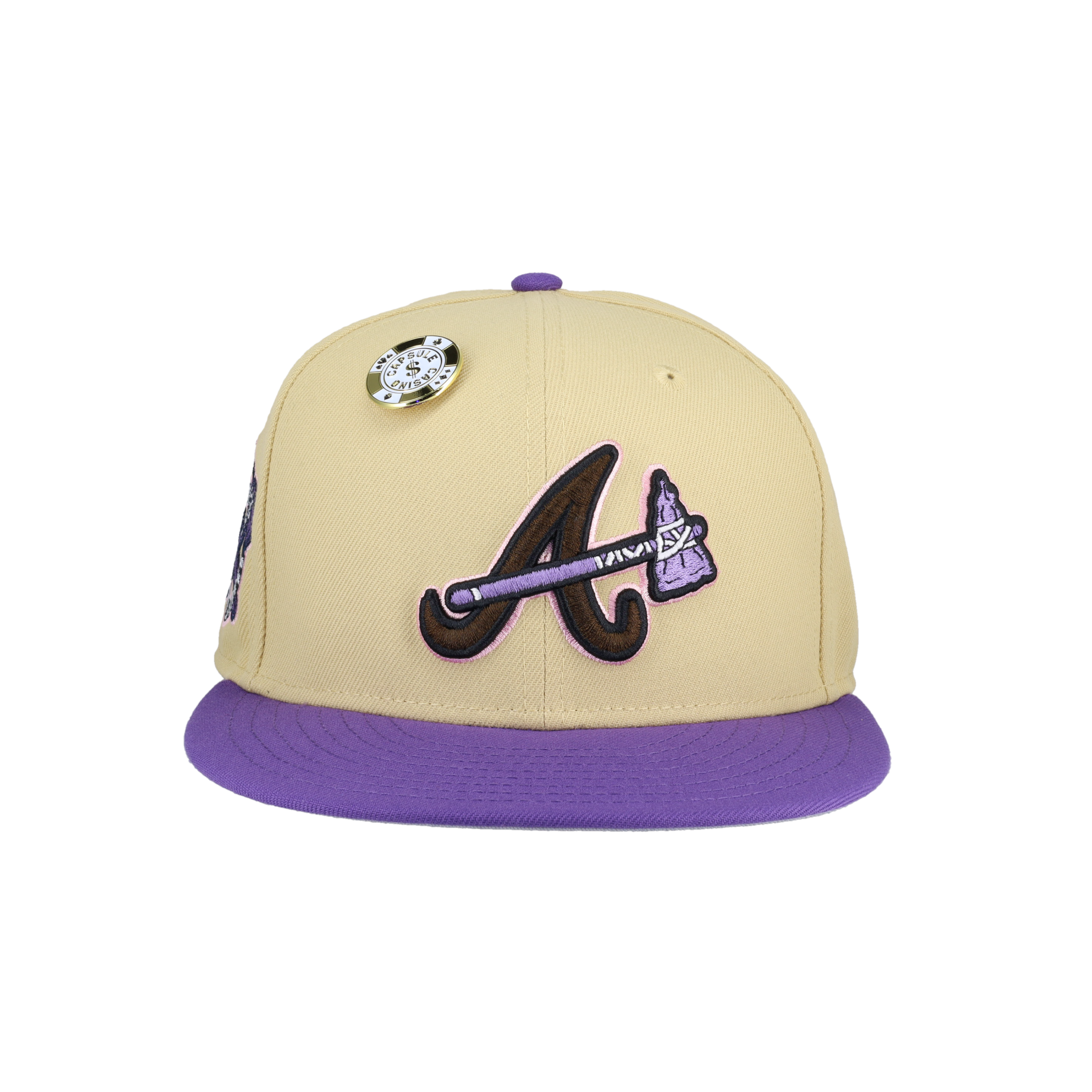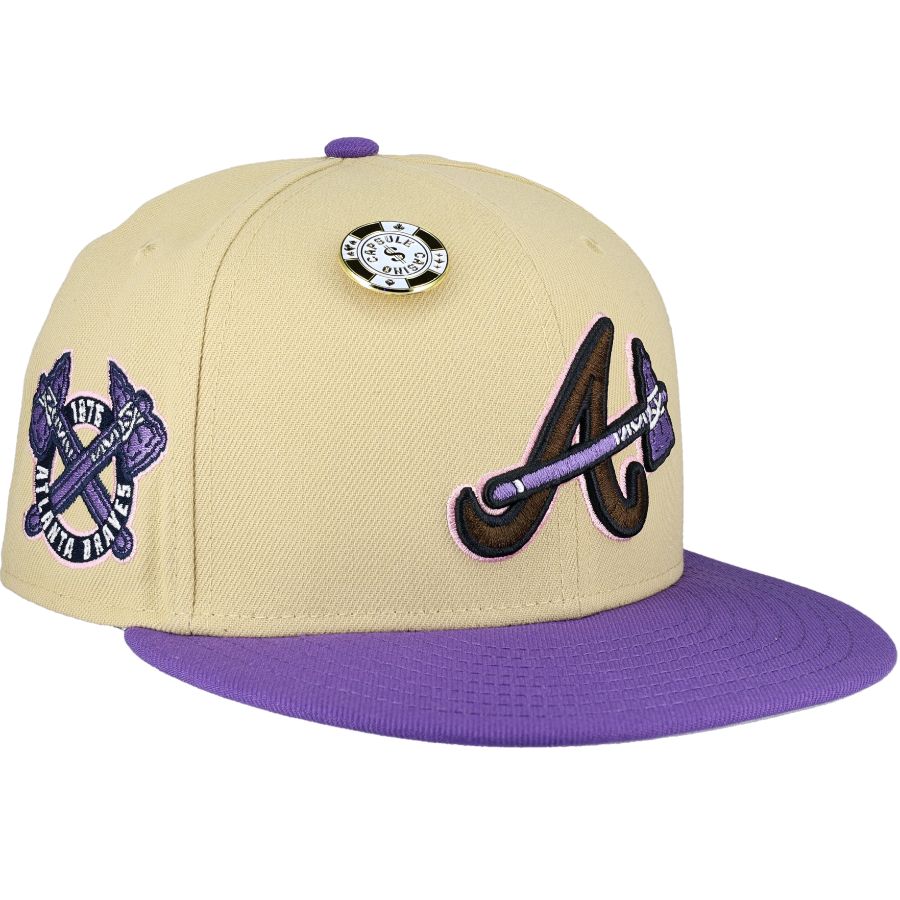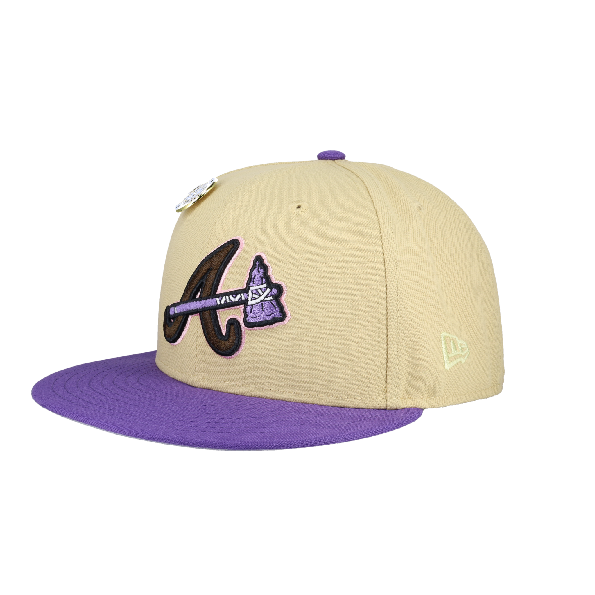This New Era x Capsule Atlanta Braves Vegas Gold Collection 1876 Tomahawk Fitted Hat was released by Capsule Hats. The fitted has a vegas gold six panel structured high crown and eyelets with a purple squatchee button. The flat bill of the fitted cap is purple with a grey undervisor. The front panel features the Atlanta Braves logo embroidery and a side patch embroidery on the right panel. The left panel of the fitted displays the New Era logo and the official MLB logo on the rear-crown .
