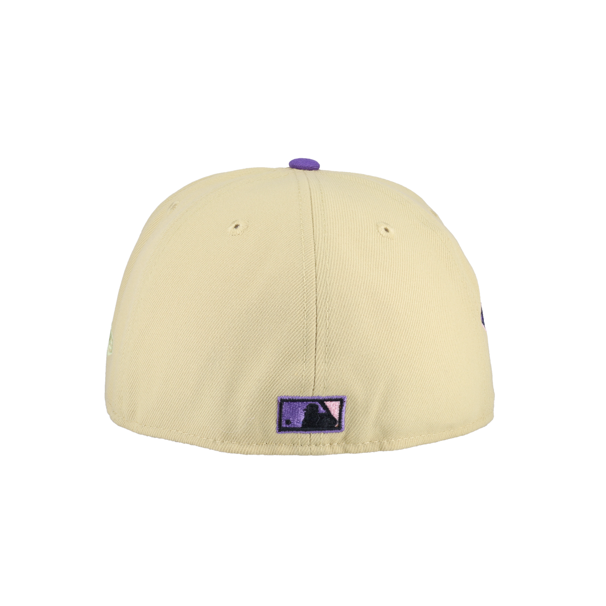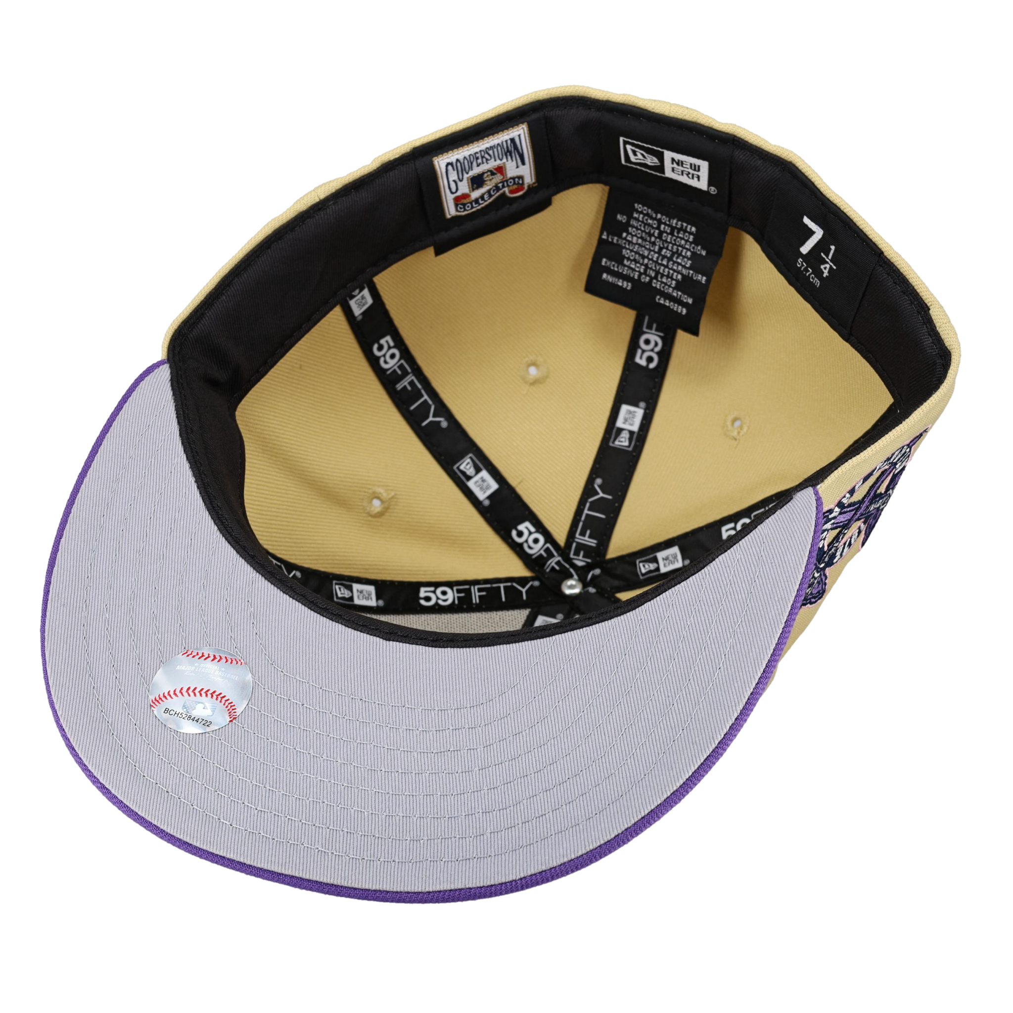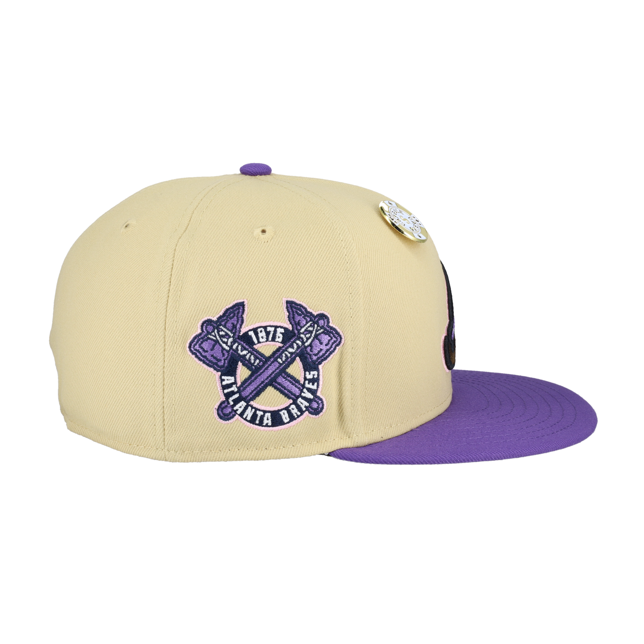This New Era x Capsule Atlanta Braves Vegas Gold Collection 1876 Tomahawk Fitted Hat was released by Capsule Hats. The fitted has a vegas gold six panel structured high crown and eyelets with a purple squatchee button. The flat bill of the fitted cap is purple with a grey undervisor. The front panel features the Atlanta Braves logo embroidery and a side patch embroidery on the right panel. The left panel of the fitted displays the New Era logo and the official MLB logo on the rear-crown .